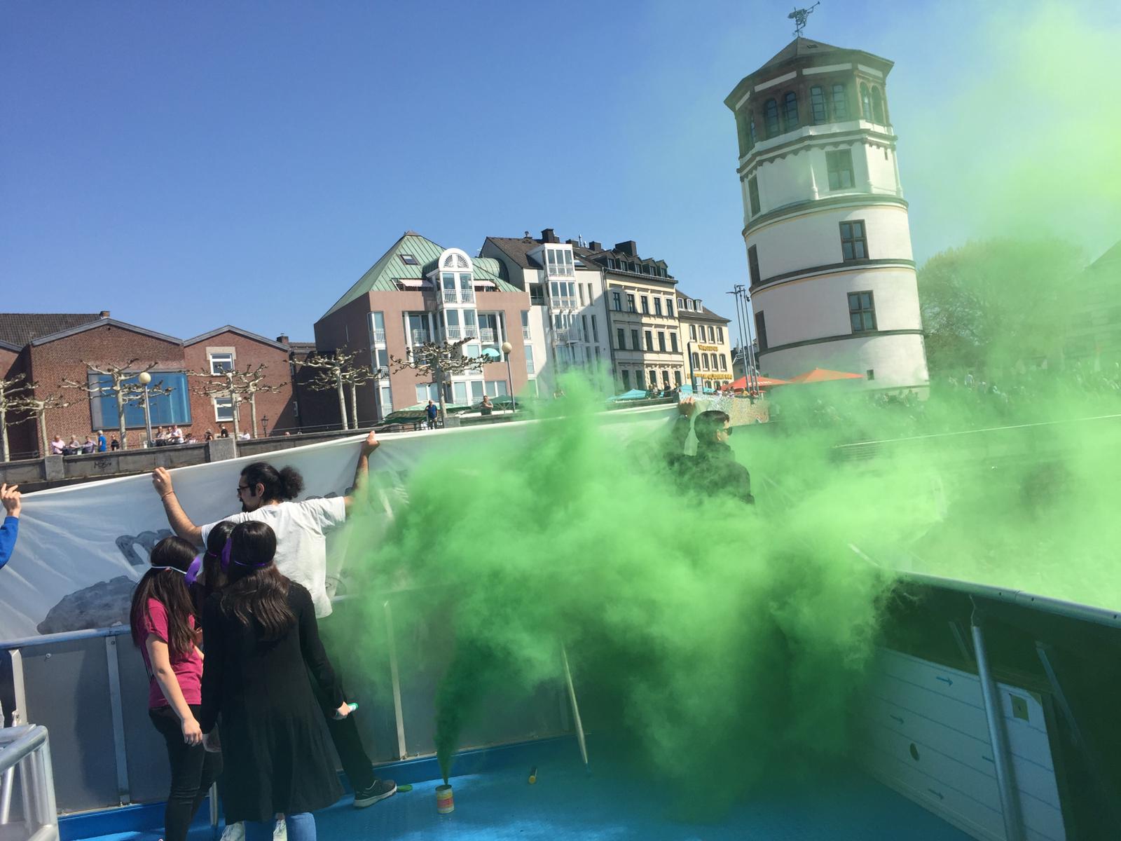 Vapurun en üst katına çıkan gençler, üzerinde Almanca “7000 Kürt Açlık Grevinde: Öcalan’a Özgürlük” yazan ve Halklar Önderi’nin siluetinin resmedildiği bir pankart açtı. Genç kadınlar lila renkli maskelerle eylemde yer aldılar. Bir vapur çalışanı eylemcilerin yanına gelerek eylemi sonlandırmalarını istedikten sonra pankartı gençlerin ellerinden almaya çalıştı ve polisi çağırmakla tehdit etti. Gençler tehditlere kulak asmadan eylemlerine devam ettiler. Yaklaşık bir saat boyunca devam eden eylemde gençler renkli dumanlarla nehir kıyısında bulunan insanların da dikkatini bu eyleme çekti. Eylem boyunca gençler “Bijî Serok APO”, Almanca “Öcalan’a özgürlük, Kürdistan’da barış”, “Tüm siyasi tutsaklara özgürlük” ve “Ses çıkarmayan onaylar” gibi sloganlar attılar. Almanca hazırladıkları bildirileri vapurdaki yolculara dağıtan gençler, eylem sırasında bu bildiriyi de okudular.