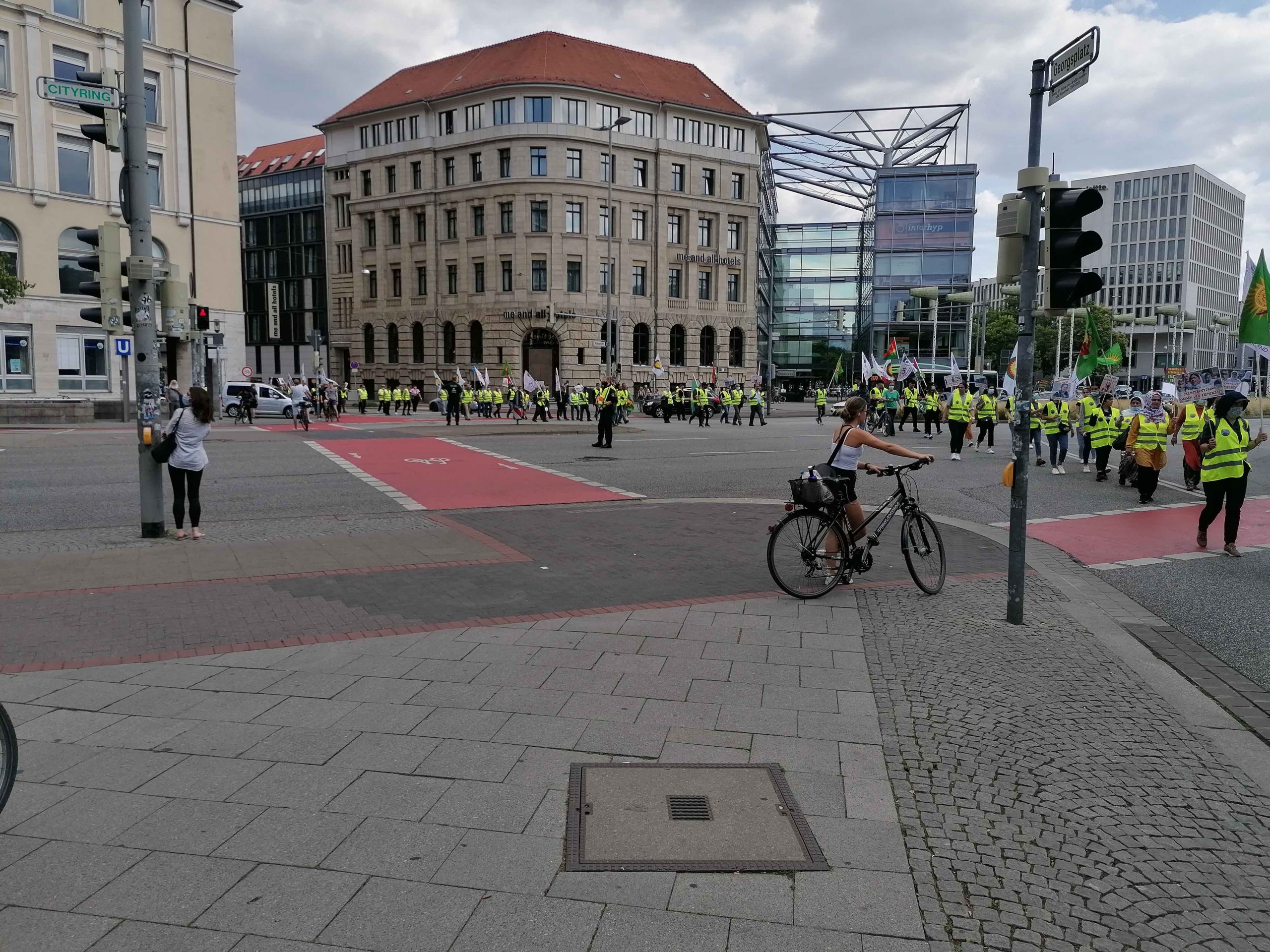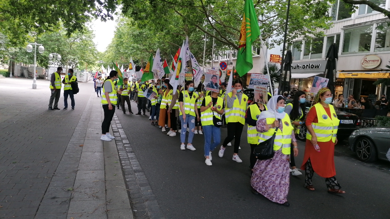 Öğle saatlerinde bir gencin polis provakasyonu ile darp edilip zorla gözaltına alınmasının ardından oturma eylemi ile provokasyonu protesto eden eylemciler, bir süre sonra yürüyüşlerine kaldıkları yerden devam ettiler. Yaklaşık 200 kişinin katıldığı yürüyüşte sık sık Almanca ve Kürtçe sloganlar ile Şengal’e statü talebi ve Türk-Alman işbirliği protesto edilirken, eylemciler saat 16’da Obernplatz alanına ulaştı.