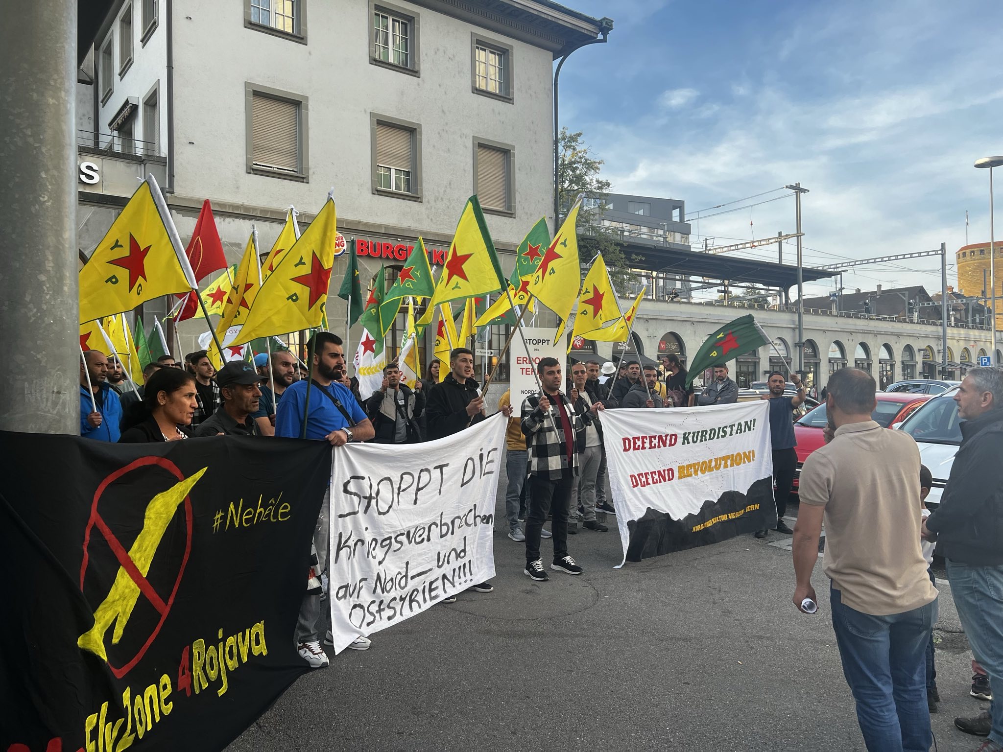 FRİBOURG – Eylem Ankara’da fedai eylem gerçekleştiren Şehit Erdal ve Şehit Rojhat şahsında tüm Kûrdistan şehitleri için bir dakikalık saygı duruşu ile başladı. Daha sonrasında Rojava marşı okuyan eylemciler Fransızca ve Kürtçe basın açıklaması gerçekleştirdiler yapılan basın açıklaması şu şekilde;