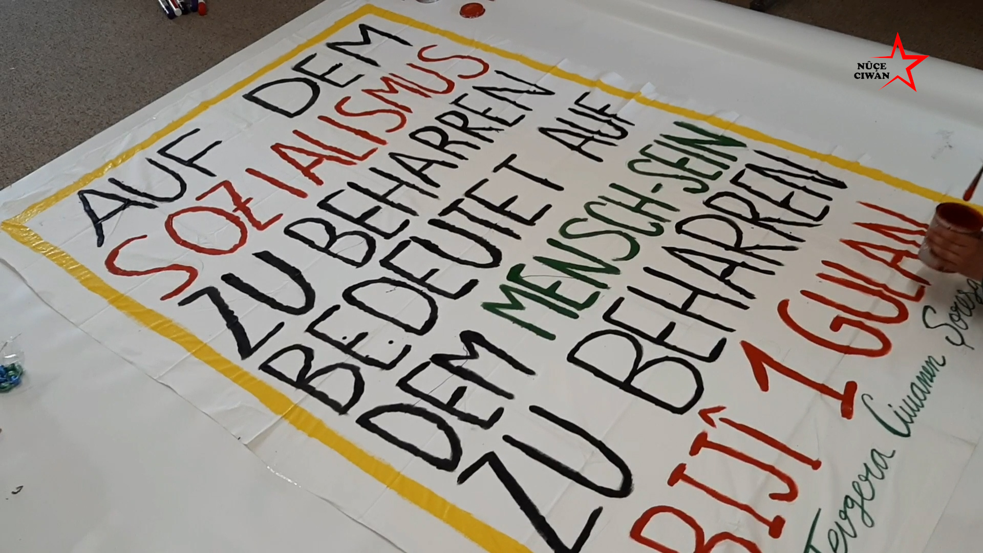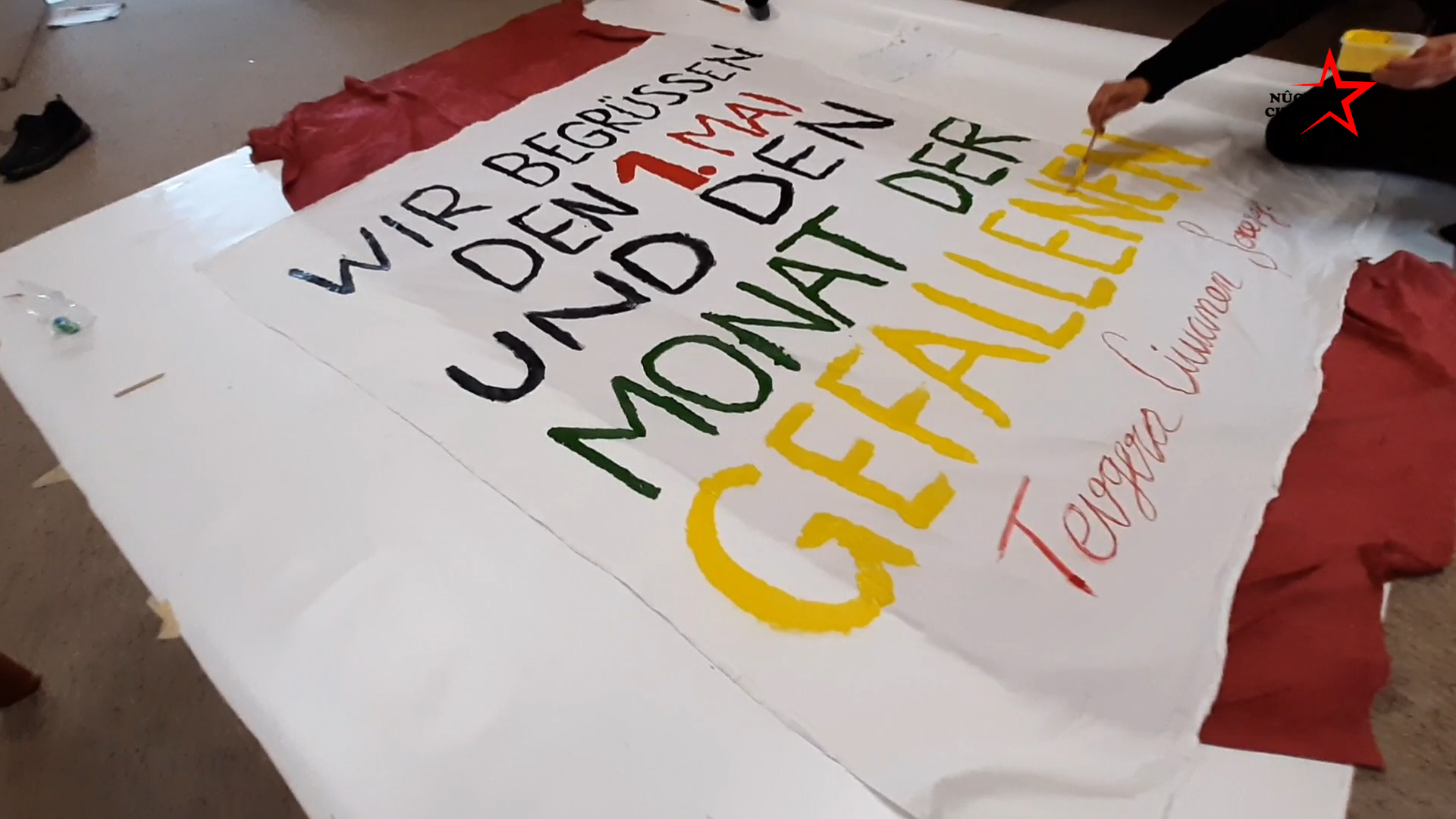 Gençler, Almanca hazırlanan pankartlardan birinde Halklar Önderi Abdullah Öcalan’ın sözü olan, “Sosyalizmde ısrar, insan olmakta ısrardır. -Yaşasın 1 Mayıs” yazarken, diğer pankartta ise “1 Mayıs ve Mayıs Ayı Şehitlerini Selamlıyoruz” yazdı.