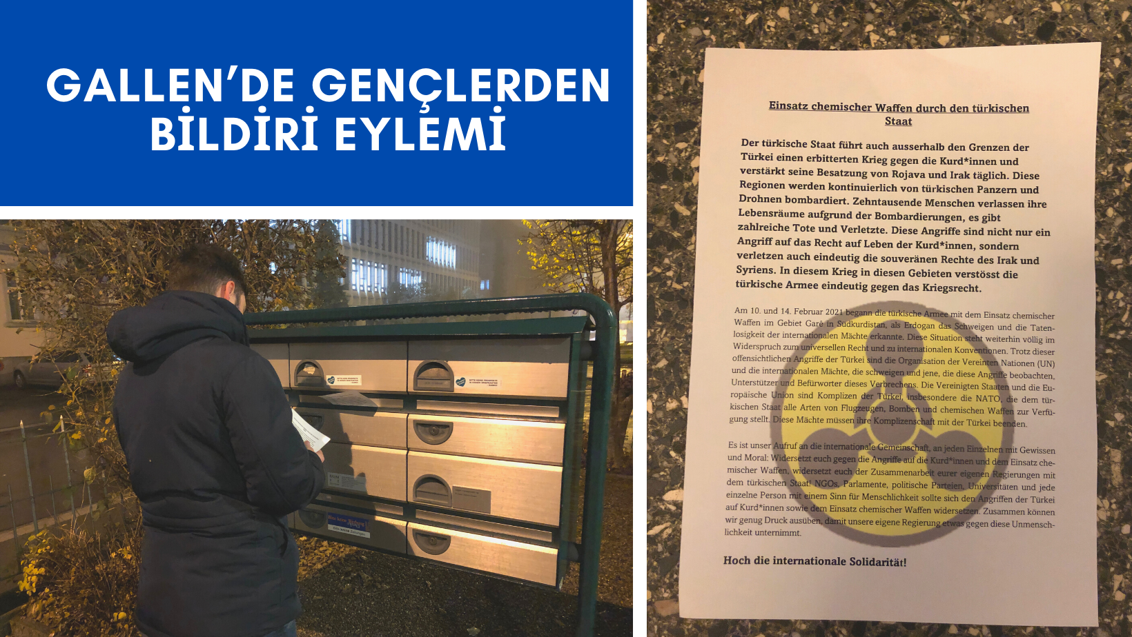 ST. GALLEN – İsviçre’nin St. Gallen kantonunda TCŞ (Tevgera Ciwanên Şoreşger) aktivistleri gün boyunca kimyasal silah kullanımına ilişkin şehrin en işlek meydanlarında bildiri eylemi gerçekleştirdiler.