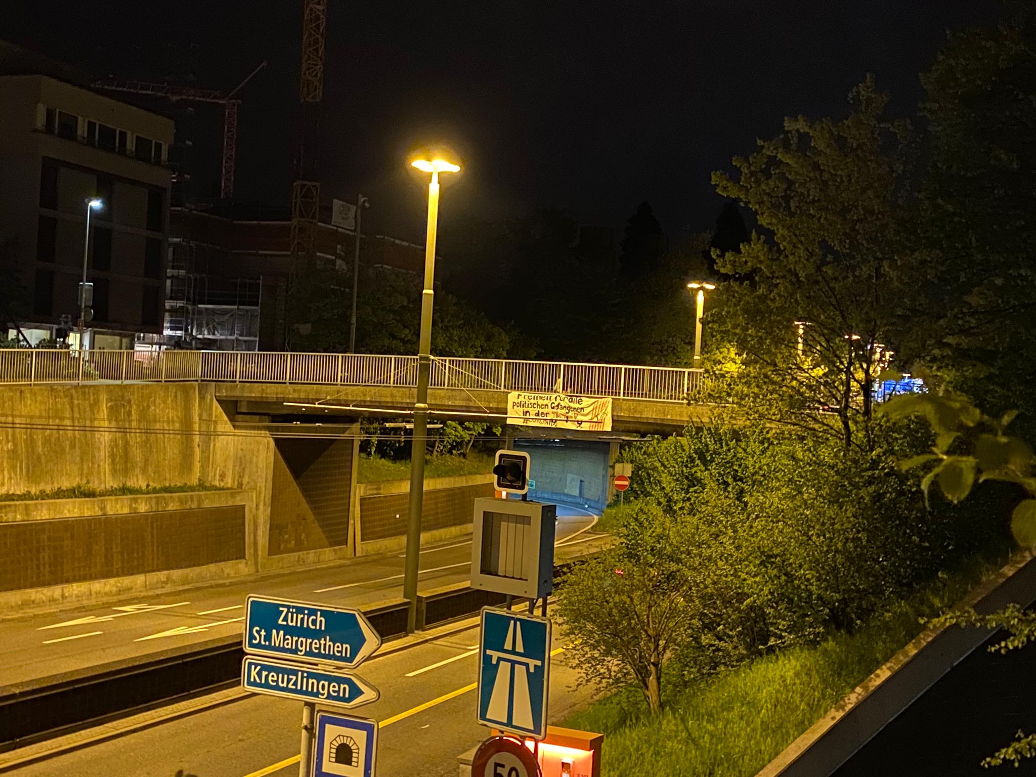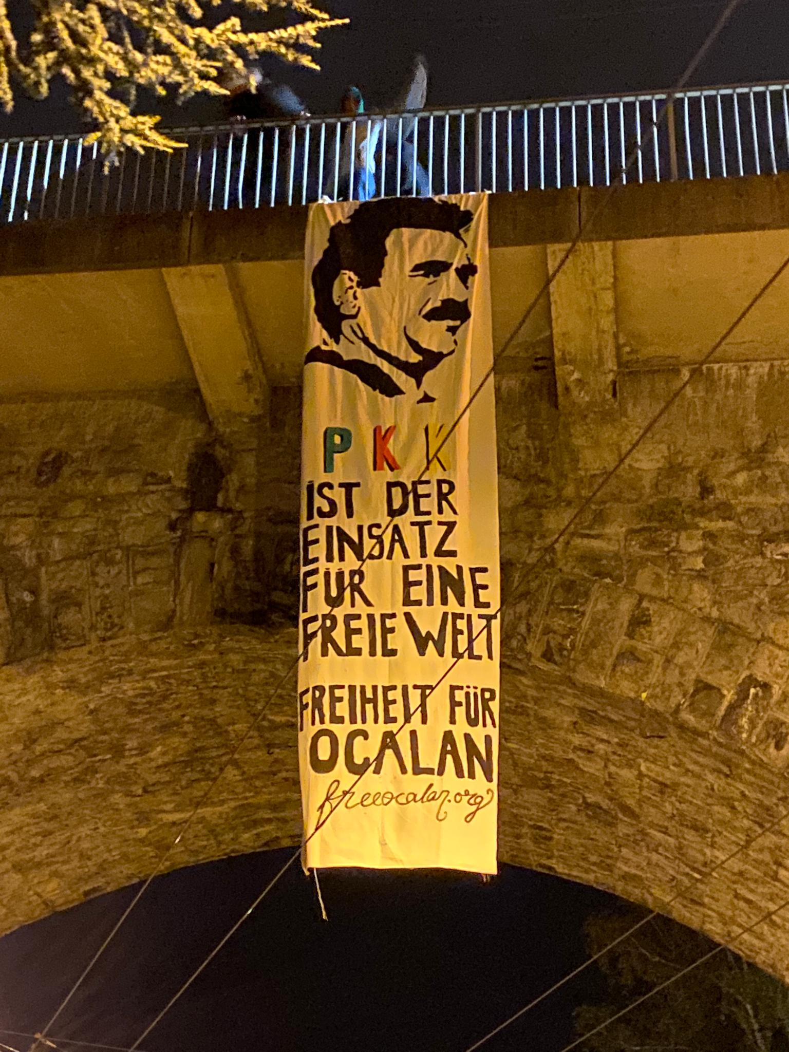 Dün gece saatlerinde şehir merkezindeki üst geçitlere üzerinde Almanca, “PKK özgür bir dünya için mücadele ediyor”, “Öcalan’a Özgürlük” ve “Türkiye’deki tüm politik tutsaklara özgürlük” yazan pankartlar astı.
