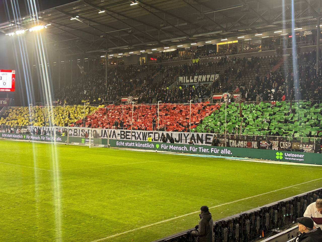 HAMBURG- St. Pauli – RB Leipzig Millerntor-Stadion Stadyumunda ki bu gün ki maçında taraftarlar, HTŞ ve Türk devleti çetelerinin Rojava ve Kuzey Doğu Suriye’ye yönelik saldırılarını protesto etmek amacıyla “Von Hamburg abis Rojava, Berxwedan Jiyane” pankart açtı.