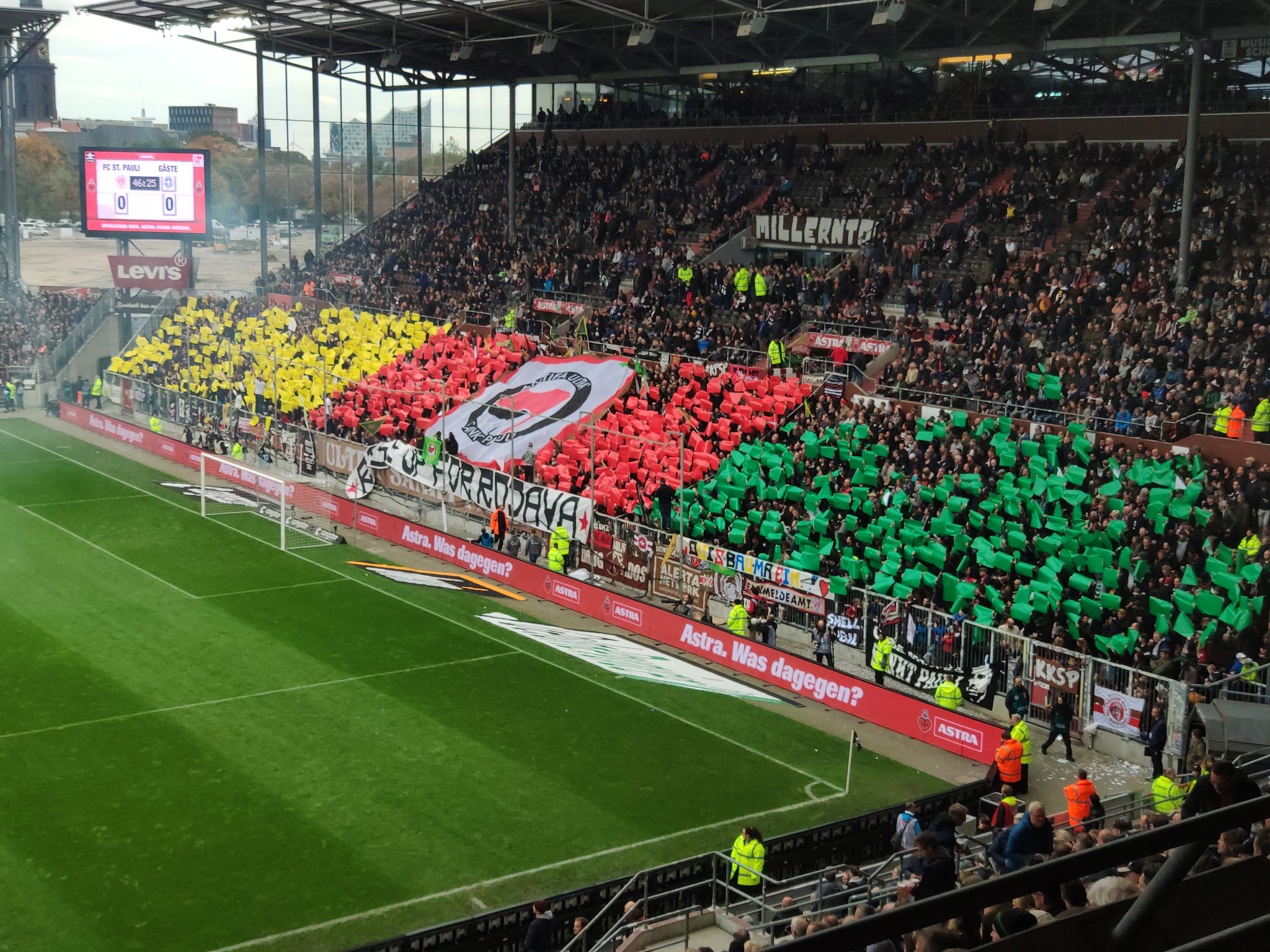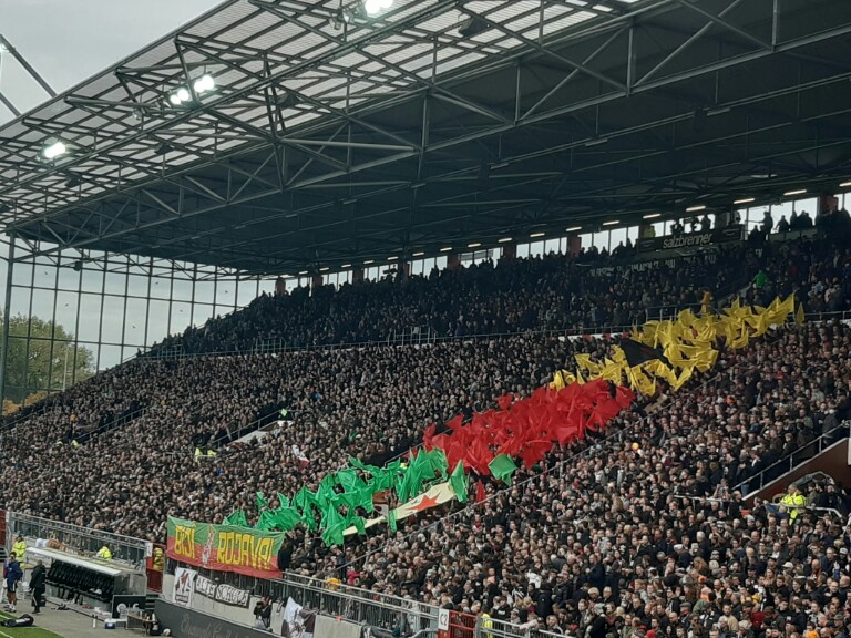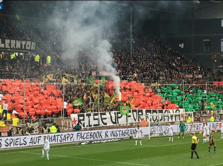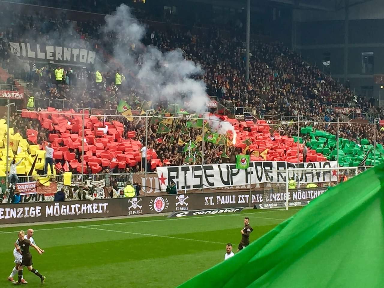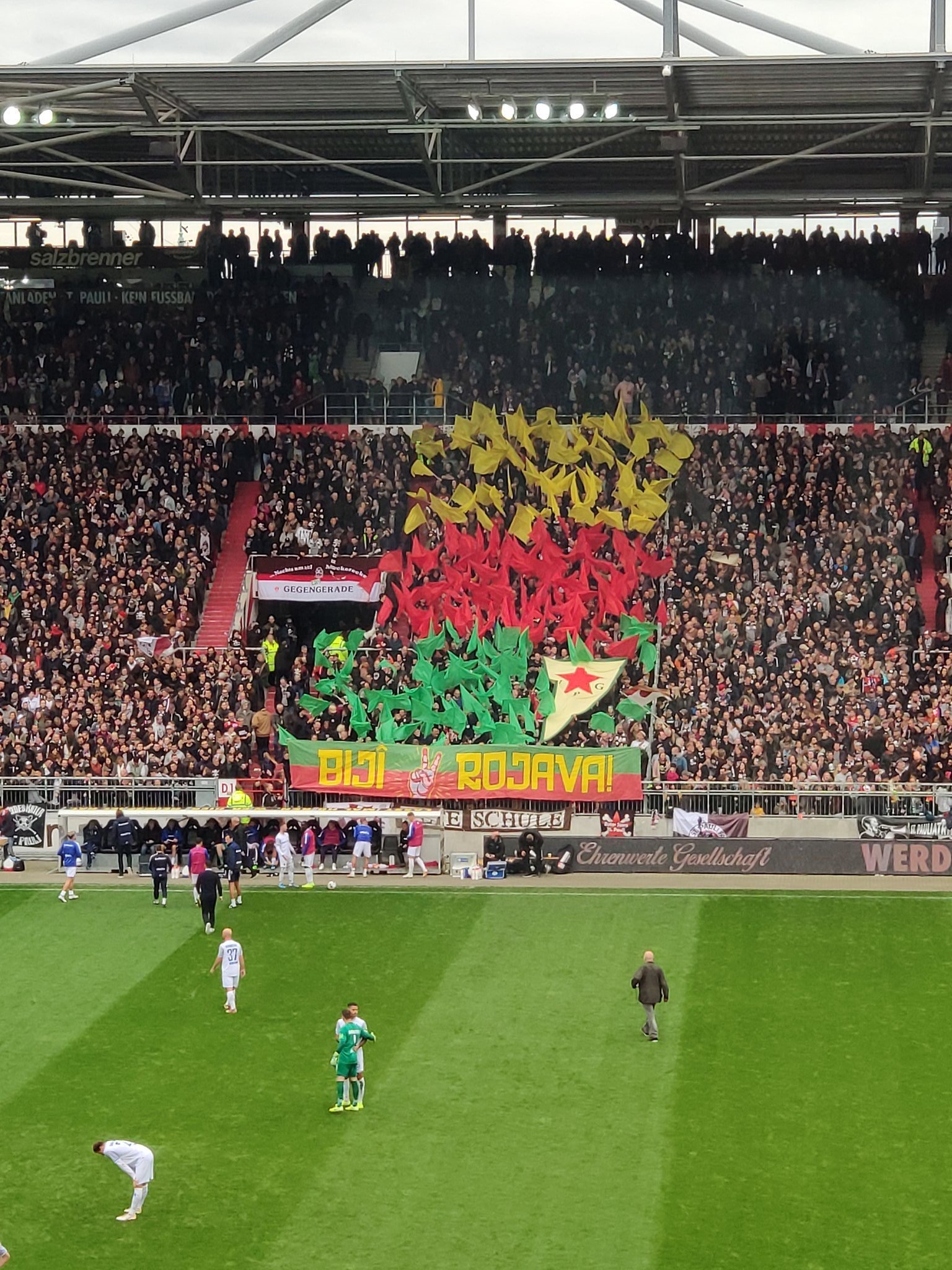 HABER MERKEZİ – Almanya 2. Lig müsabakalarından St. Pauli ve Darmstadt arasında saat 13’te başlayan maçta, St. Pauli taraftarları trübünlerde ‘ #RiseUp4Rojava ve Bijî Rojava ‘ pankartları açtı. Sarı-kırmızı ve yeşil renkleriyle stadı donatan taraftarlar, sık sık ‘Faşizme karşı omuz omuza’ sloganlarıyla Rojava direnişine destek oldu.