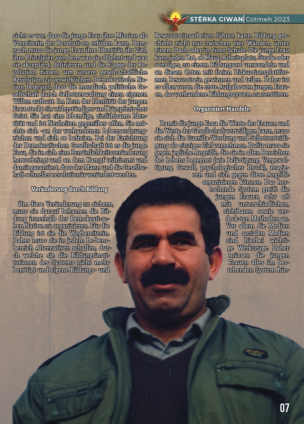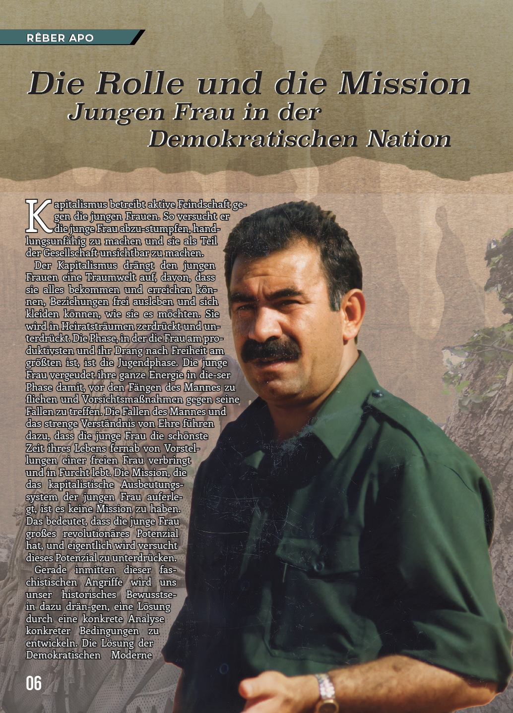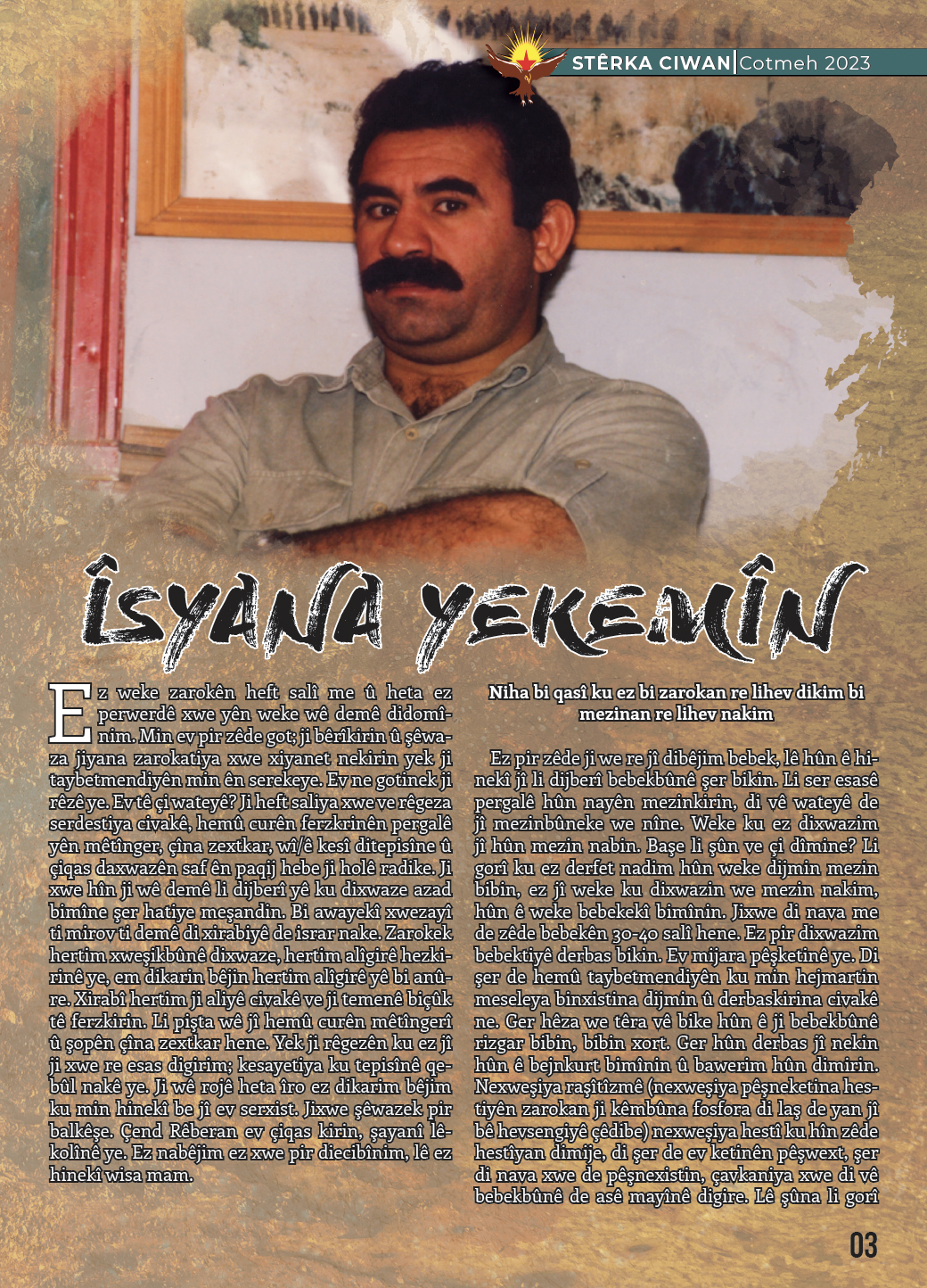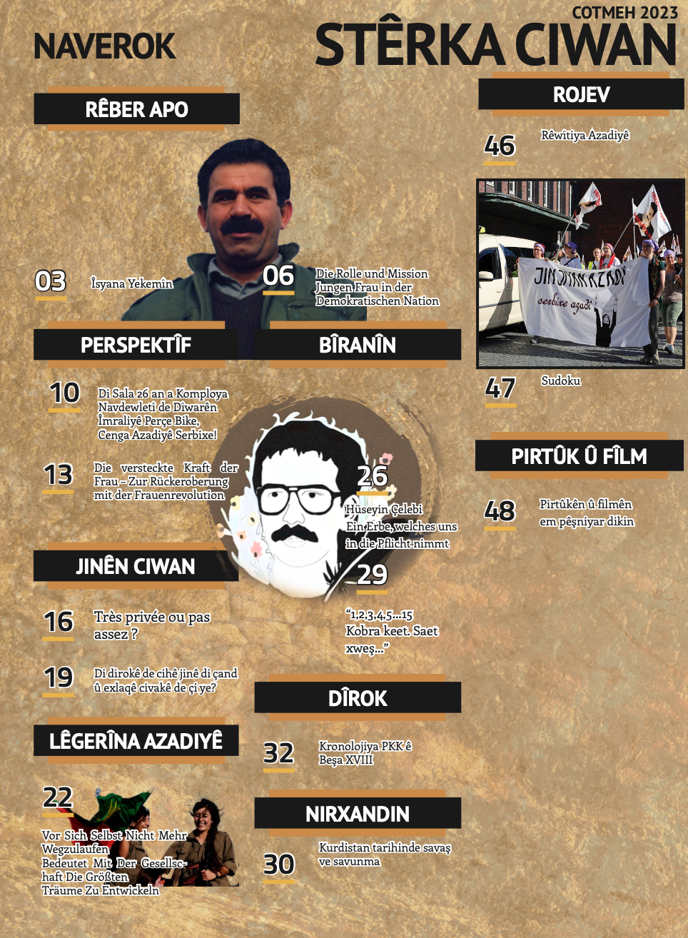 Derginin Önder APO kısmında “İlk İsyan” ile “Demokratik Uluslarda Genç Kadınların Rolü ve Misyonu” başlıklı Kürtçe yazısı yer alıyor.