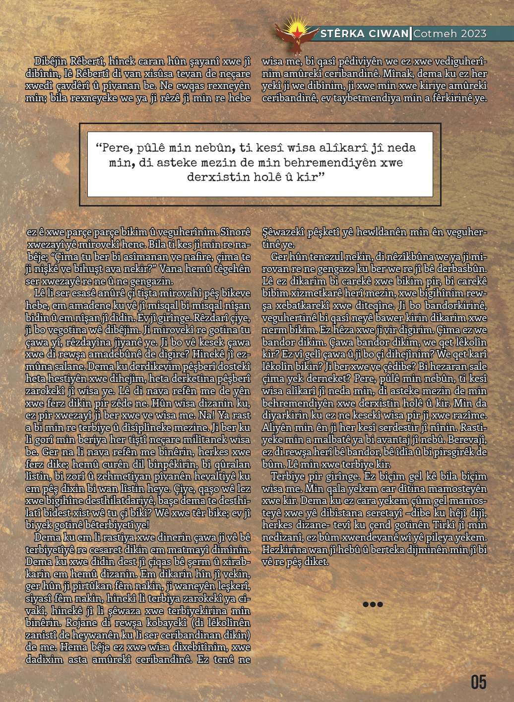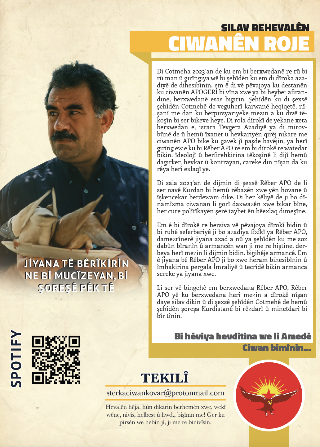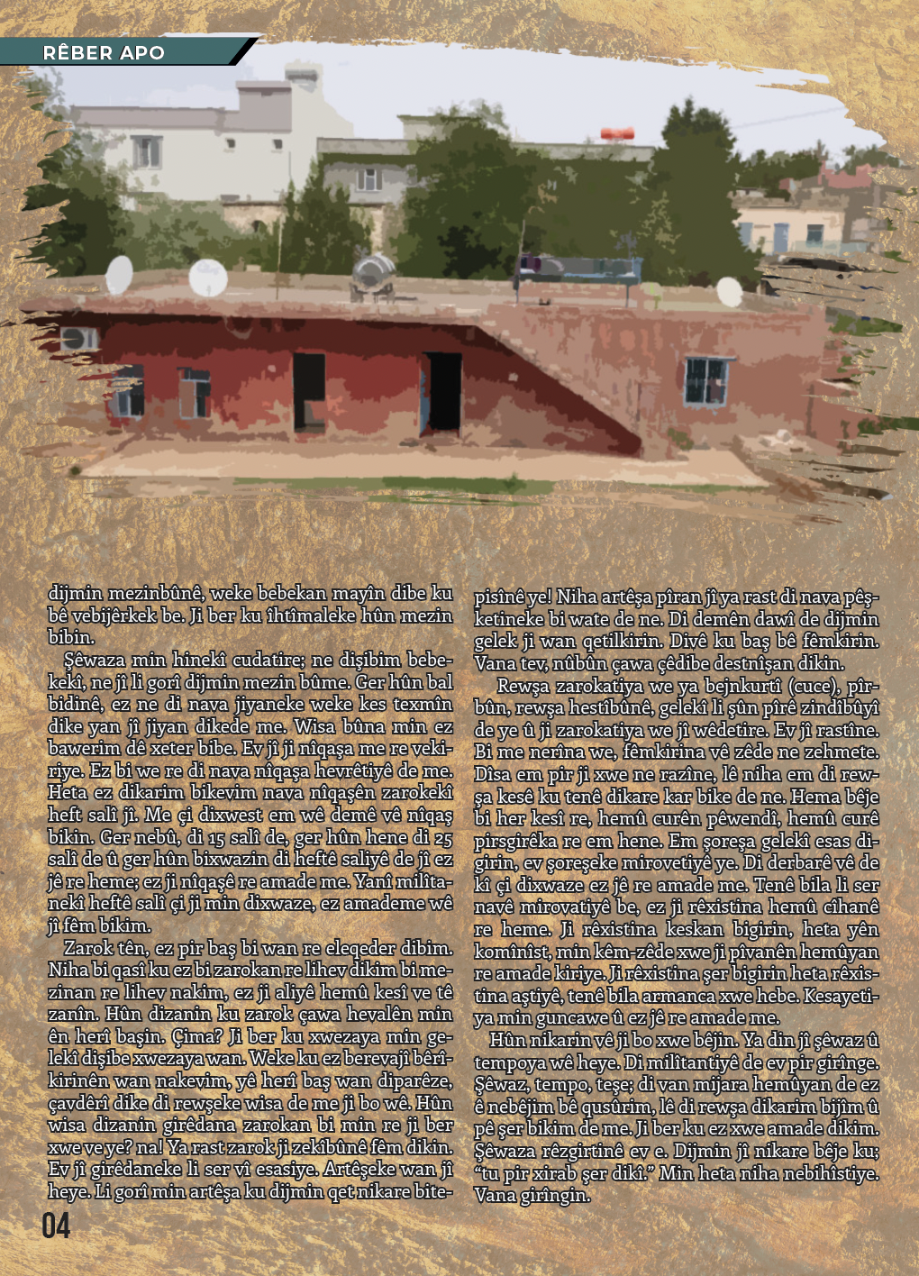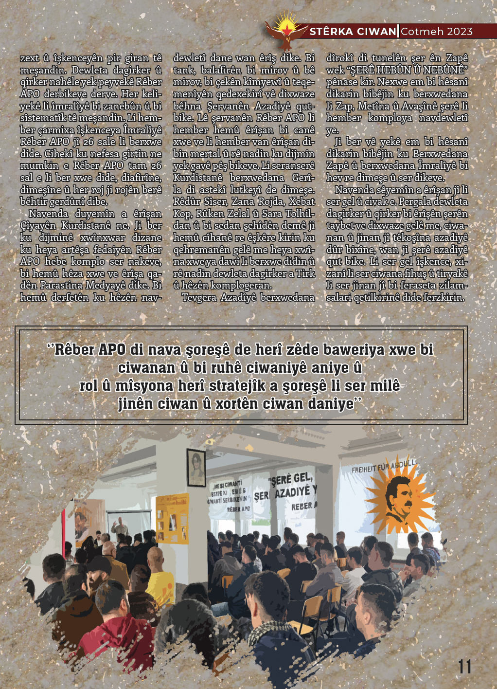 Derginin Önder APO kısmında “İlk İsyan” ile “Demokratik Uluslarda Genç Kadınların Rolü ve Misyonu” başlıklı Kürtçe yazısı yer alıyor.