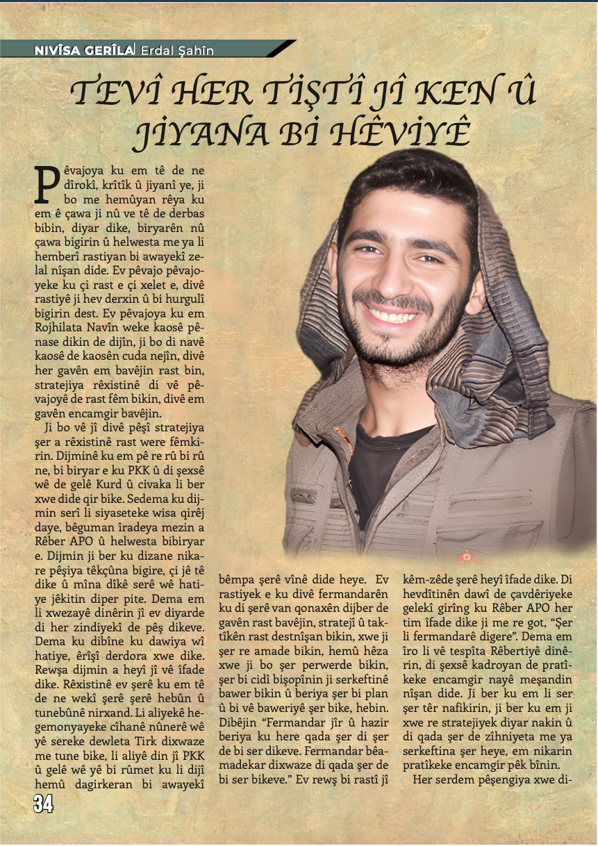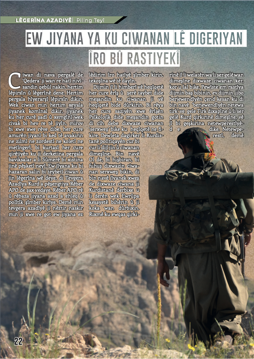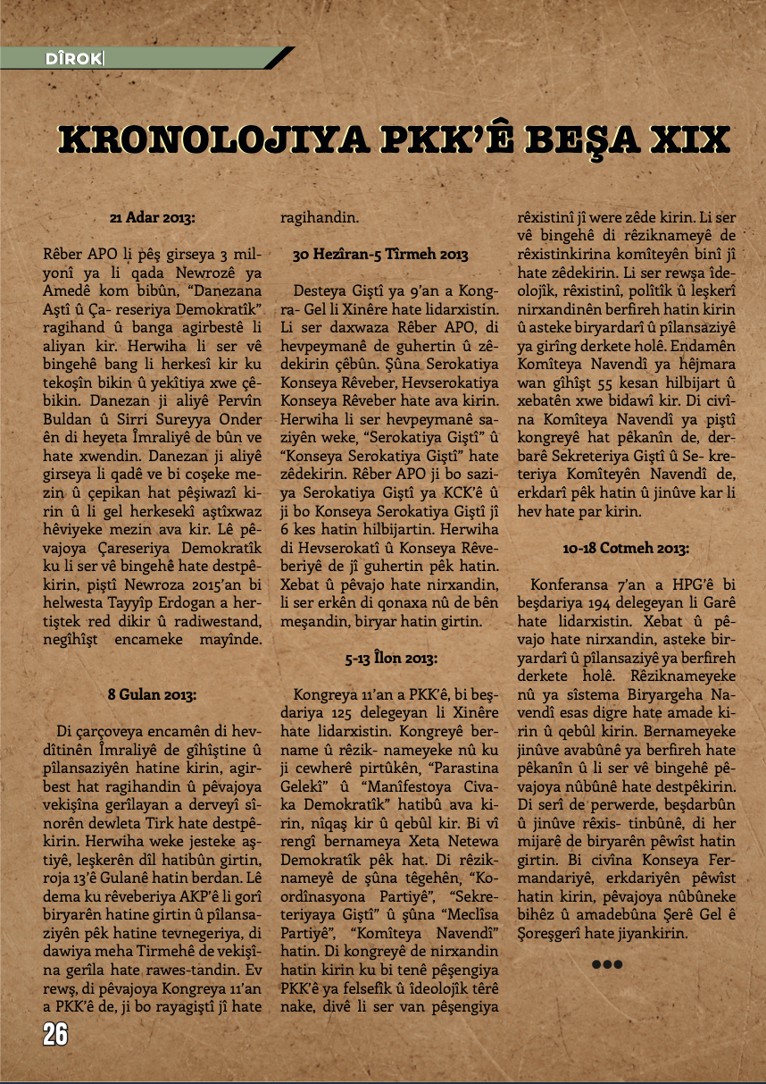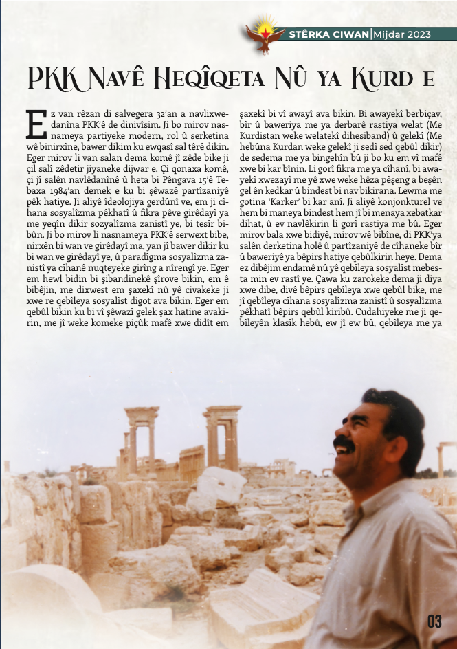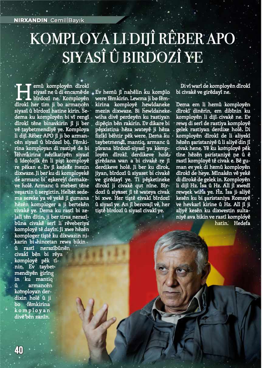 Derginin Önder APO kısmında ‘’PKK Navê Heqîqeta Nû ya Kurd e’’(PKK yeni Kürt hakikatinin adıdır) başlıklı Kürtçe yazısı yer alıyor.