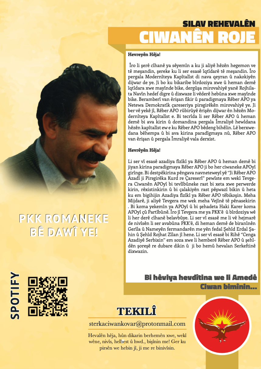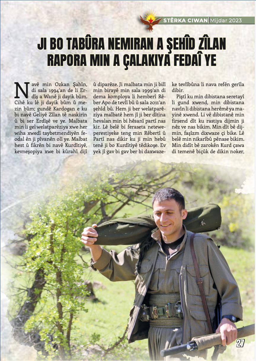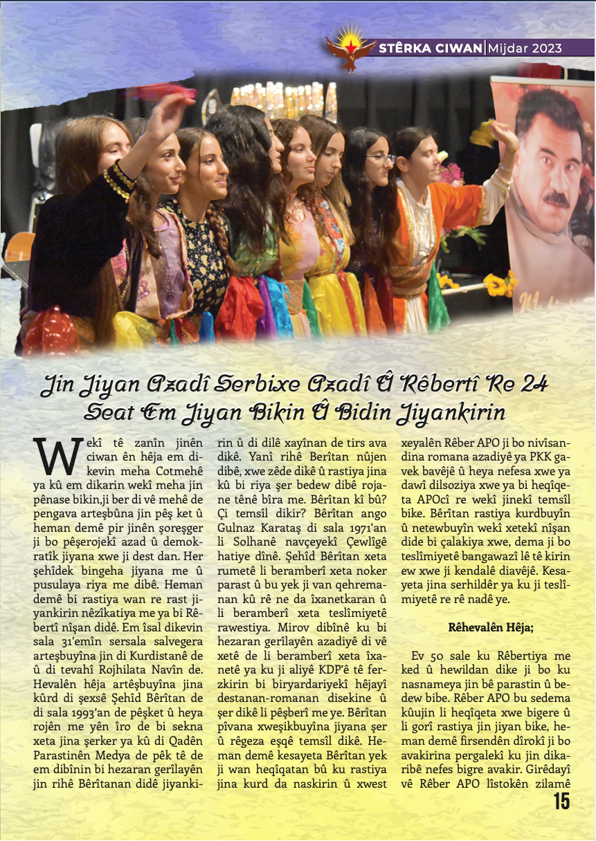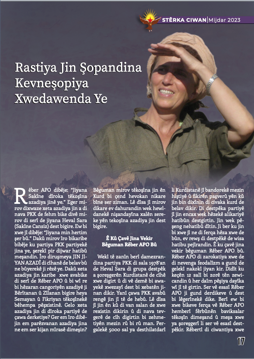 Derginin Önder APO kısmında ‘’PKK Navê Heqîqeta Nû ya Kurd e’’(PKK yeni Kürt hakikatinin adıdır) başlıklı Kürtçe yazısı yer alıyor.