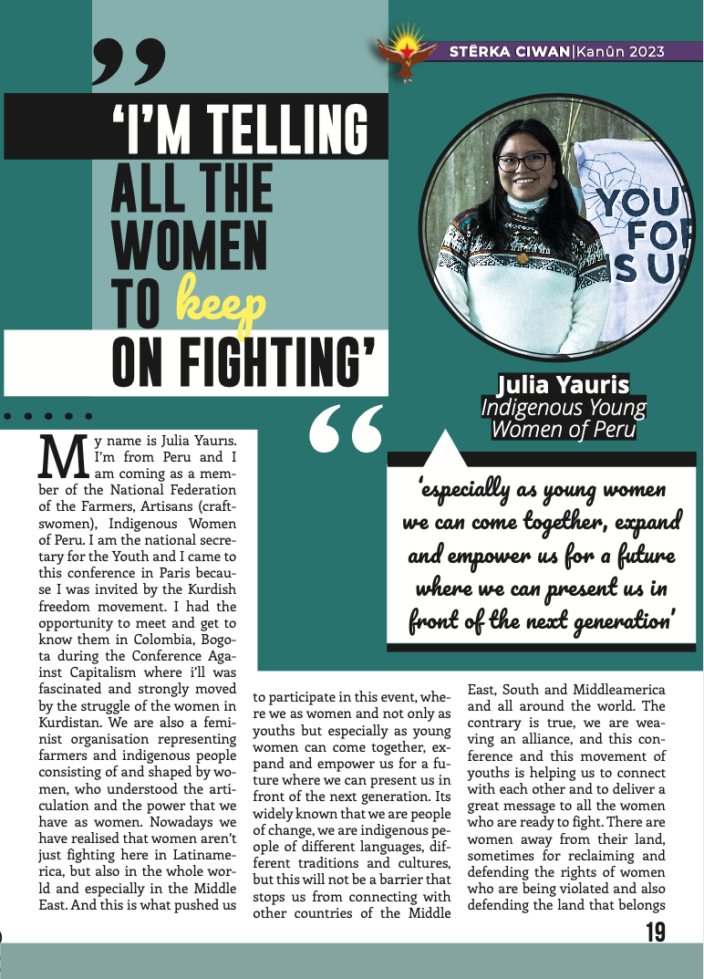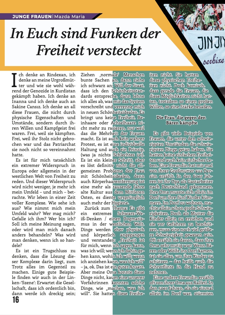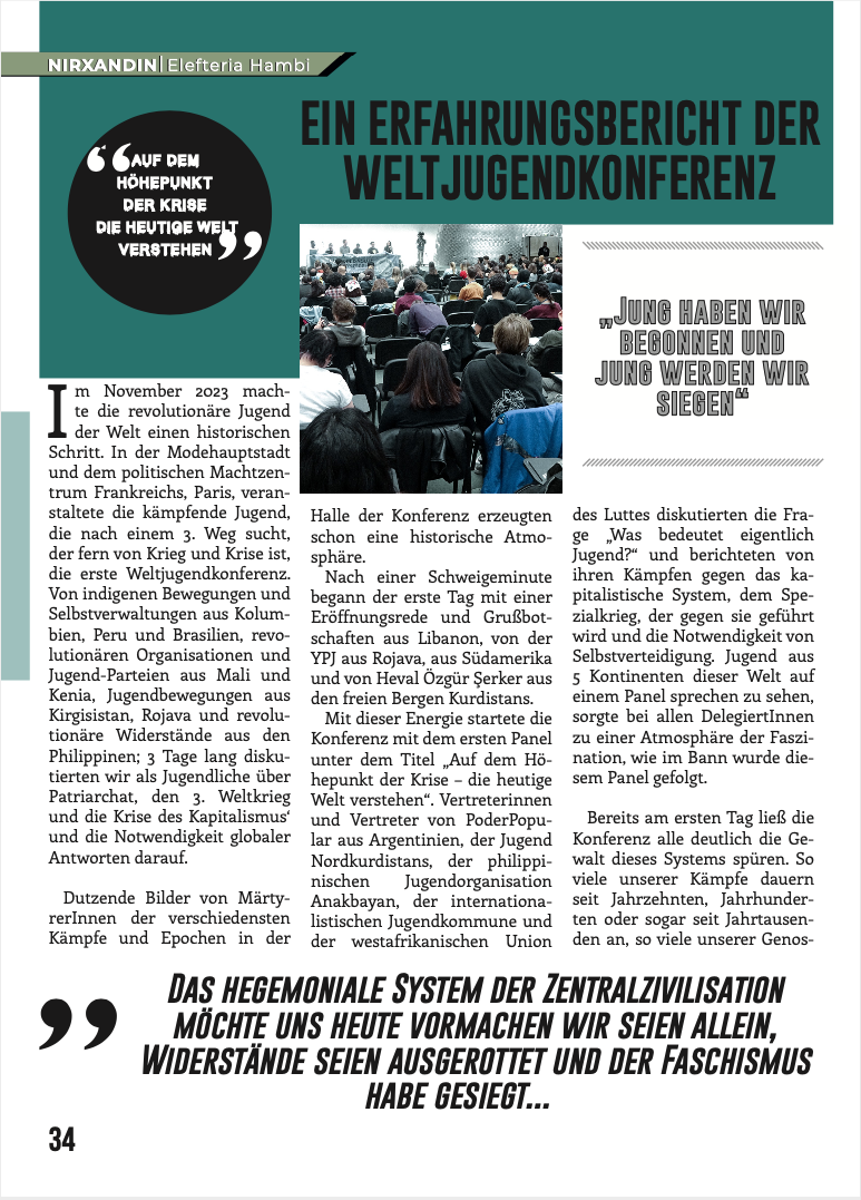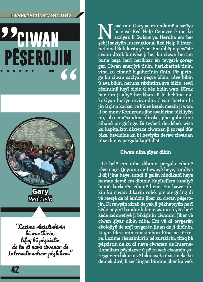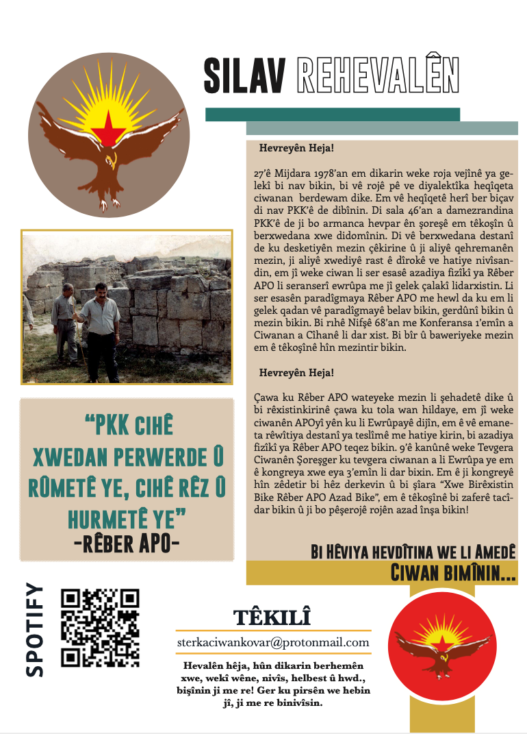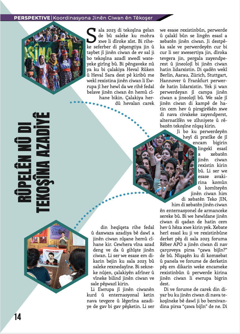 Ayrıca Avrupa Gençlik örgütleri Tevgera Ciwanên Şoreşger (TCŞ) ve Jinên Ciwan ên Têkoşer (TekoJIN) perspektif yazıları da bu sayıda yerini almakta. Aynı zamanda dergimizin arka kapakğında 2011 yılında özgürlük saflarına katılan, daima APOcu fedai ruhla çalışıp, soluk soluğa bir mücadalenin sahibi olan, Yekinîyên Parasina Gel(YPS) çalışmalarındayken 2019’da Mêrdîn’de şehit düşen Bager Andok yer almakta.