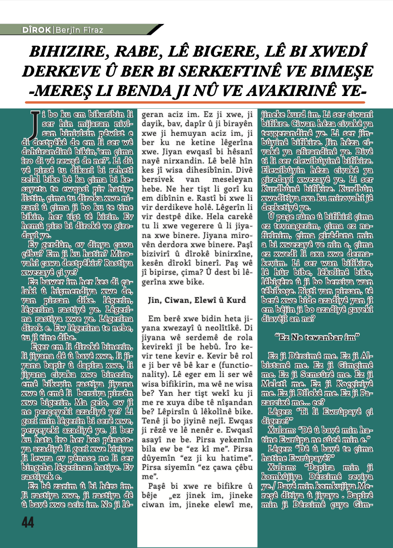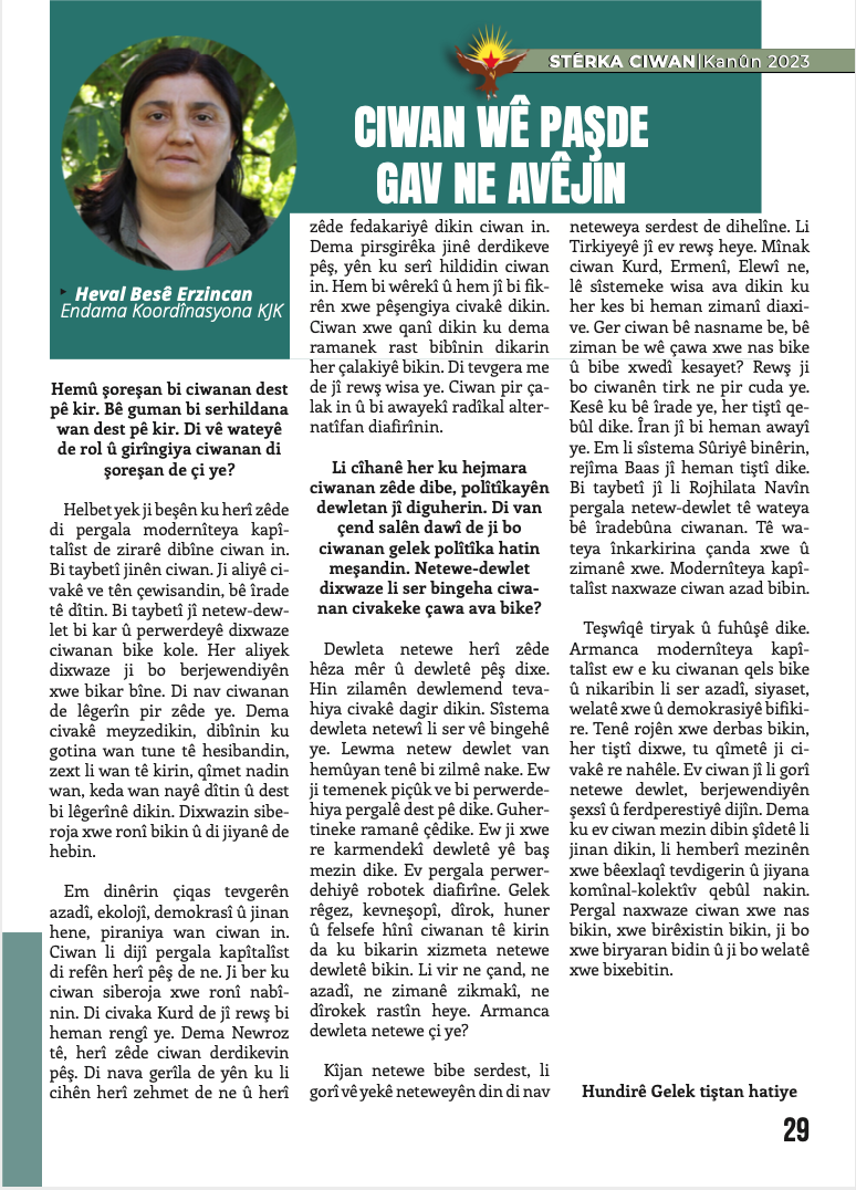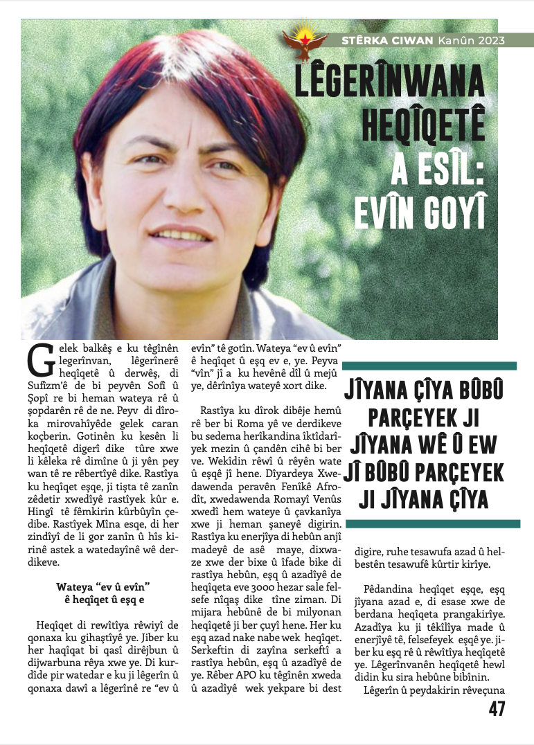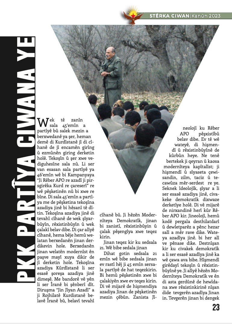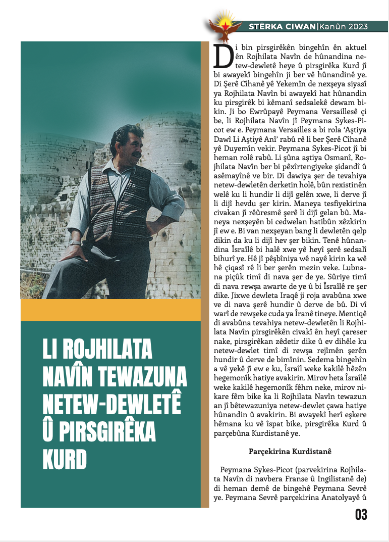 Derginin Önder APO kısmında ‘‘Li Rojhilata Navîn Tewazuna Netew-Dewletê û Pirsgirêka Kurd’’ başlıklı Kürtçe yazısı yer alıyor.