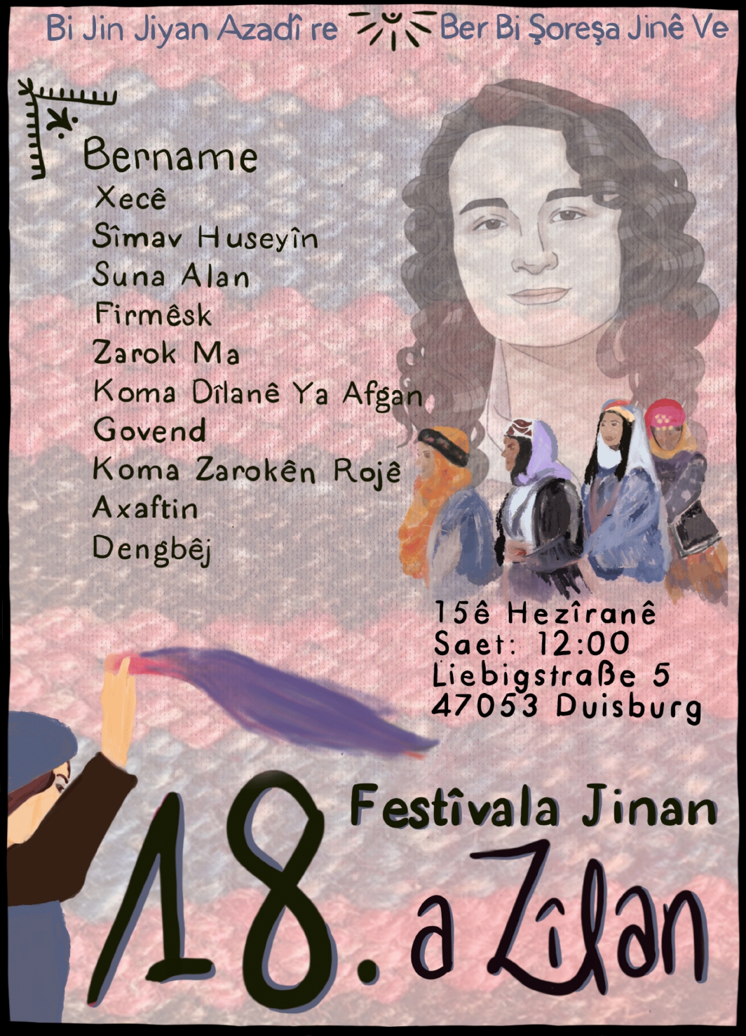 Avrupa Gençlik örgütleri Tevgera Ciwanên Şoreşger (TCŞ) ve Jinên Ciwan ên Têkoşer (TekoJIN) koordinasyonu, “Özgürlük mücadelesini büyütün” ve “Zilanlar gibi ataerkil zihniyetin kabusu olun” perspektifleri yer almakta.