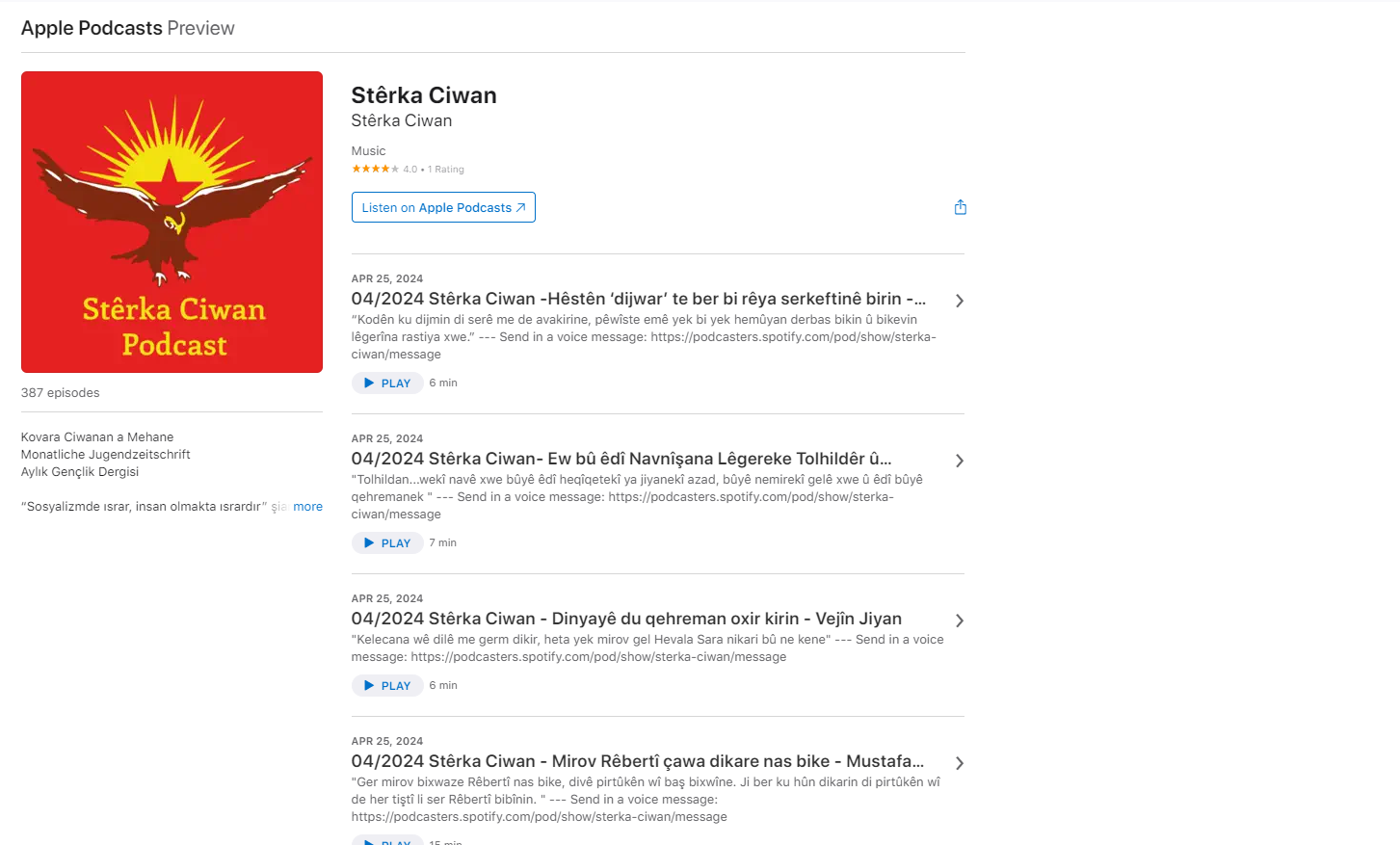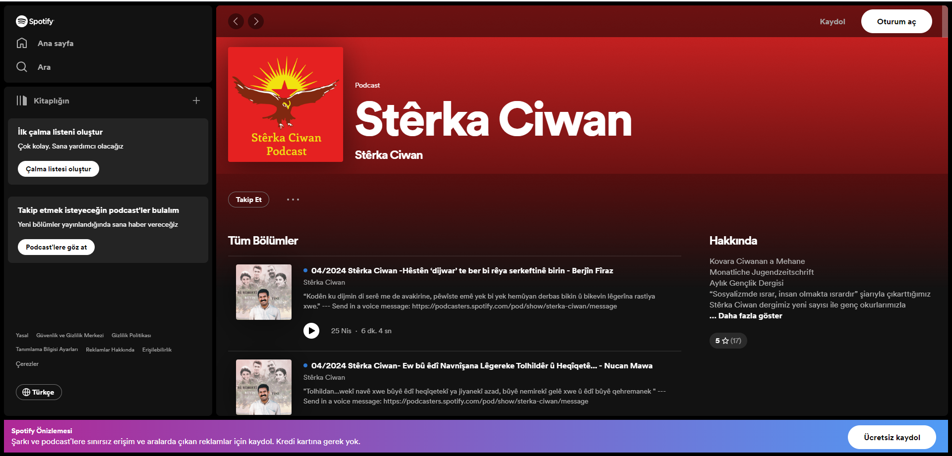 Stêrka Ciwan dergisini sesli olarak dinlemek için “Stêrka Ciwan Spotify” sayfasını tarayıcınızda (Google, Mozila, Safari vb.) aratarak ya da aşağıya bıraktığımız linkten ulaşabilirsiniz.