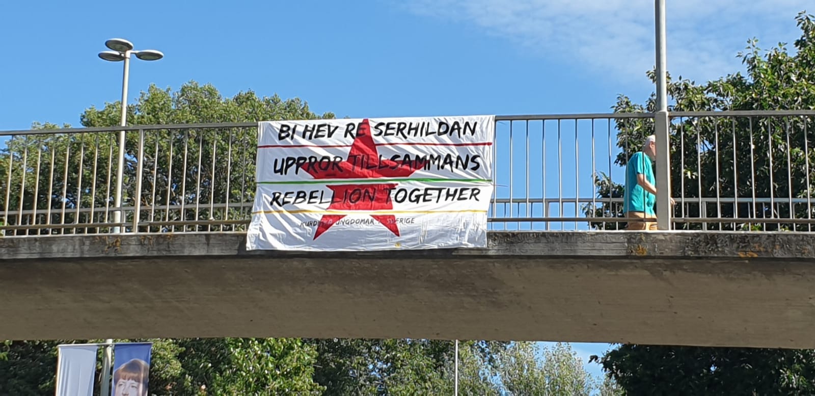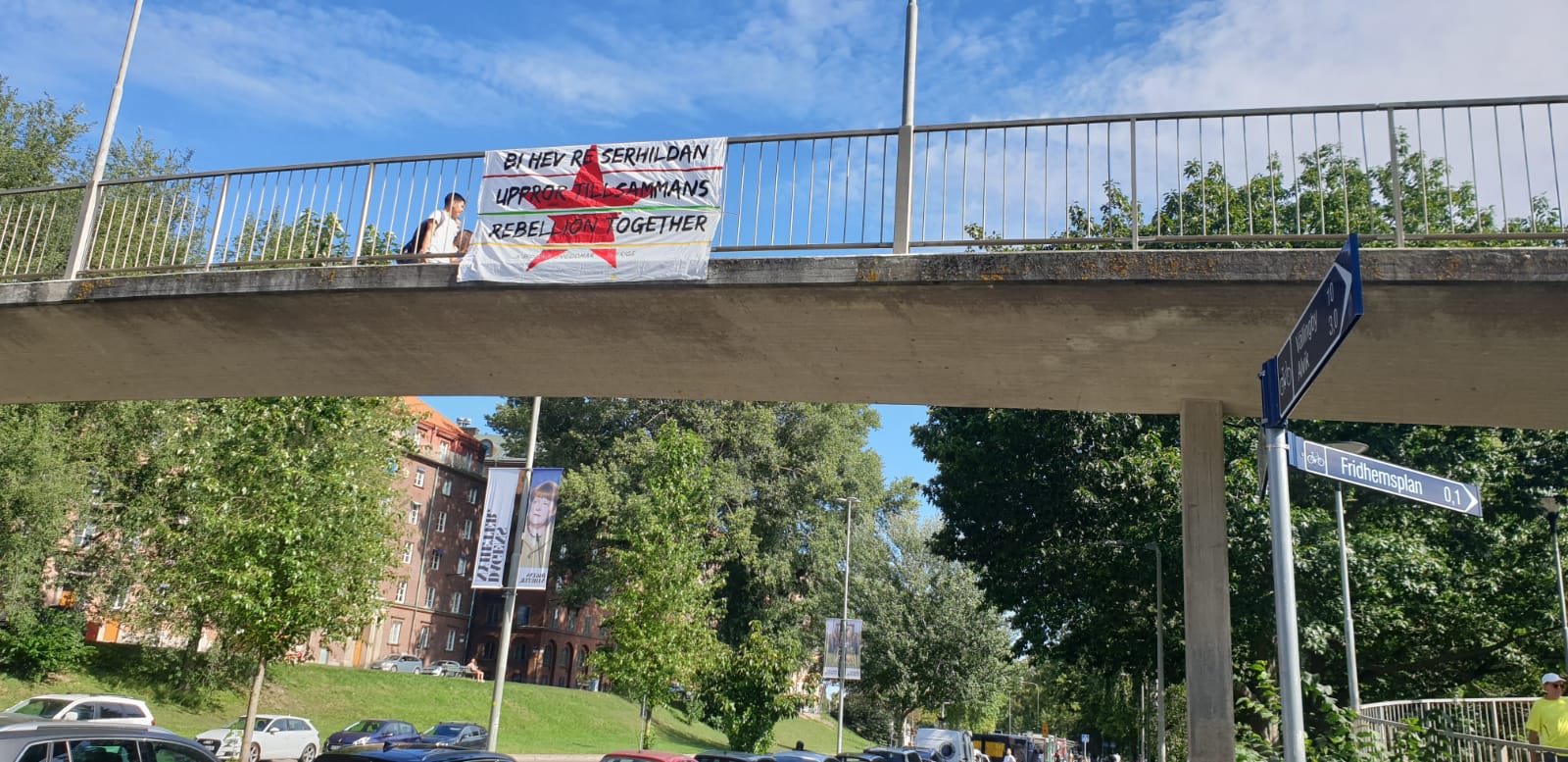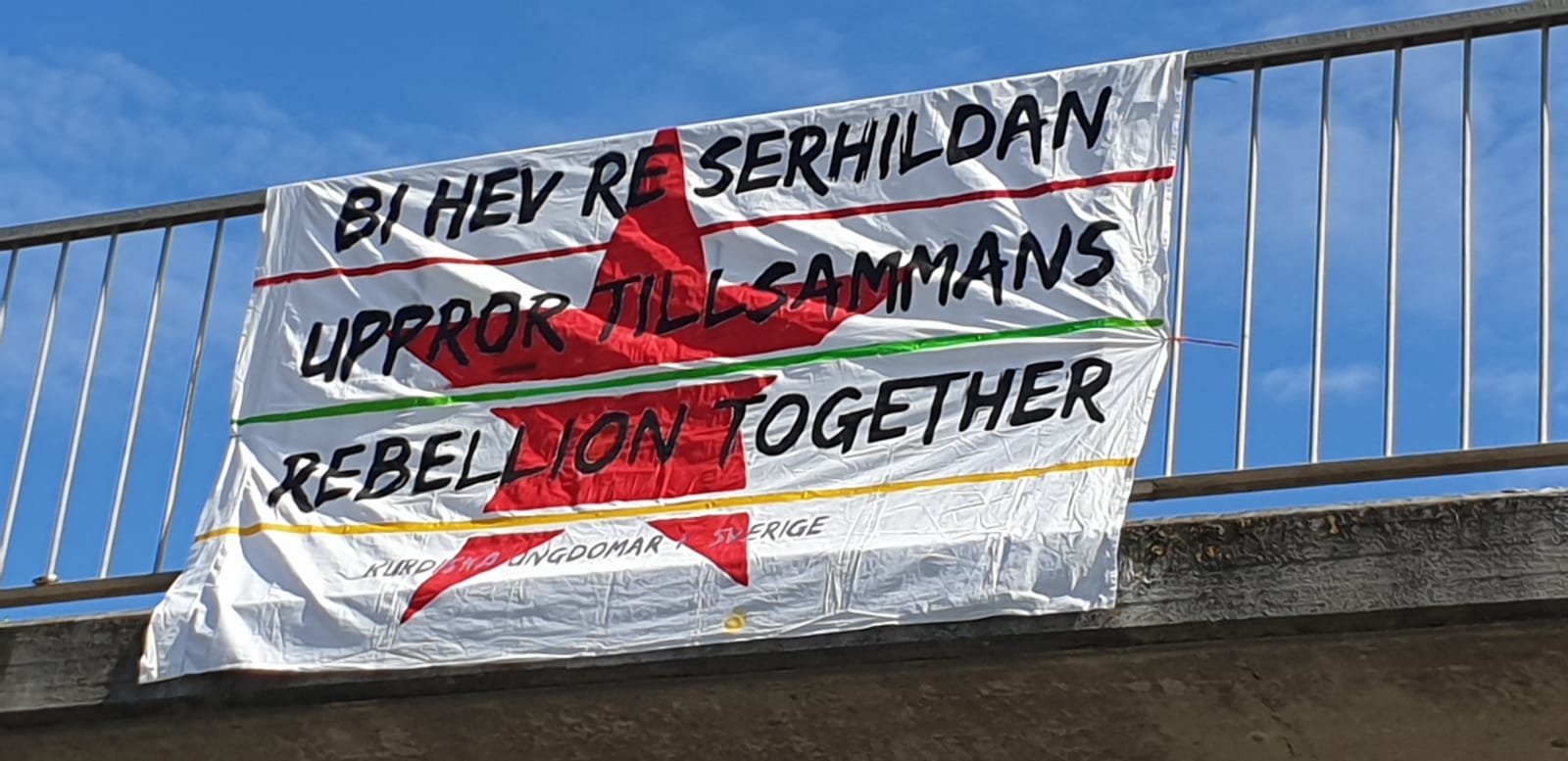 Saat 16’da bir araya gelen gençler, Stockholm merkezde en işlek caddeye astıkları pankart ile hamleye katıldıklarını belirttiler. Gençler; Kürtçe, İsveççe ve İngilizce “Bi Hev Re Serhildan” yazılı pankart astılar.