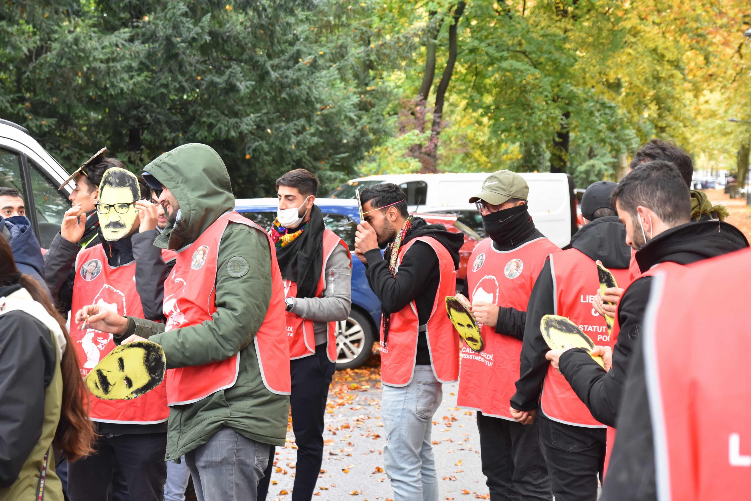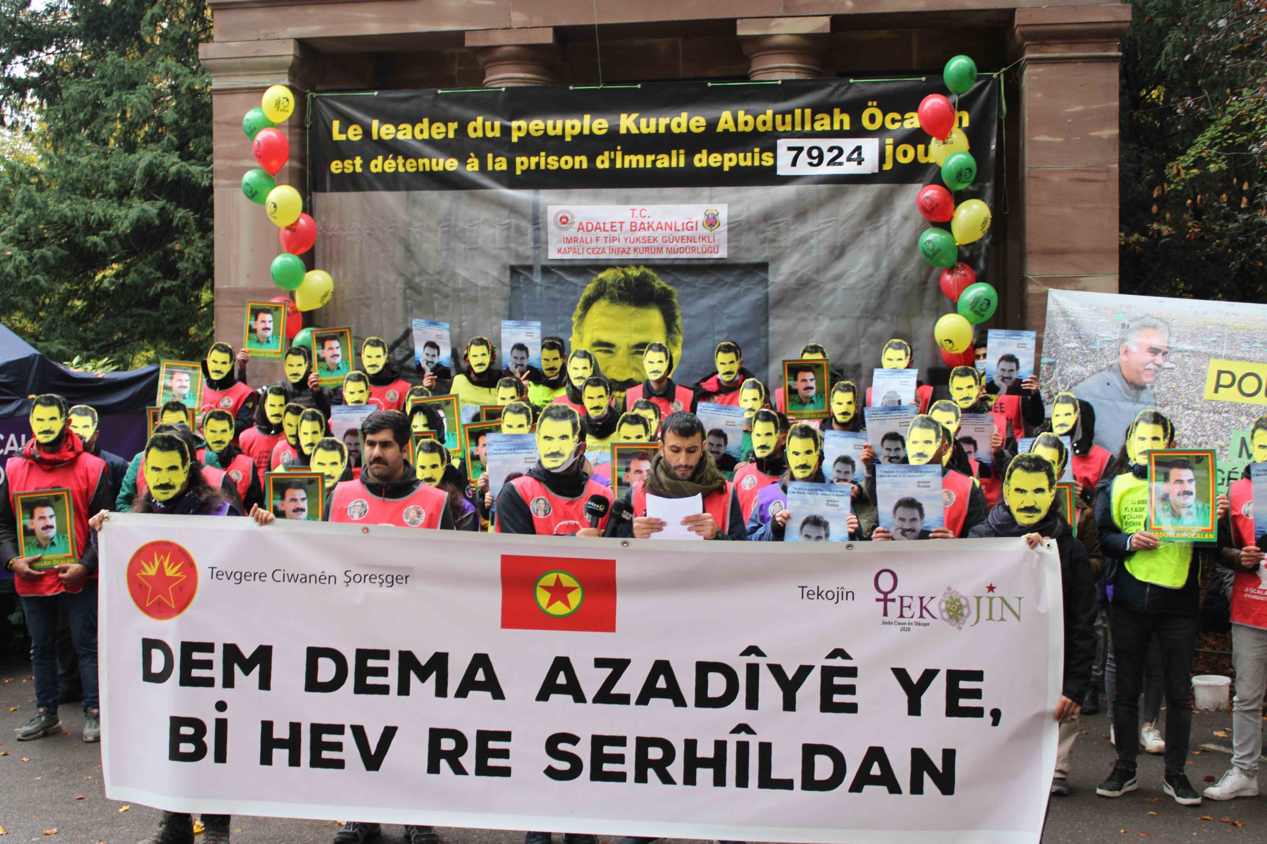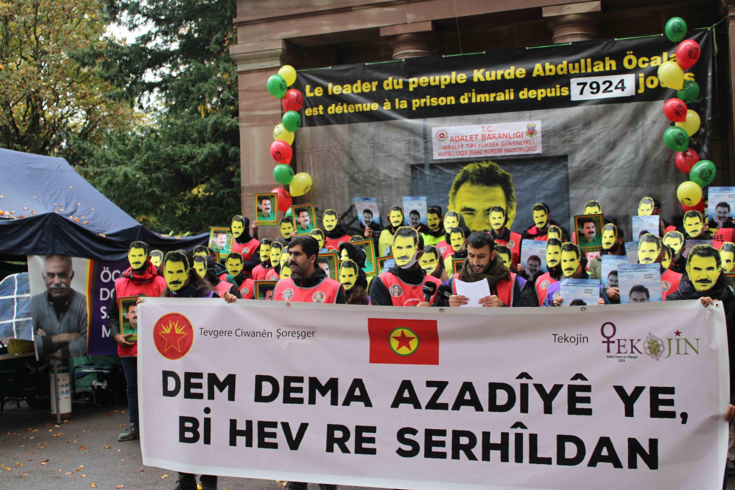 Avrupa Konseyi önünde düzenlenen eylem alanında, üzerinde Halklar Önderi Abdullah Öcalan’ın fotoğrafının olduğu büyük bir pankart bulunurken, Önder Öcalan’ın fotoğraflarının olduğu balonlar ve farklı dillerde yazılmış, “Öcalan’a Özgürlük” pankartları da asıldı.