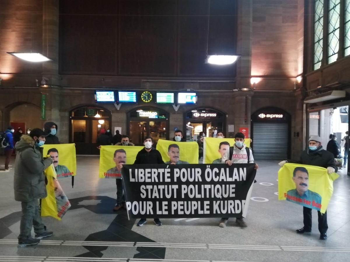 Saat 17:00’da bir araya gelen eylemciler Fransızca “Öcalan’a Özgürlük, Kürt Halkına Politik Statü” yazılı bir pankart açtılar. Sık sık Fransızca ve Kürtçe ‘Bijî Serok APO’, ‘Liberté Pour Öcalan’ ve ‘Be Serok Jîyan Nabe’ sloganları attılar.