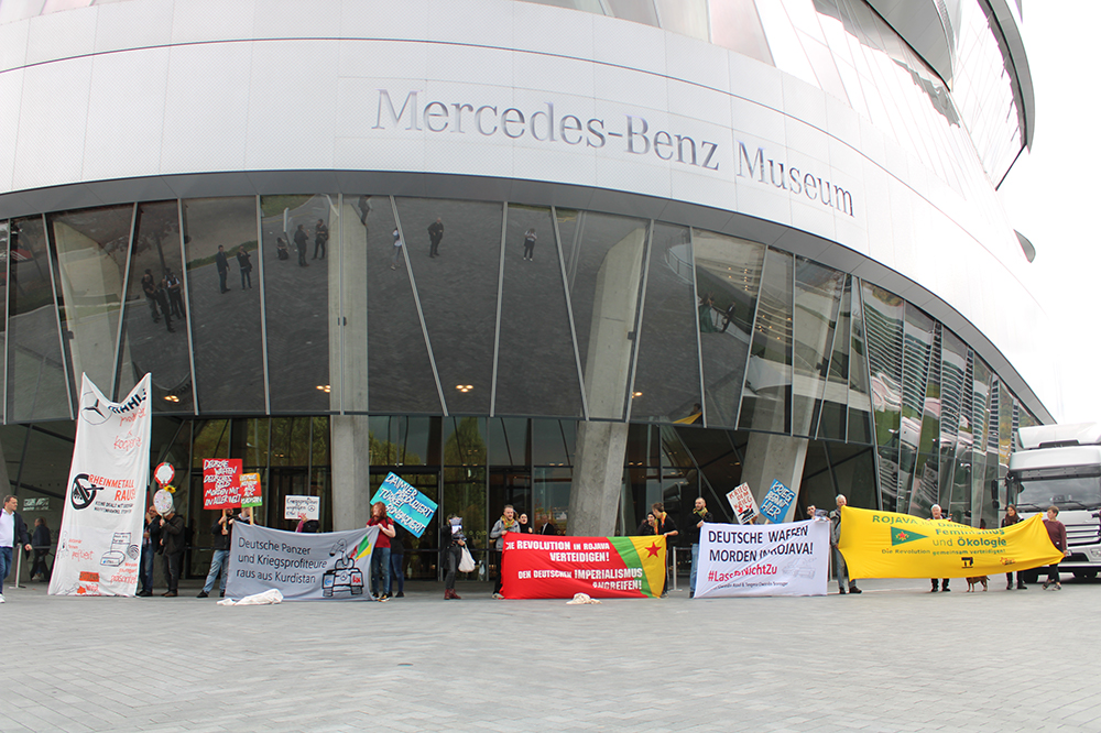 Öğleden sonra ise Alman araba üreticisi Mercedes Benz’in Stuttgart merkezi önünde bir işgal eylemi gerçekleştirildi. Faşist Türk devletinin Rojava’ya saldırılarında kullandığı bazı askeri araçları sağlayan Mercedes’in binasının girişi ve önündeki yol çok sayıda Kürt ve enternasyonalist tarafından bloke edildi. Gençler işgal eylemlerini “Alman tankları ve savaştan yararlananlar Kürdistan’dan dışarı”, “Savaş burada başlıyor” ve “Rojava Devrimi’ni savunun! Alman emperyalizmine saldırın!” yazılı çok sayıda pankartla gerçekleştirdi.