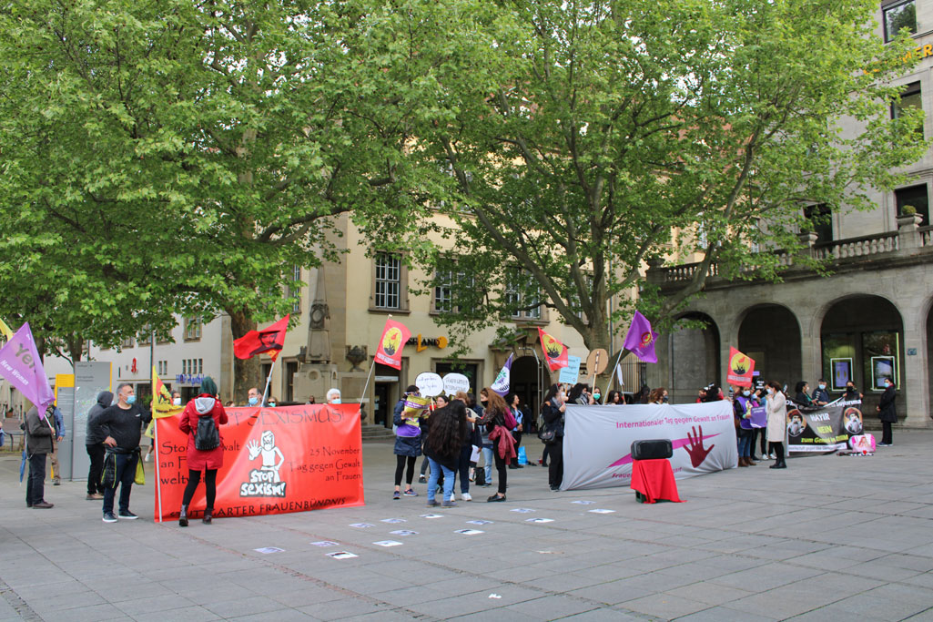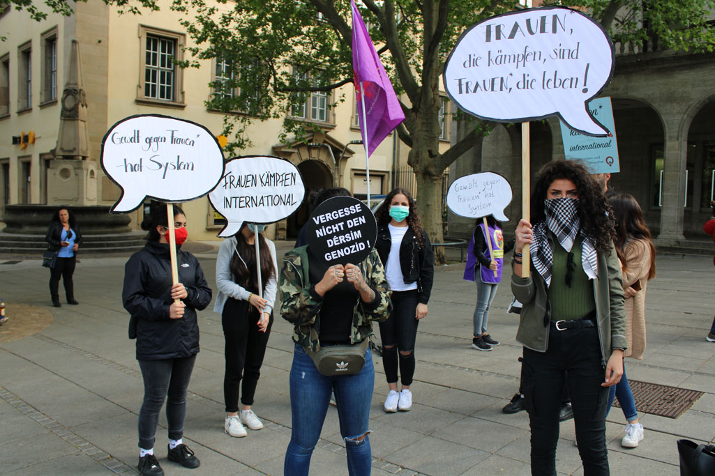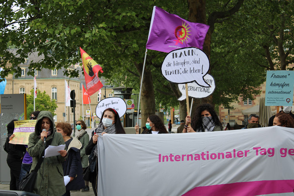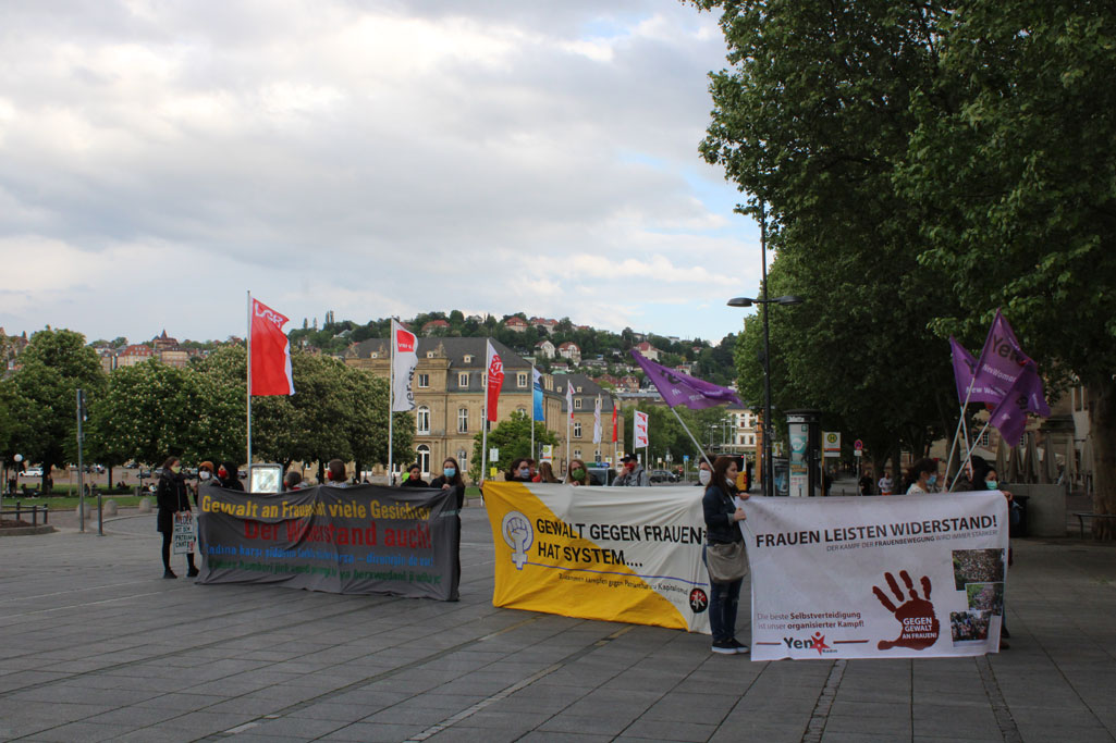 Stuttgart merkez de saat 18:00 de toplanan eylemciler mitinge yapılan bir açılış konuşması ile başladı. Açlılış konuşmasında özellikle Koronavirüs salgını sürecinde arttan kadın şiddeti değerlendirildi, Hamburg’da eşi tarafından şiddete maruz kalan Meryem Şahin ile dayanışma mesaji verlicerek erkek egemen zihniyetin kadının üzerindeki politikaları ve baskıları teşhir edildi. Ayrıca konuşmada, Dersim Katlıamı yıldönümü vesilesi ile yaşamını yitirenler anıldı. Açılış konuşması ardından miting sloganlar ile devam etti. Kadın şiddetini, erkek egemen sistemi ve erkek egemen zihniyeti teşhir eden pankartlar tutan aktivistler sık sık “Jin Jiyan Azadî” sloganını attı.