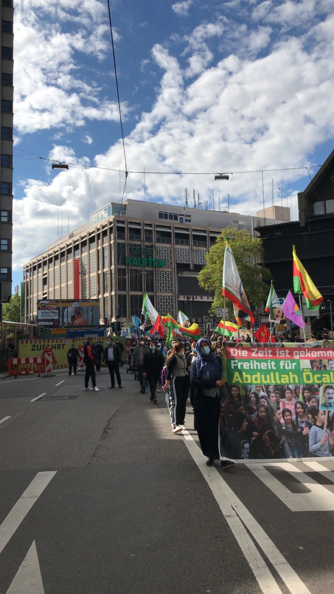 Yürüyüşe bir çok devrimci sol örgüt de destek verdi. Kürdistanlılar yürüyüş güzergahı boyunca Kürtçe, Almanca ve Türkçe “Faşizme karşı omuz omuza”, “Erdoğan bir savaş suçlusudur”, “Bi Hev Re Serhildan”, Önder APO’ya Özgürlük, Siyasi tutsaklara Özgürlük”, “İmralı tecridi bir insanlık ayıbıdır”, “Bijî Rêber APO” ve “Es Lebe Öcalan” sloganlari attılar.
