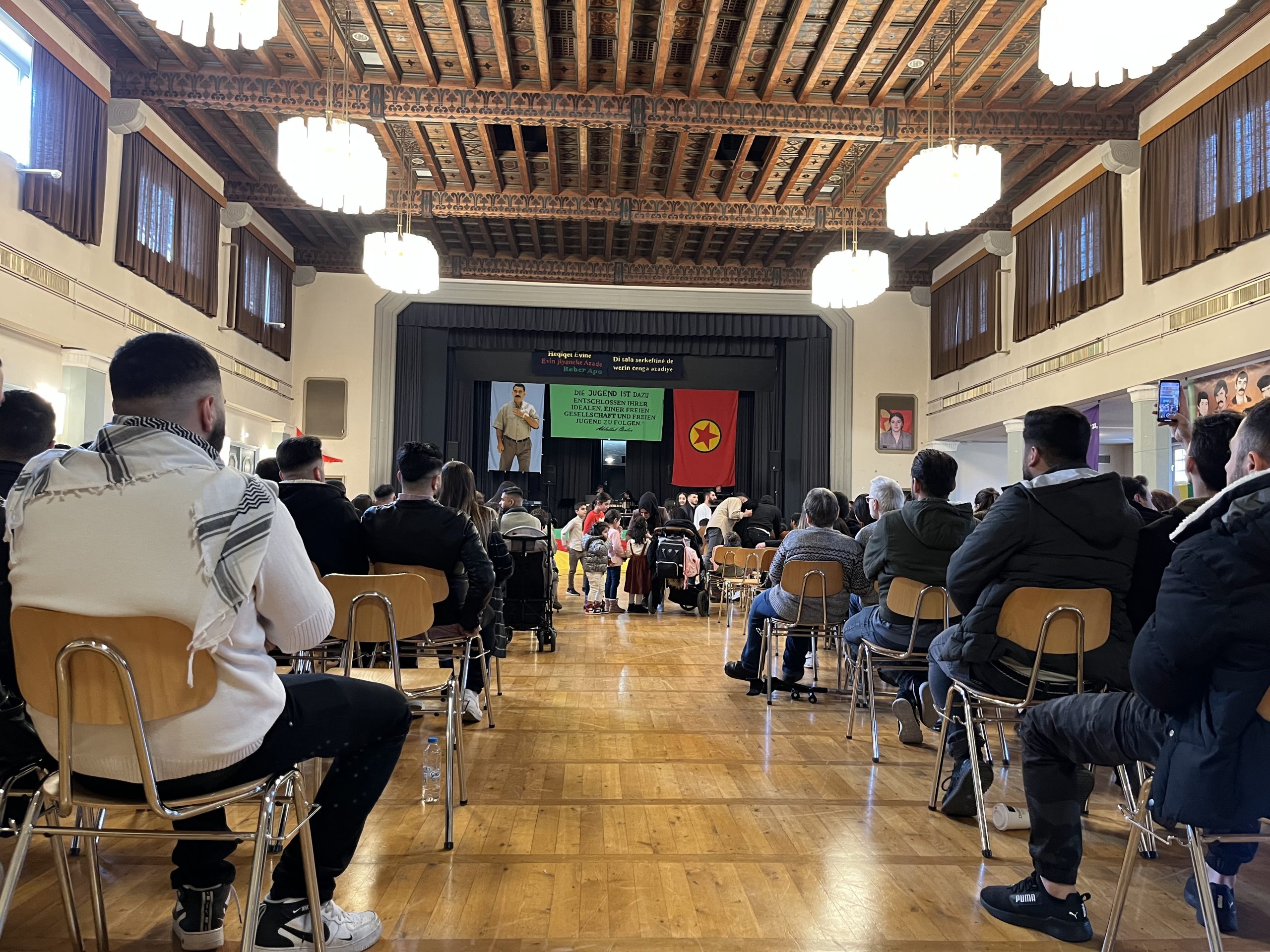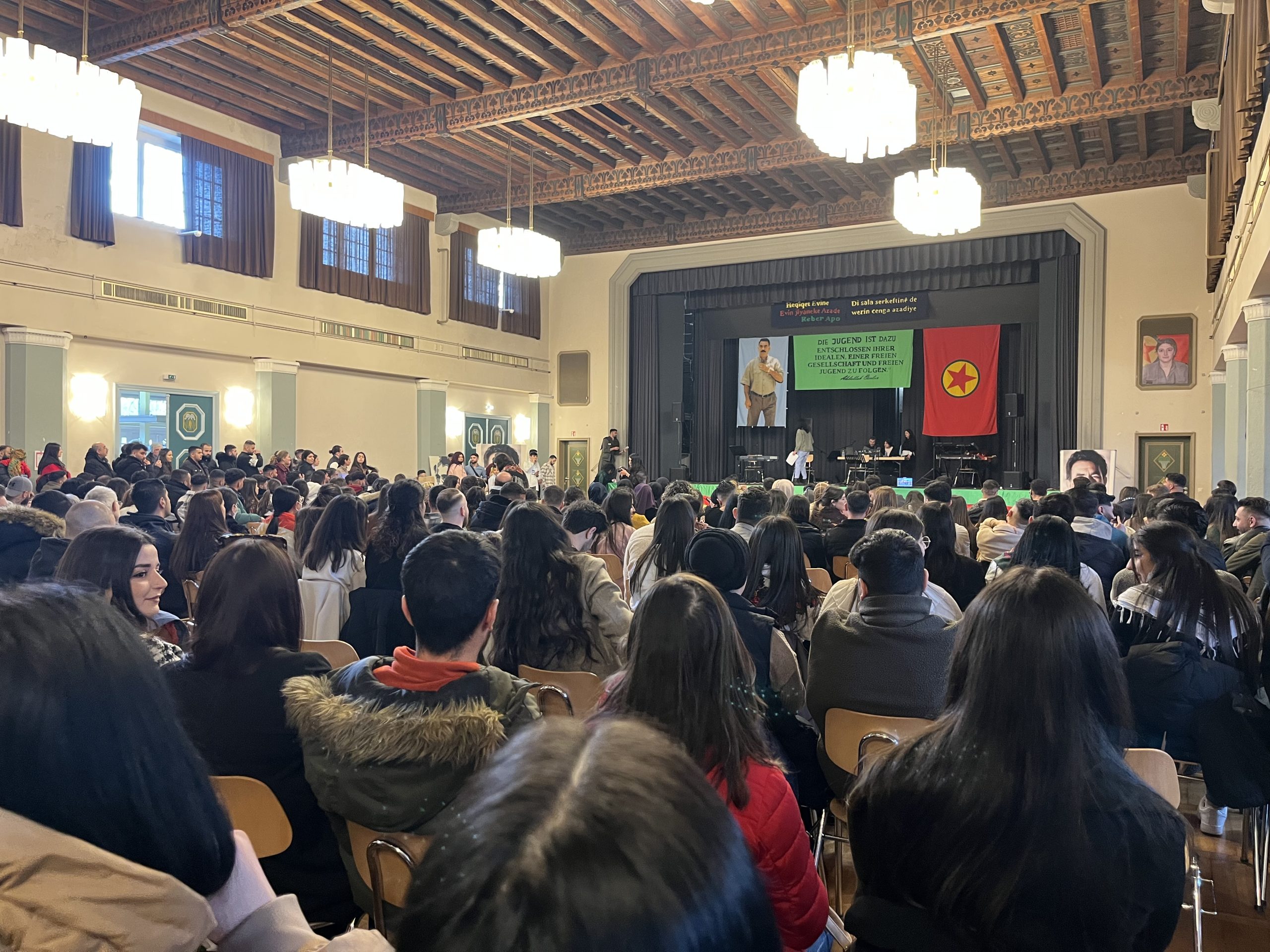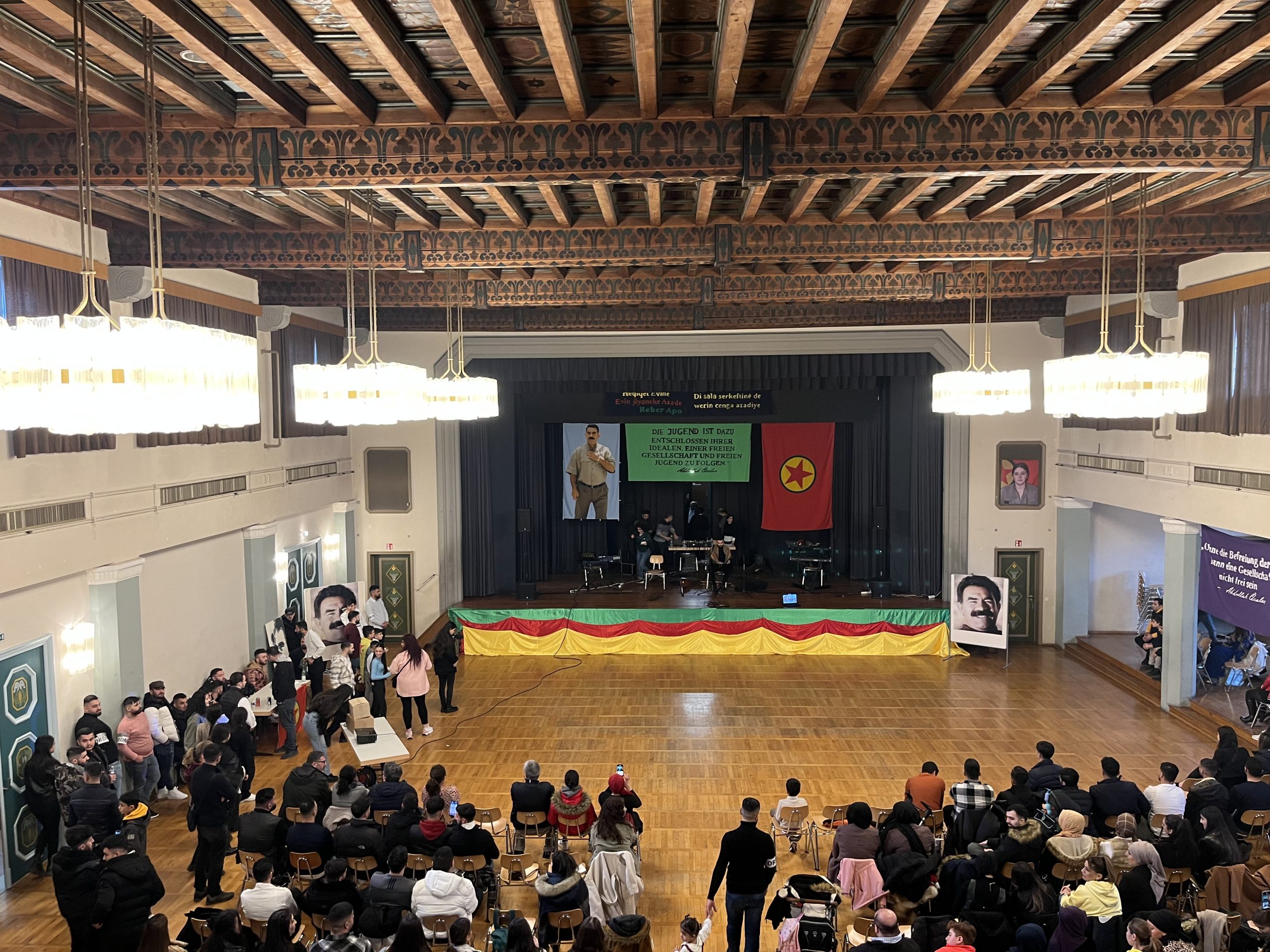 Gençler salon içerisinde coşkulu bir şekilde halaylar çekip ve attıkları „Bijî Serok APO“ sloganı ile yaklaşık olarak altı saat boyunca sürdürüldü.