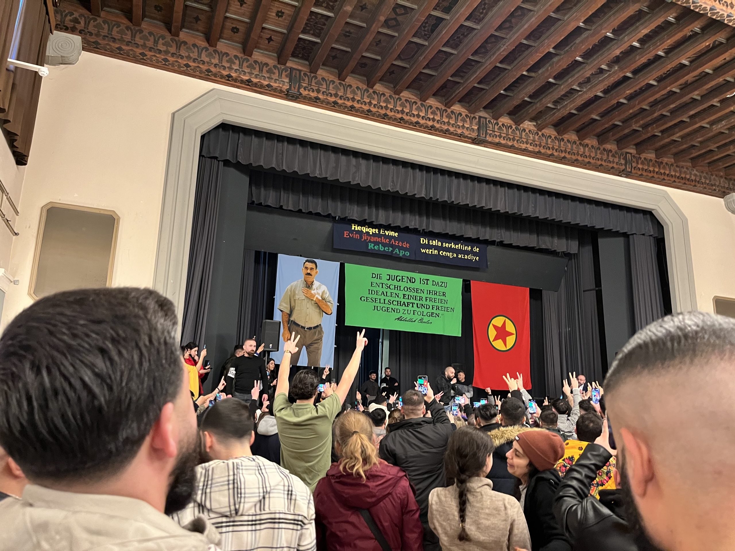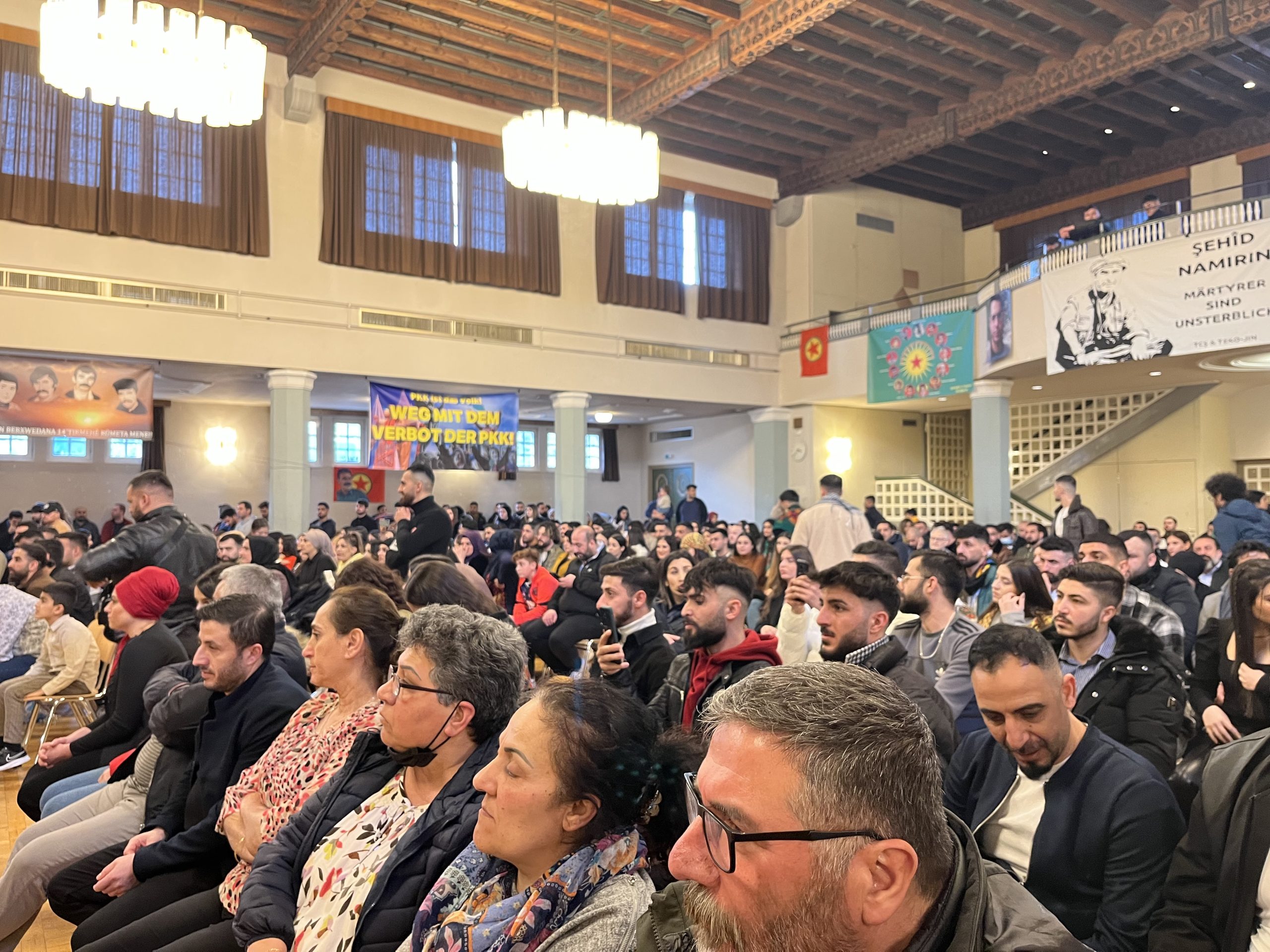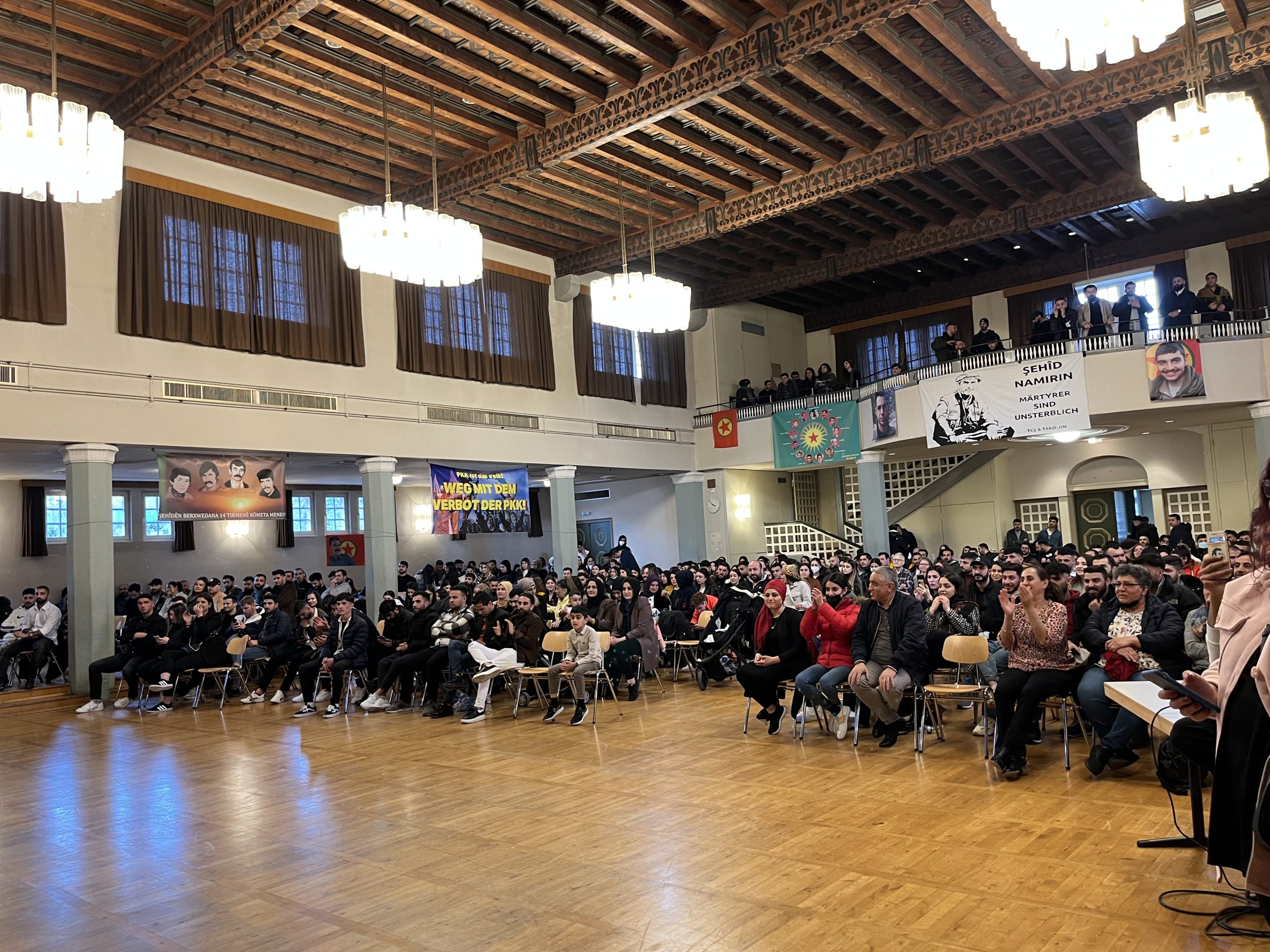 Gençler salon içerisinde coşkulu bir şekilde halaylar çekip ve attıkları „Bijî Serok APO“ sloganı ile yaklaşık olarak altı saat boyunca sürdürüldü.