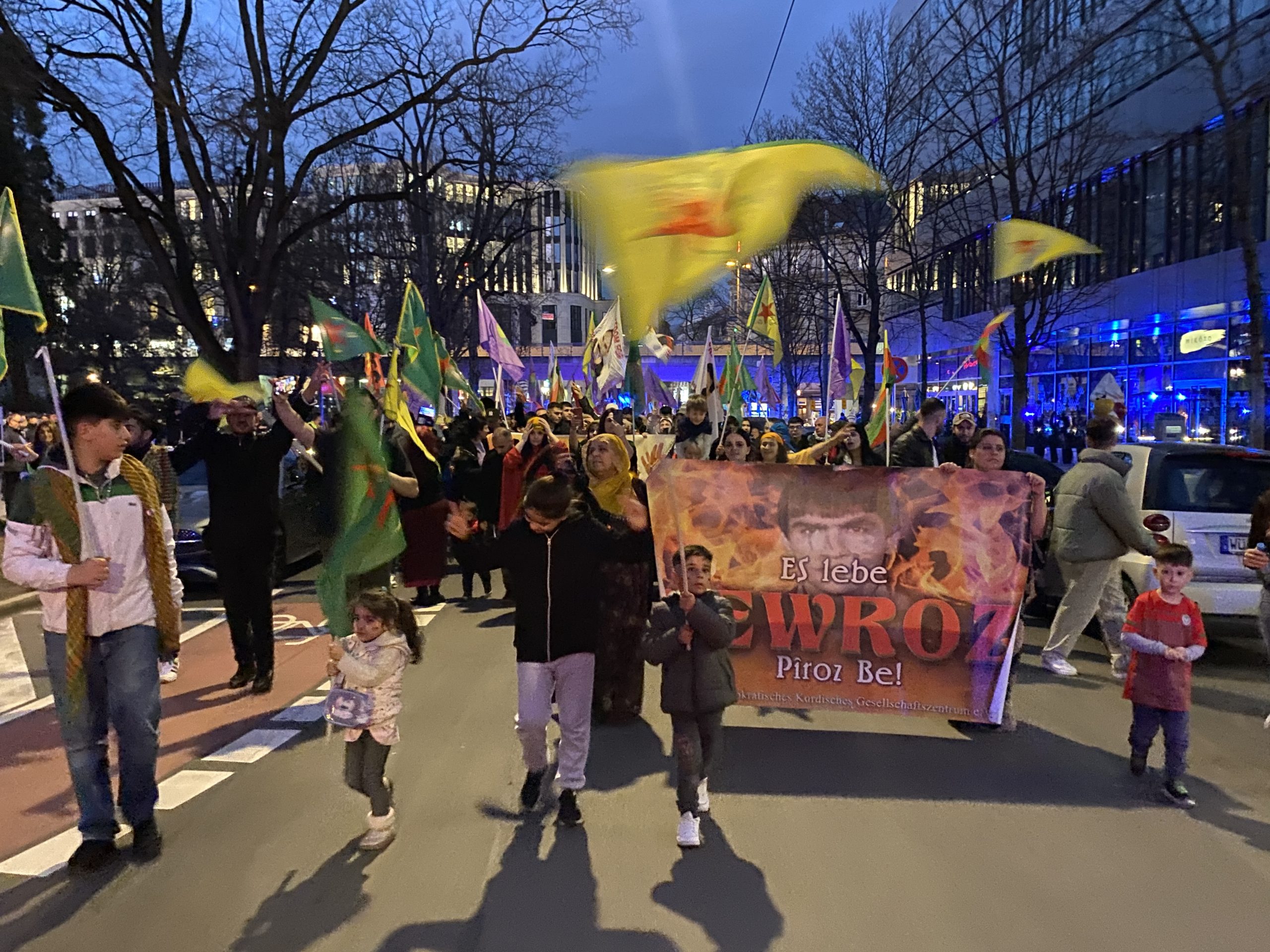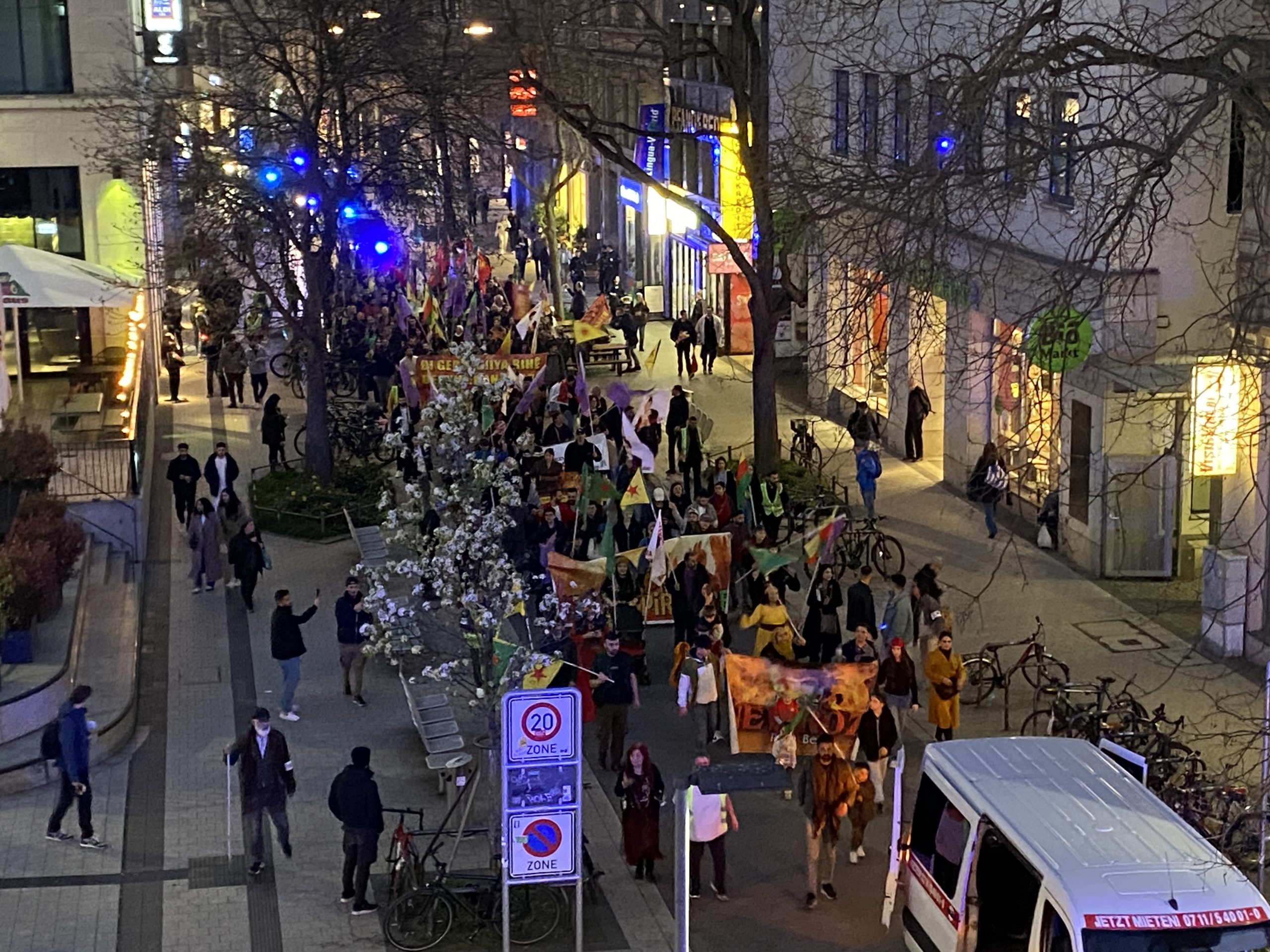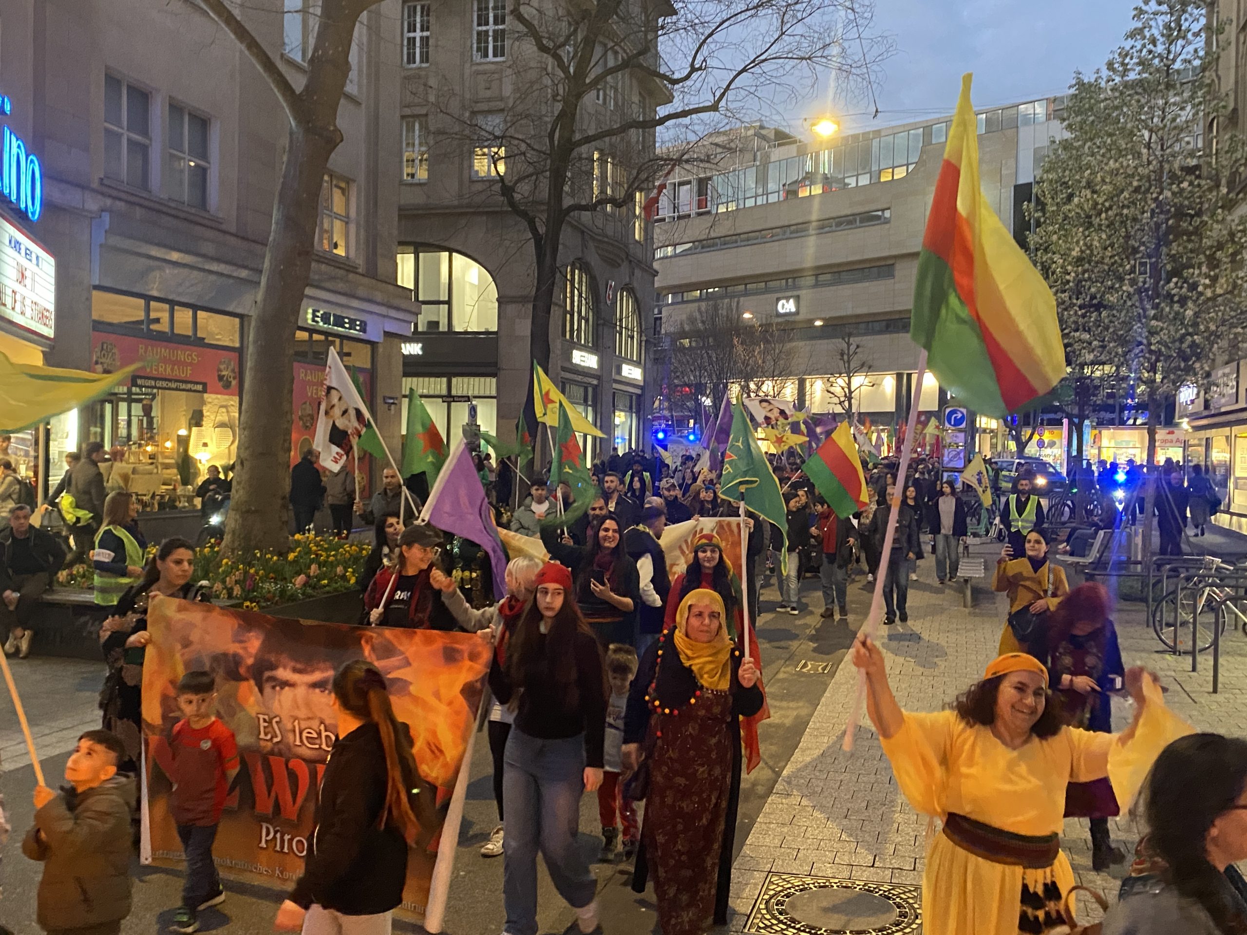 Konuşmaların ardından Lautenschlagerstraße caddesinde yürüyüşe geçen gençler ve kalabalık kitle Marienplatz’e kadar yürüyüş gerçekleştirdi. Genç kadınların ve Kürt kadınlarının geleneksel kıyafetler ile katıldığı Newroz yürüyüşünde kitle sık sık “ Bijî Serok APO” , “ Bijî Newroz”, “ Jin Jiyan Azadî “ , “ Bji Berxwedane Gerilla” sloganları atıldı.