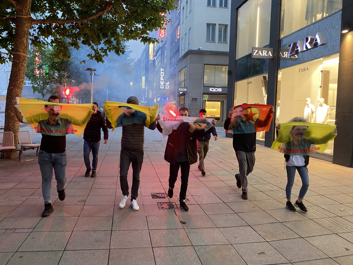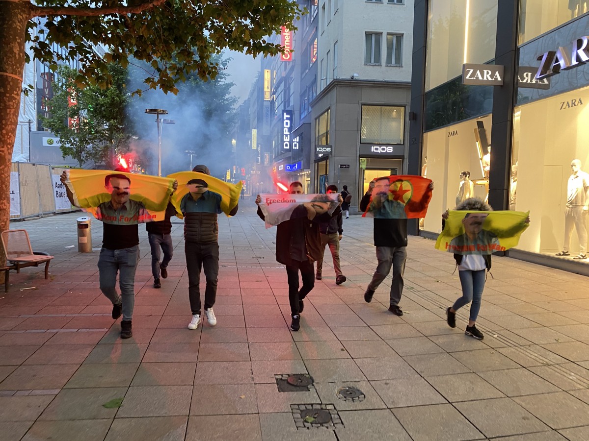 Eylem boyunca sık sık “Bijî Serok APO”, “Be Serok Jiyan Na Be”, “Bijî Berxwedana Gerîla” ve Almanca sloganlar atıldı. Gençler yürüyüşte meşale yakarak eylemlerine görsellik kattılar.