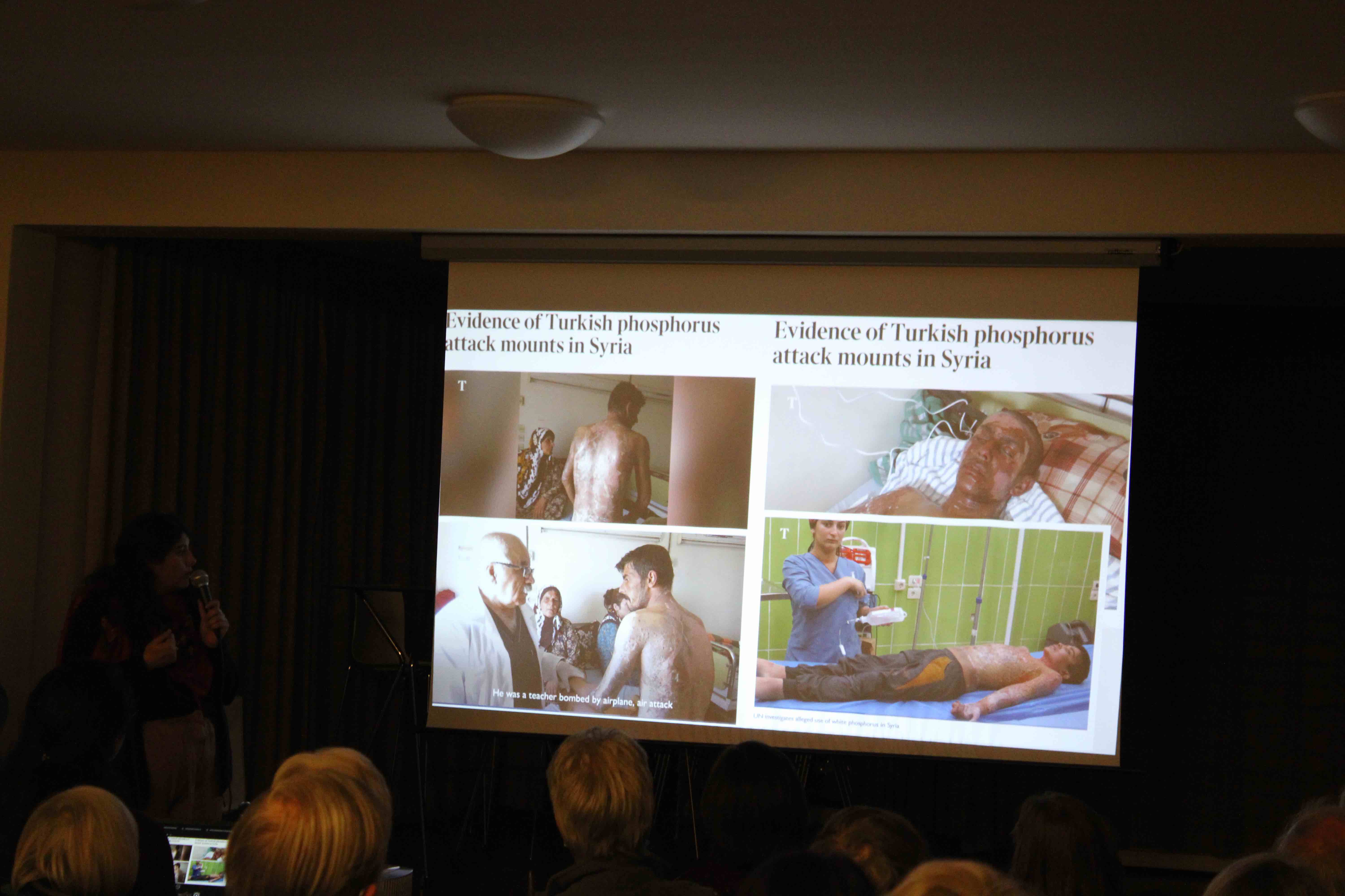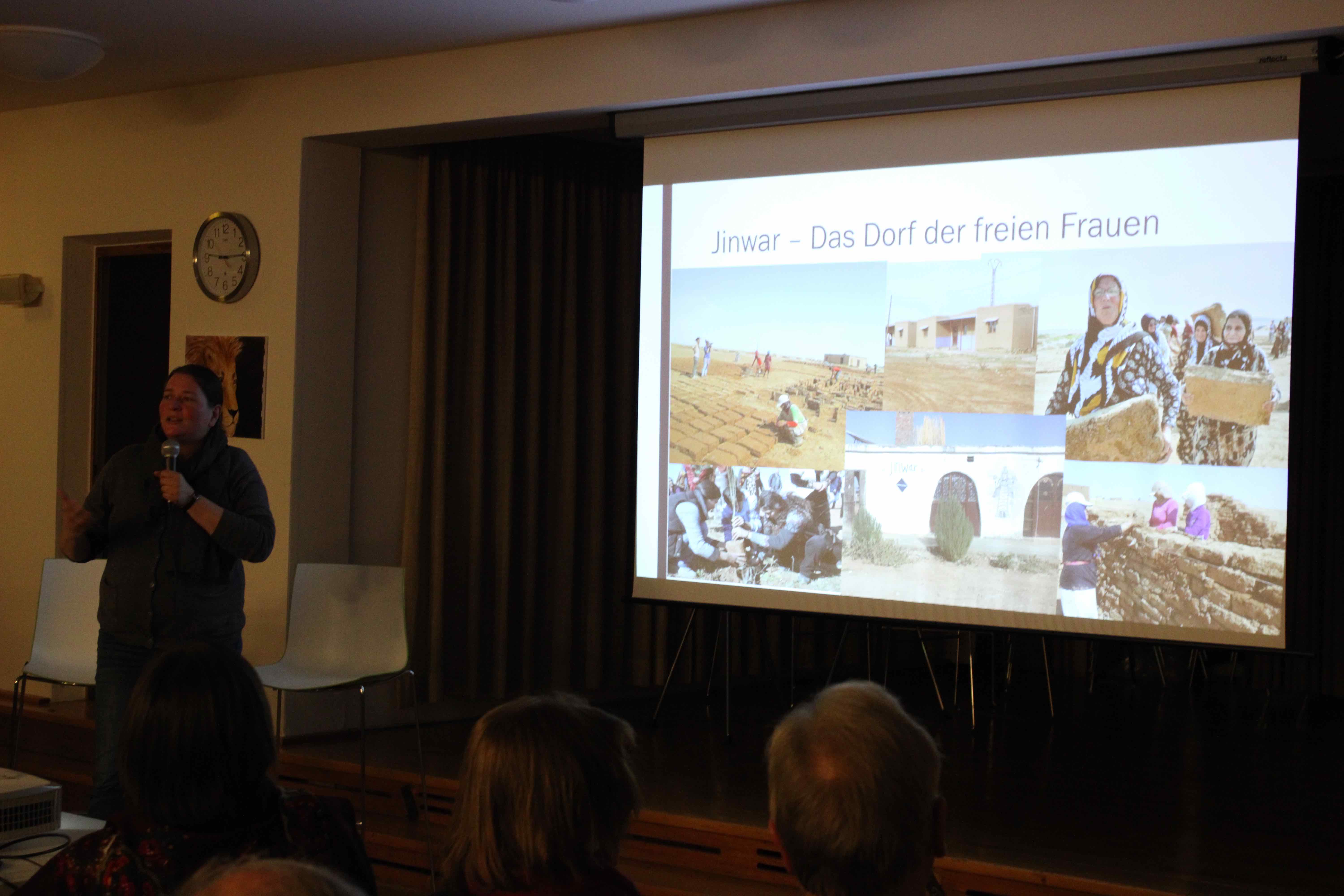 Ardından JXK adına yapılan sunumda Rojava’da uygulanan Demokratik Konfederalizm sistemine değinilirken, AB ve NATO’nun işgalci Türk devletine yaptığı silah ihracatı ve buna karşı Alman siyasi partilerinin pasifliği eleştirildi. Til Rifat’taki çocuk katliamı, Hevrîn Xelef cinayeti ve Çîçek Kobanê’ye olan saldırıya da değinen temsilci, Rojava ve Kuzey Suriye’deki savaş ve insanlık suçlarına karşı herkesin ayağa kalkması ve bu suçların işlenmesine izin verilmemesi gerektiğini belirtti. Son olarak kadın direnişi ve kazanımlarına değinen temsilci sözlerini, “Rojava’daki kadınların kazanımları, tüm kadınların kazanımlarıdır. Bu nedenle Rojava’daki kadınlara saldırı, tüm kadınlara yönelik bir saldırıdır.” şeklinde noktaladı.