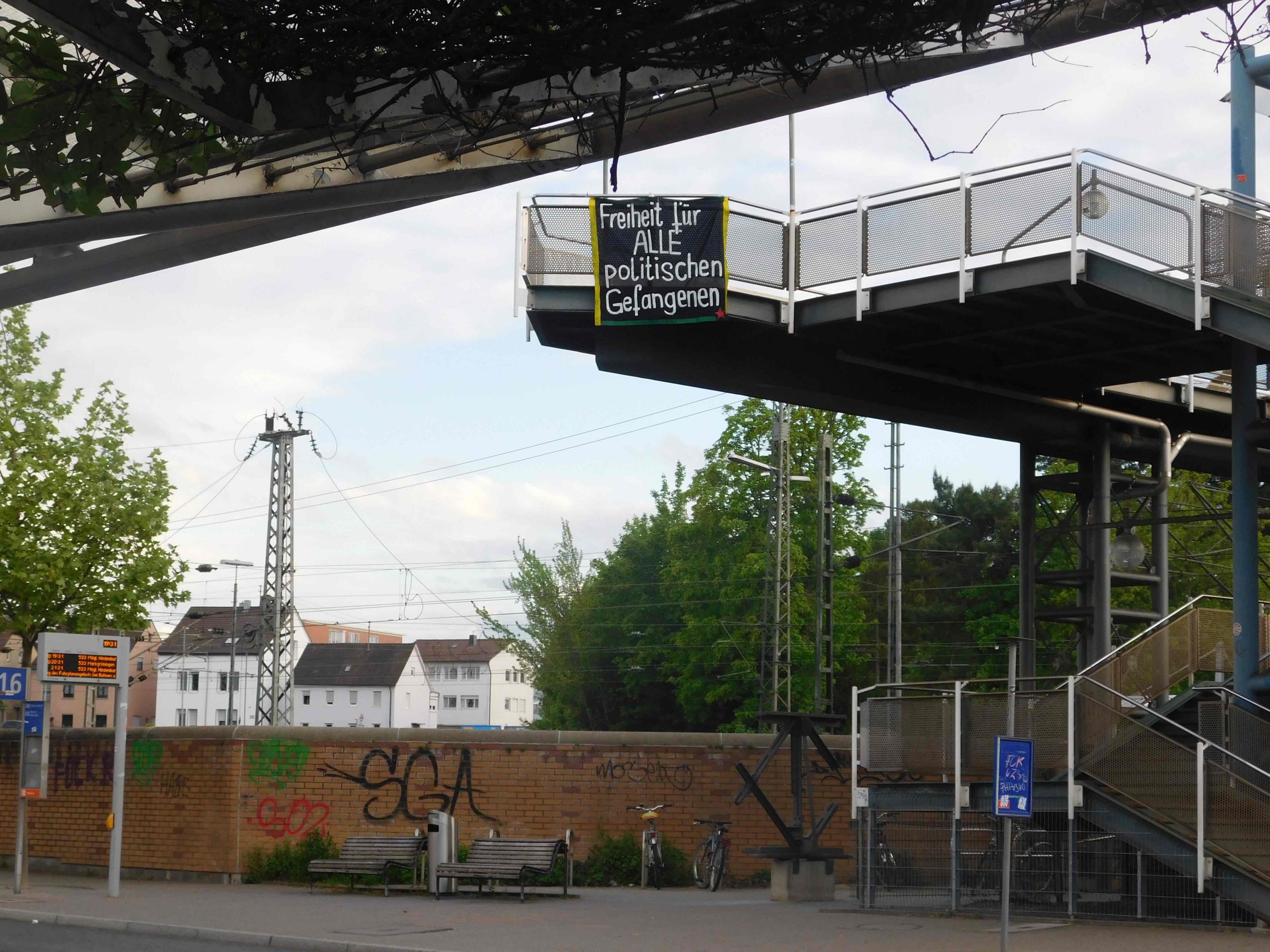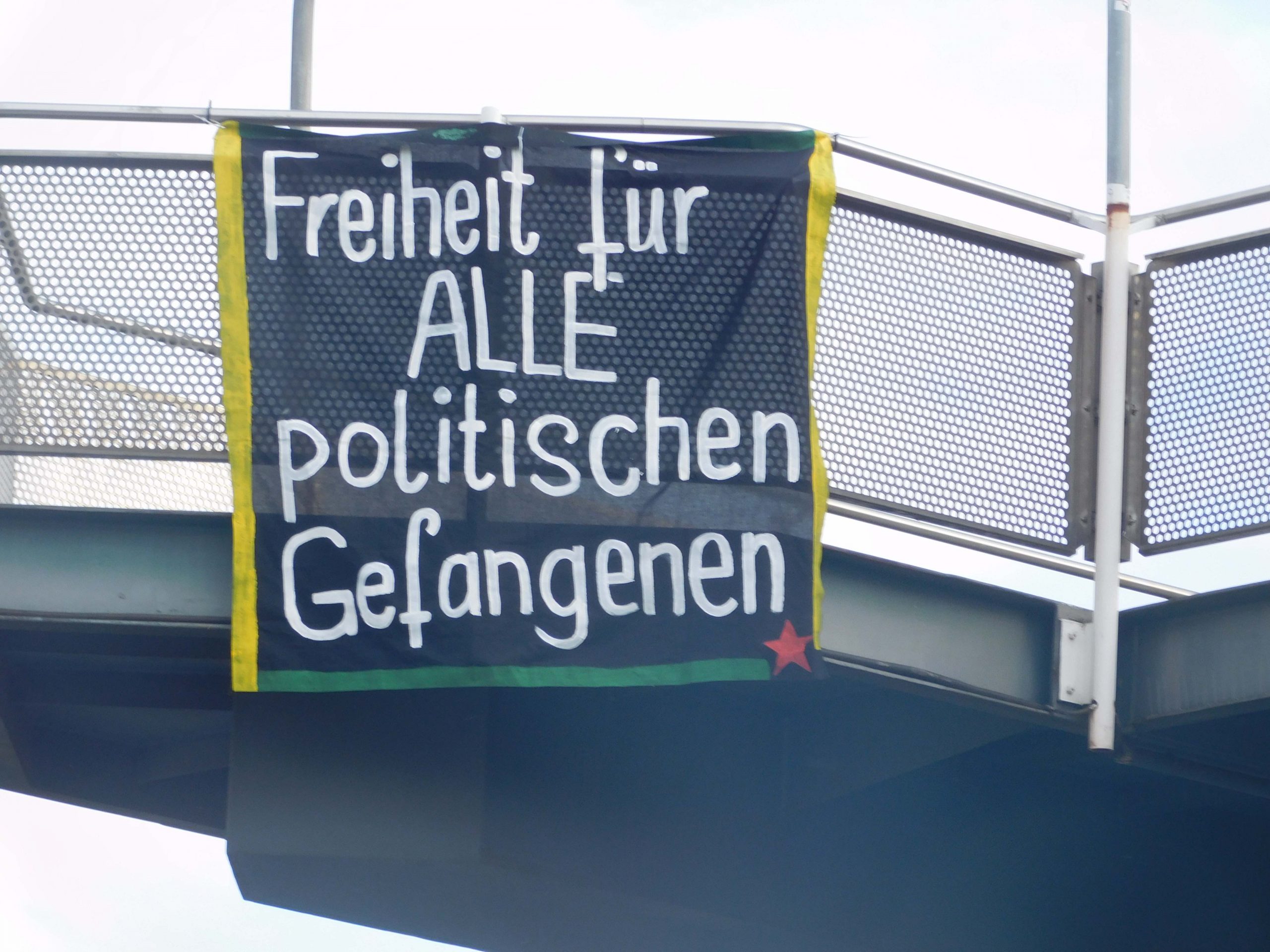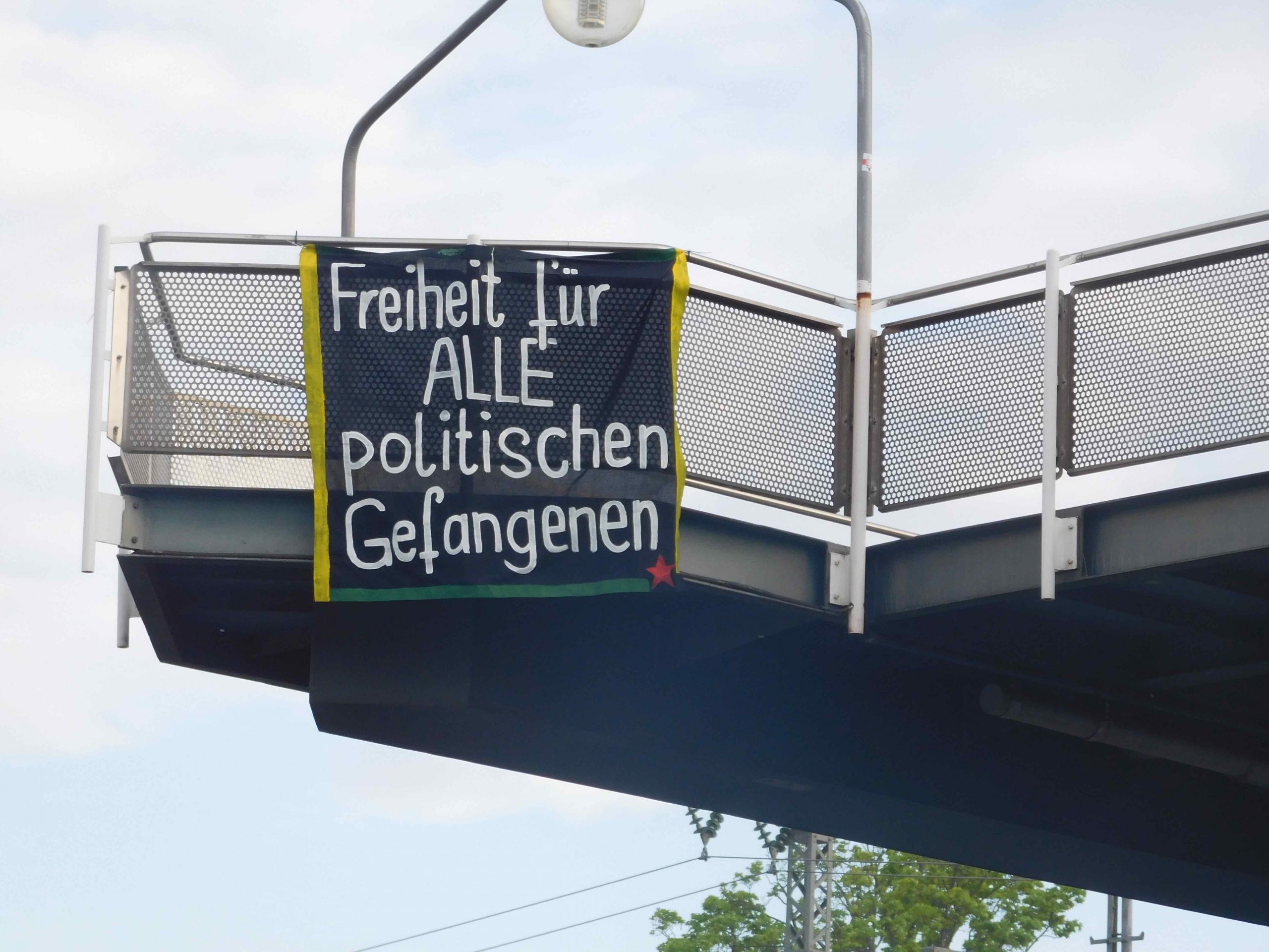 STUTTGART – Siyasi faaliyetleri ve özgür düşüncelerinden dolayı Avrupa ve Türkiye’de tutuklu bulunan siyasi tutsaklarla dayanışmak için TCŞ aktivistleri Lurdwigsburg-Stuttgart arasındaki bir köprüye pankart astı.