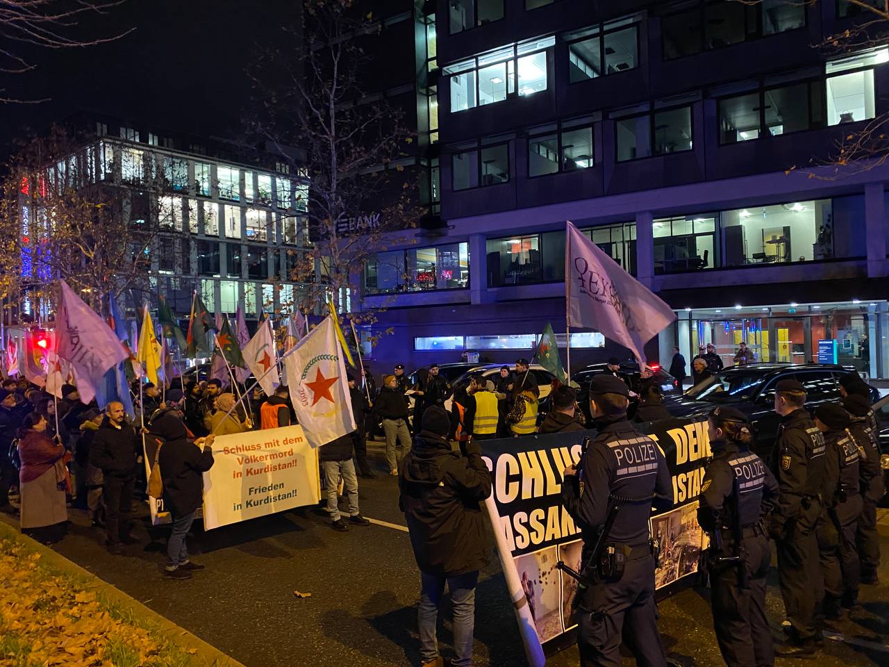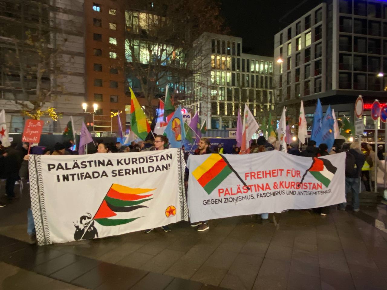 YPJ/YPG flamaları, Rojava’daki işgal saldırılarına yönelik pankartların da taşındığı yürüyüş boyunca kitle sık sık Almanca ve Kürtçe “Terörist Erdoğan”, “Bijî Berxwedane Rojava”, “Yaşasın Halkların Dayanışması” sloganlarıyla Rojava Devrimini selamladı.