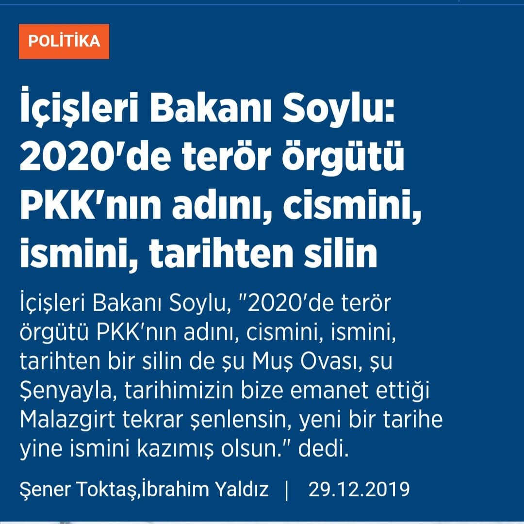 Türk İç İşleri bakanı Süleyman Soysuz 29 Aralık 2019 tarihinde Muş’ta katıldığı bir açılış töreninde yaptığı konuşmasında ”Bu, size sözümüzdür. 2020’de PKK kalmayacak” demişti. Süleyman Soysuz’un bu sözlerinin üstünden bir yıl geçmesine rağmen PKK’nin varlığını koruduğunu ve daha da güçlendiğini görmekteyiz.