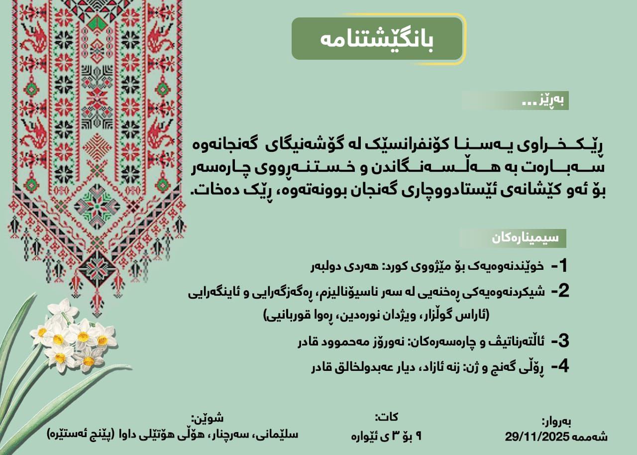 SÜLEYMANİYE – Süleymaniye’de “Örgütlü Gençlik ile Demokratik Sosyalizm Başaracak” şiarı ile gerçekleşen konferans başladı. Dawa otelde Yesna örgütü öncülüğünde gerçekleşen konferans gençlik bakış açısı ile günümüz gençliğinin yaşadığı sorunları değerlendirmek ve çözüm önerilerini sunmak amacı ile düzenlendi.