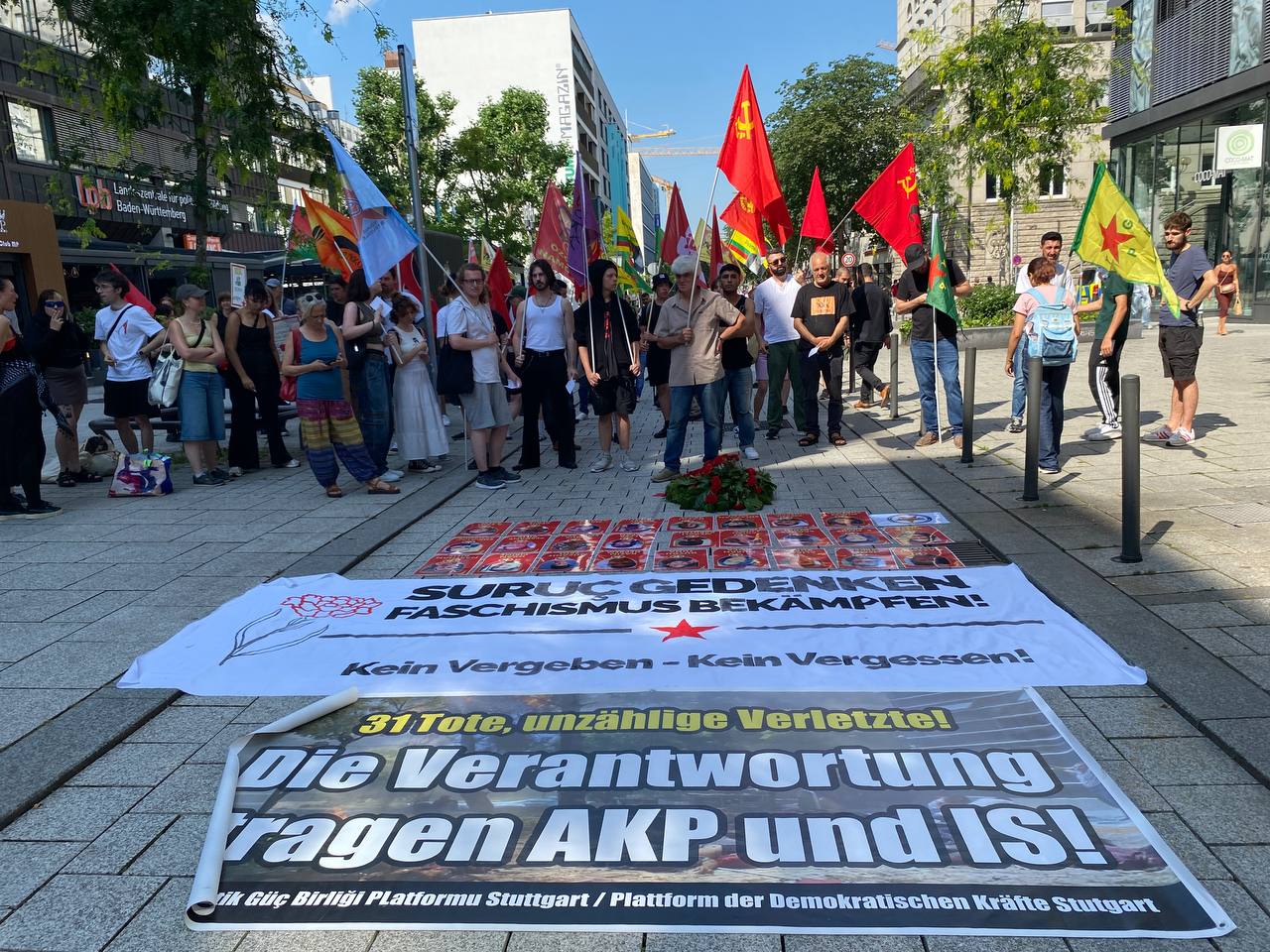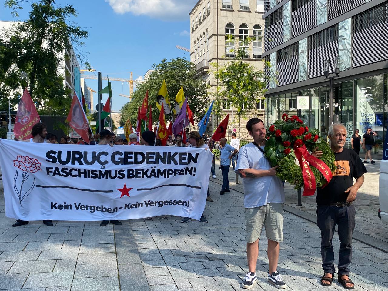 STUTTGART – Riha’nın Pirsûs (Suruç) ilçesinde AKP-MHP ve DAİŞ çetelerinin saldırısı sonucu 20 Temmuz 2015’te katledilen Sosyalist Gençlik Dernekleri Federasyonu (SGDF) üyesi 33 genç için Almanya’nın Stuttgart kentinde anma ve yürüyüş gerçekleştirildi.