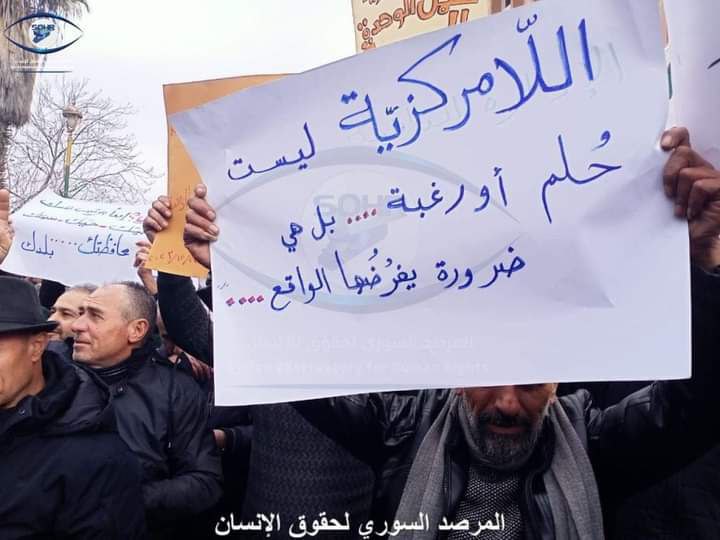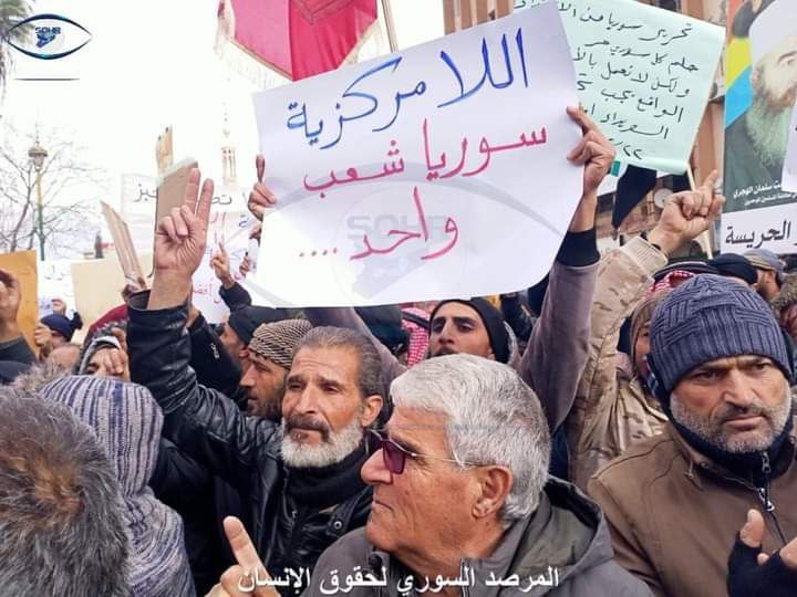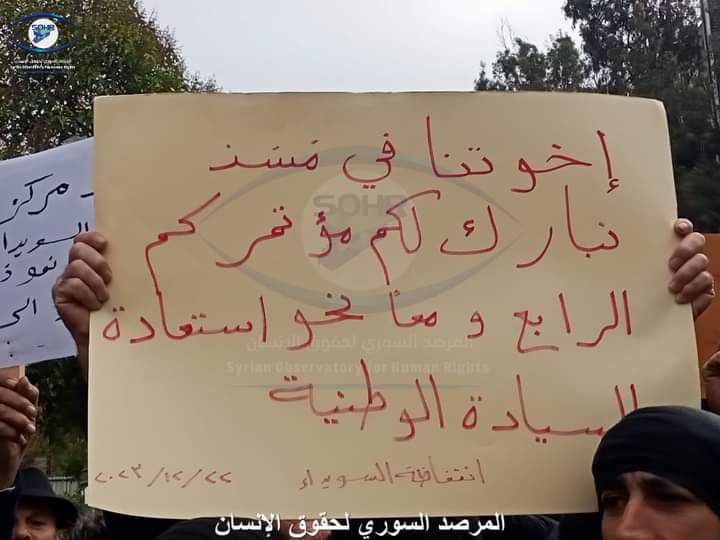 Kerame Meydanı’ndaki bir araya gelen Süveyda halkı bugün de protestolara devam ederek, BM’nin 2254 sayılı kararını uygulaması, ademi merkeziyetçi bir Suriye’nin olması ve Beşar Esad ve hükümetinin yıkılması çağrısında bulundu.