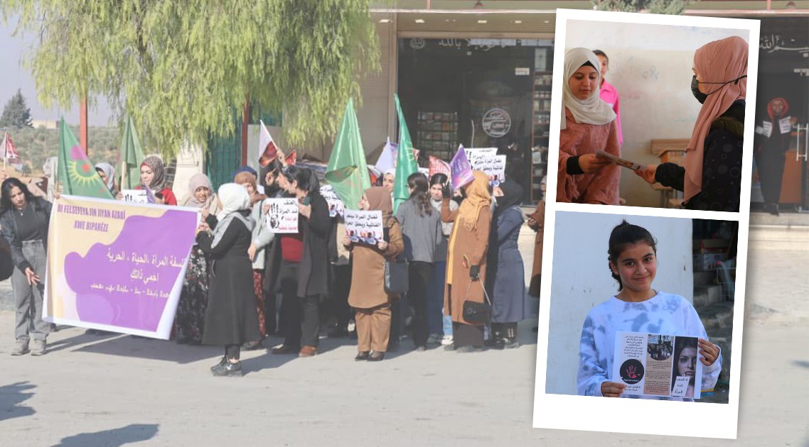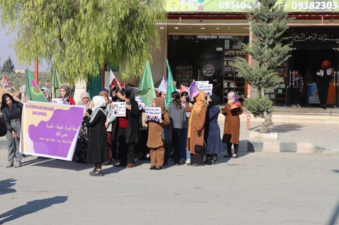 Minbic’teki Genç Kadınlar Birliği “Kadın, yaşam, özgürlük felsefesiyle kendinizi koruyun” sloganı altında etkinlikler düzenlemek üzere bir araya geldi. Genç kadınlar kadına yönelik şiddete karşı posterler bastırıp sokaklara astı. Ardından sokakta kadına yönelik şiddet ve katliamları büyük bir pankartla kınayan bir açıklama gerçekleştirdiler.