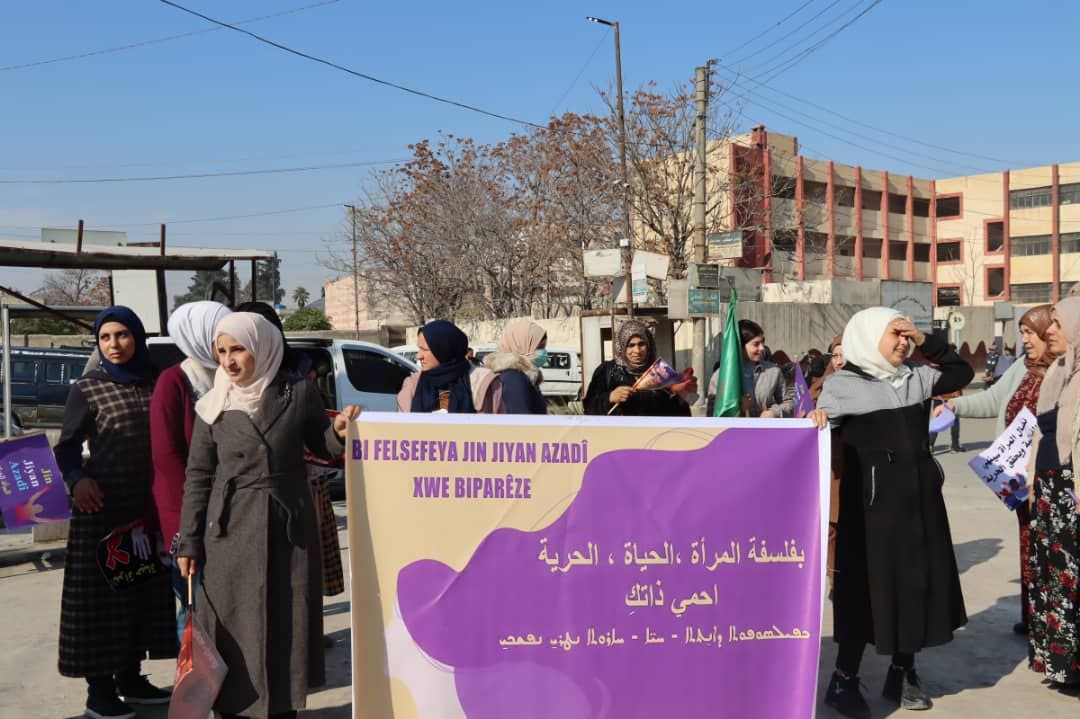 HABER MERKEZİ – Tabqa ve Minbic Genç Kadınlar Birliği, kadına yönelik şiddetle mücadele günü olan 25 Kasım dolayısıyla etkinlik düzenledi. Genç kadınlar “Jin Jiyan Azadî Serbixe Azadî” kampanyası çerçevesinde, “Kadın, yaşam, özgürlük felsefesiyle kendinizi koruyun” sloganıyla eylemlerine başladı.