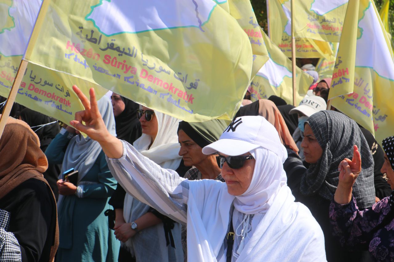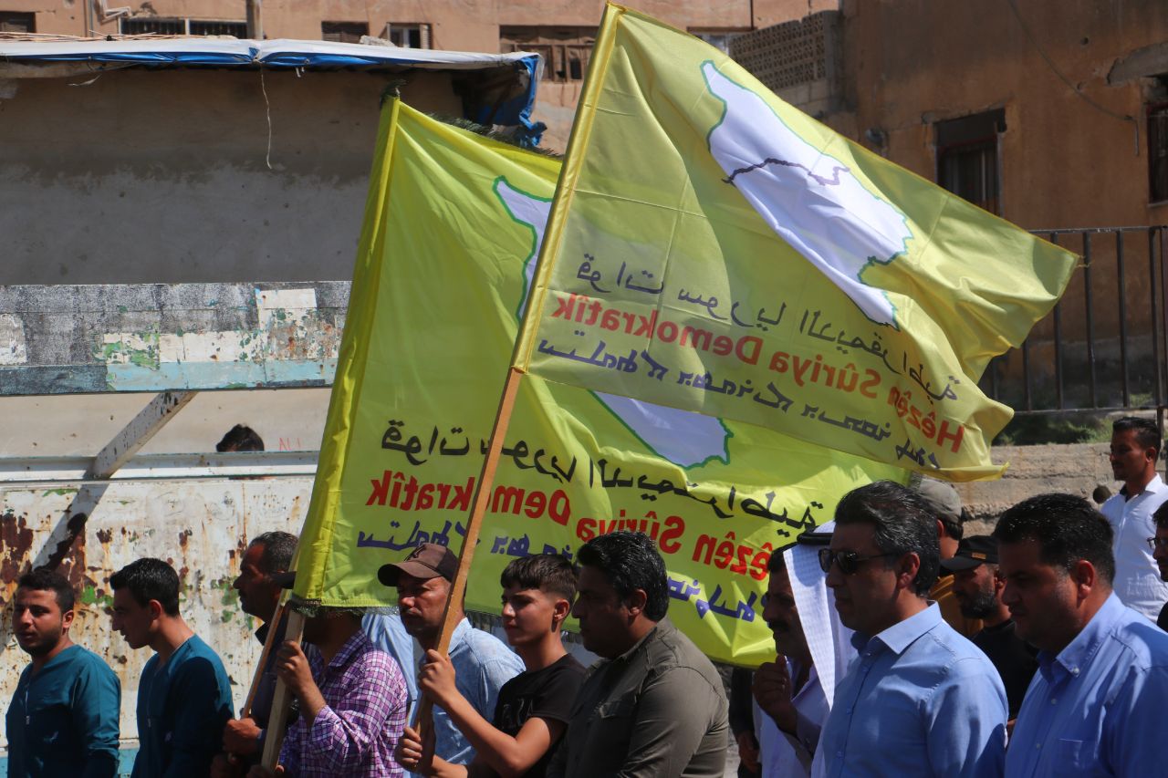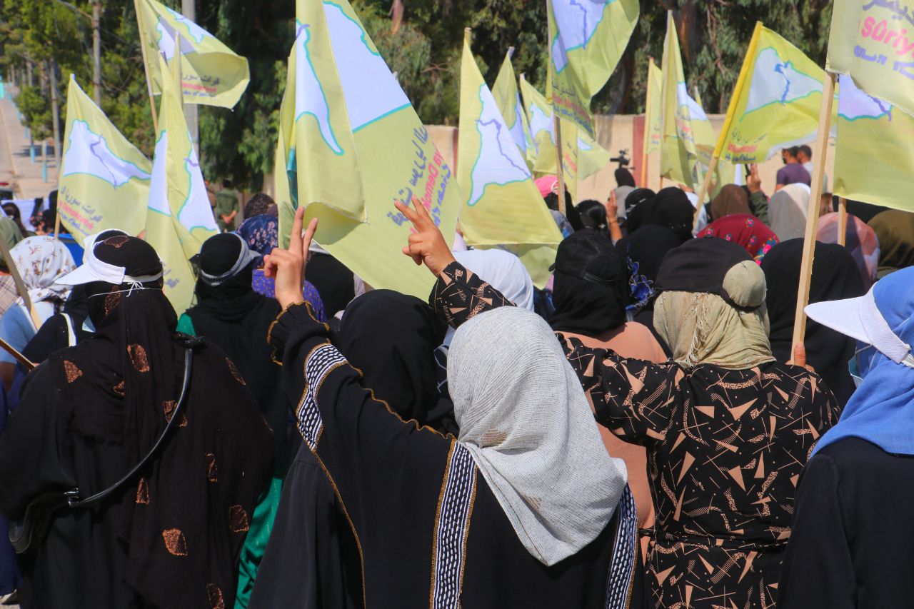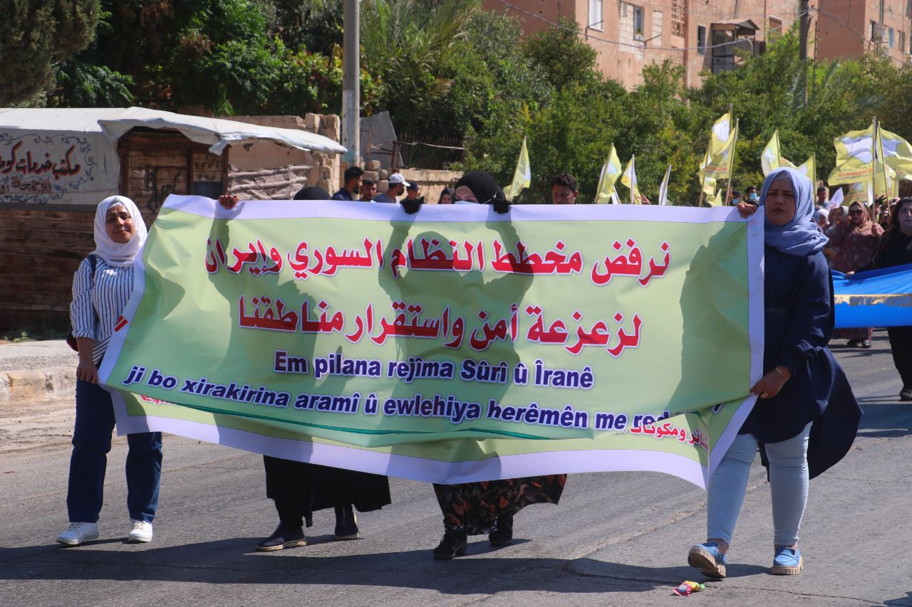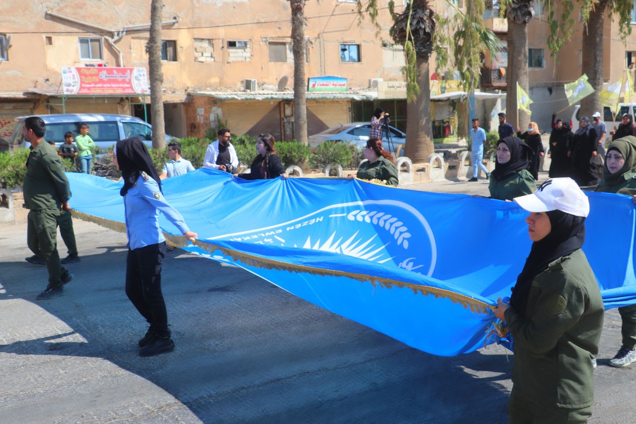 Birinci Mahalle’de başlayan yürüyüşte, QSD flamaları ve “Şam Hükümeti ve çetelerinin bölgenin güvenliğini bozmayı amaçlayan planlarını reddediyoruz” ile “Özerk Yönetim umudumuzdur… Şehitlerimizin kanı sayesinde oluşturuldu… QSD, temsilcimizdir … Bizi ve kazanımlarımızı koruyor” yazılı pankartları taşıyan yüzler, Kuzey ve Doğu Suriye’ye dönük kirli planlara karşı tepki gösterdi.