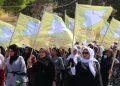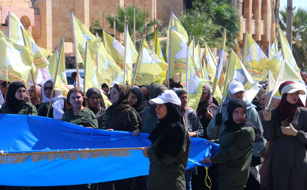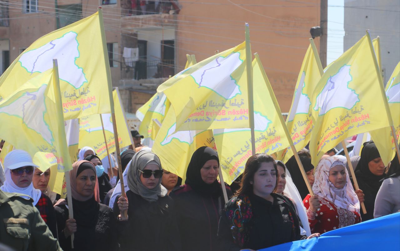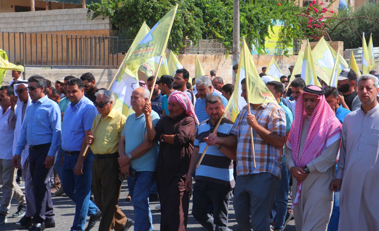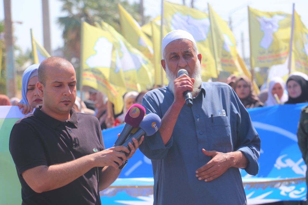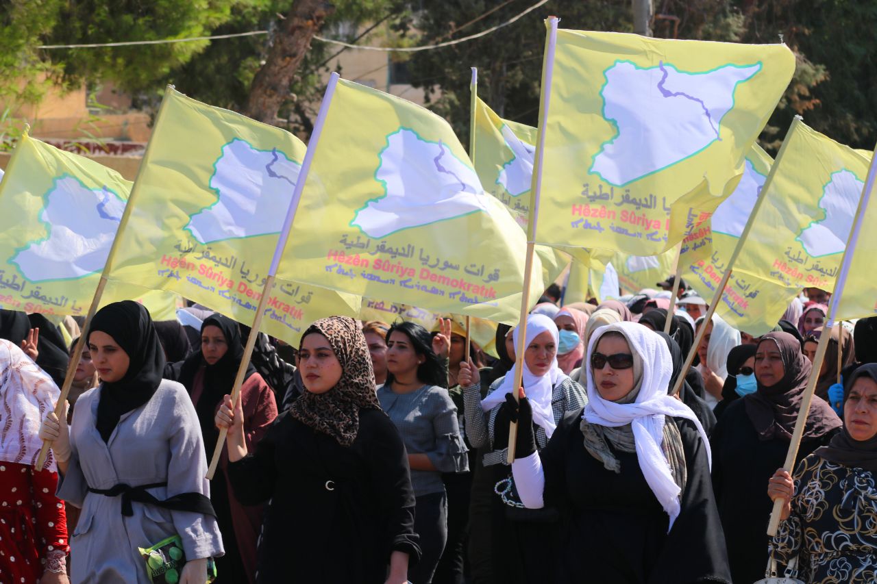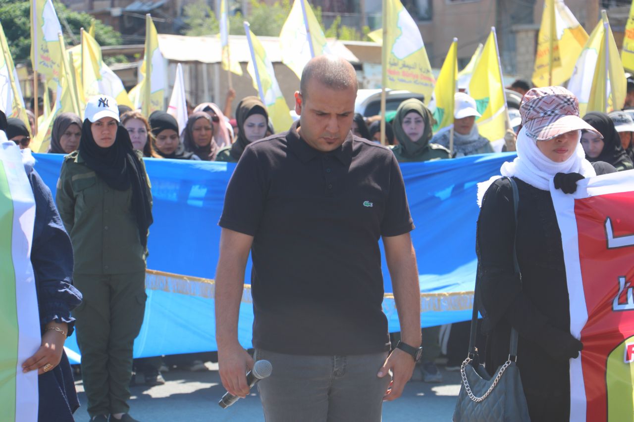 Birinci Mahalle’de başlayan yürüyüşte, QSD flamaları ve “Şam Hükümeti ve çetelerinin bölgenin güvenliğini bozmayı amaçlayan planlarını reddediyoruz” ile “Özerk Yönetim umudumuzdur… Şehitlerimizin kanı sayesinde oluşturuldu… QSD, temsilcimizdir … Bizi ve kazanımlarımızı koruyor” yazılı pankartları taşıyan yüzler, Kuzey ve Doğu Suriye’ye dönük kirli planlara karşı tepki gösterdi.