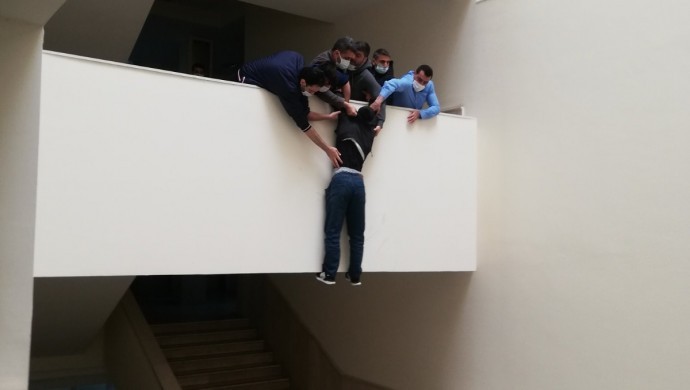 ADANA – Adana Adliyesi içerisinde ismi öğrenilemeyen bir yurttaş intihar girişiminde bulundu. Binanın iç tarafındaki merdivenlerin yanında bulunan duvarın üstüne çıkarak atlamak isteyen yurttaşı, çevredeki yurttaşlar engelledi. Çevredekiler, yurttaşın kolundan tutarak atlamasına izin vermedi.