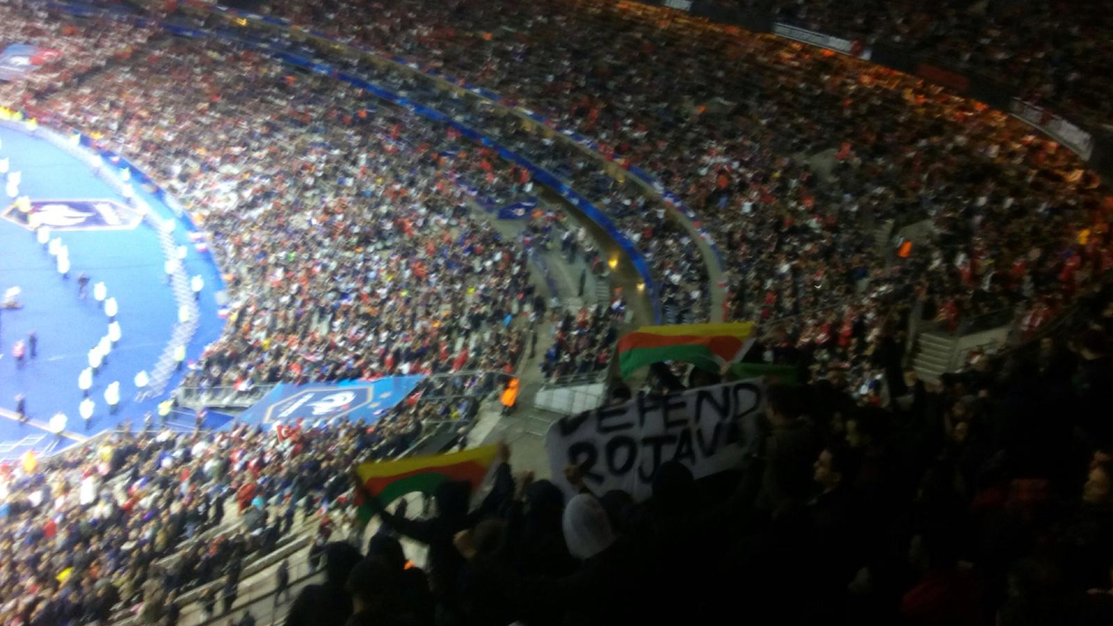 TCŞ aktivisti gençler dün Fransa ile Türkiye arasında oynanan Dünya Kupası grup elemeleri futbol maçında üzerinde İngilizce ‘Rojava’yı Savun’ yazan bir pankart açtı. Fransız TV kanallarının maç sırasında vermediği görüntülerde TEV-DEM bayrakları da açan gençler, sık sık ‘Katil Erdoğan’, ‘Terörist Türkiye’ ve ‘Bijî berxwedana Rojava’ sloganları atıyor.