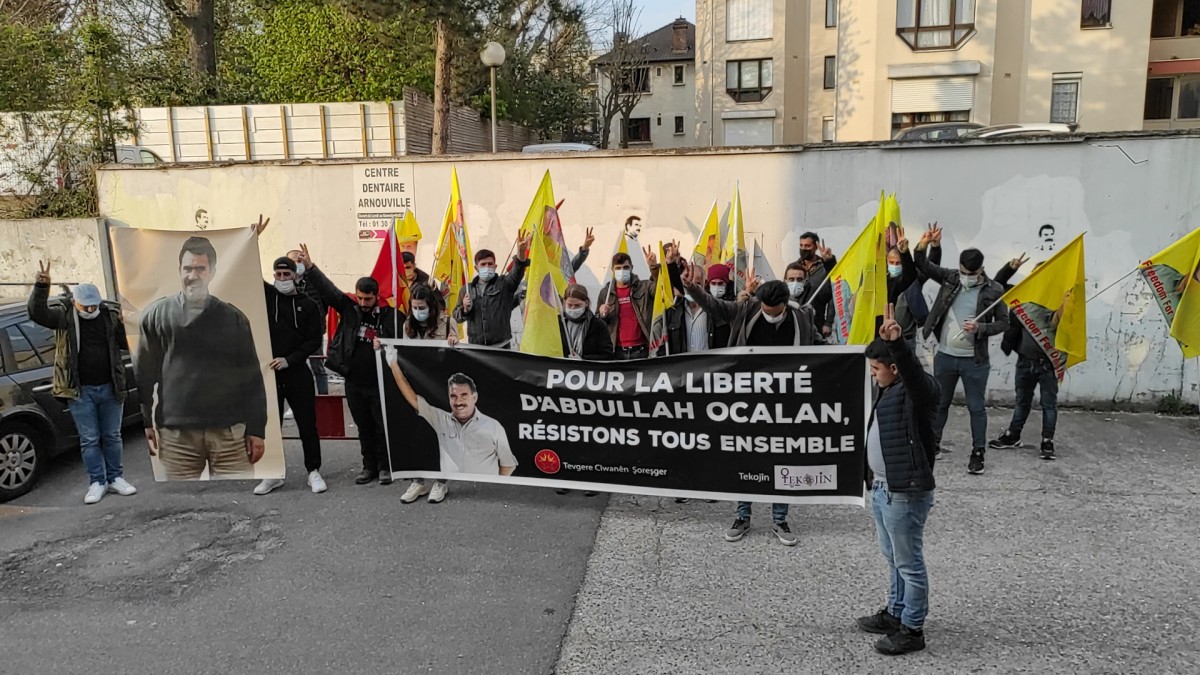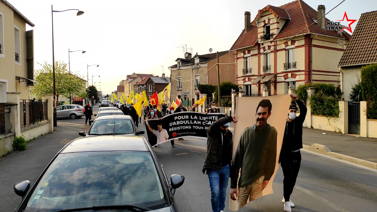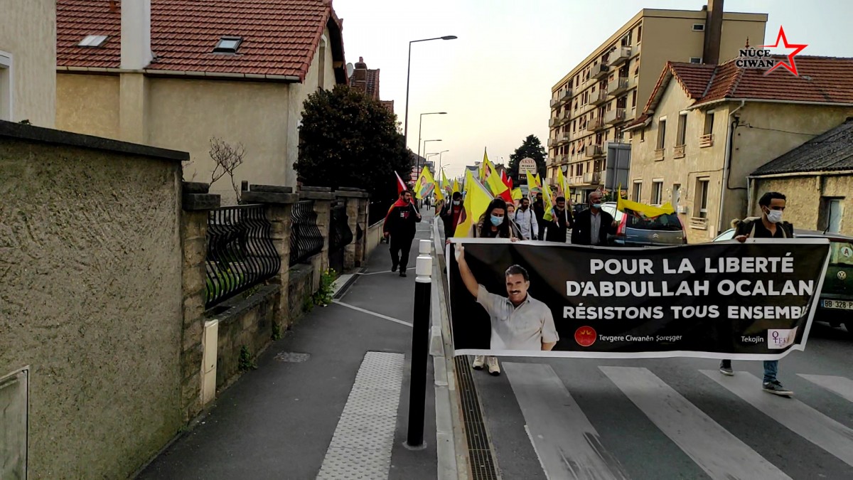 Fransızca, “Abdullah Öcalan’ın Özgürlüğü İçin Bi Hev Re Serhildan” yazılı pankart ve Önder Öcalan’ın büyük bir posterinin arkasında yürüyen gençler, Fransızca ve Kürtçe attıkları sloganlar ile Önder Öcalan’ın fiziki özgürlüğü talebini dillendirdiler. Halklar Önderi’nin posterleri ve PKK bayraklarının taşındığı yürüyüşte çevredeki halk alkış ve sloganlarla eyleme desteklerini belirttiler.
