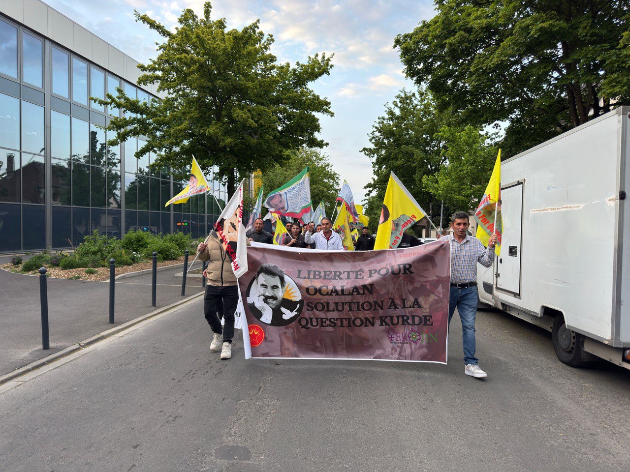 Yürüyüş esnasında sık sık “Bijî Serok APO”, “Bê Serok Jiyan Nabe”, “Jiyan Jiyan Azadî” ve Fransızca Önder APO’ya özgürlük solganları atıldı.