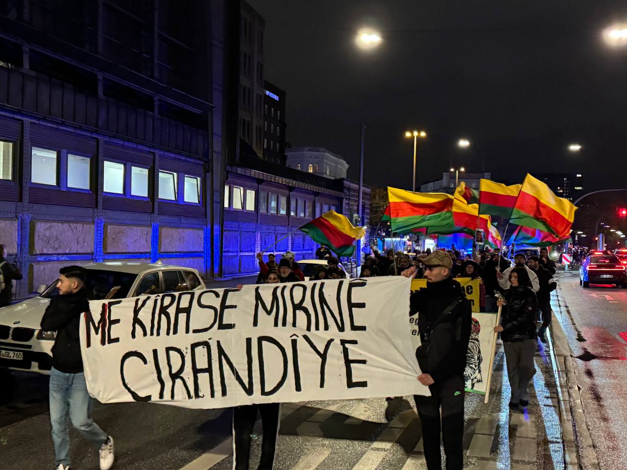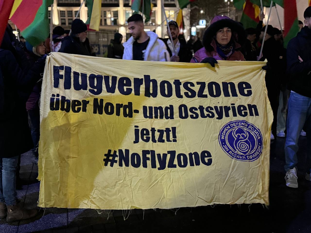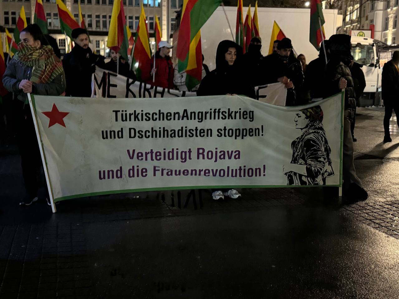 Hamburg Hochmanplatz’ da bir araya gelen gençler ve Kürdistanlılar “Suriye Demokratik Güçleri (QSD), “TürkischenAngriffskrieg und Dachihadisten stoppen! Verteidigt Rojava und die Frauenrevolution”, “Me kîrase mirine çirandiye” yazılı pankartlar açıldı.