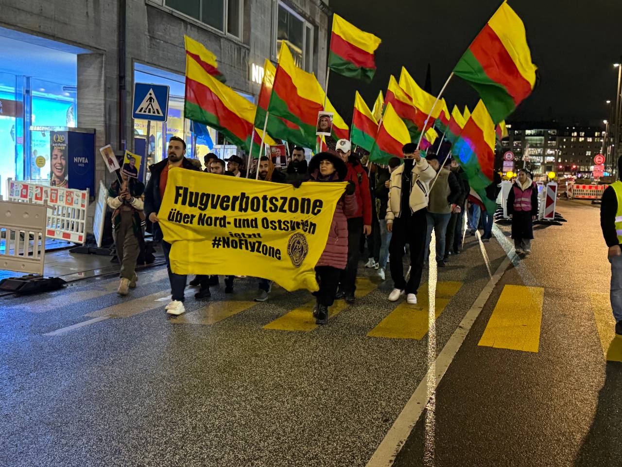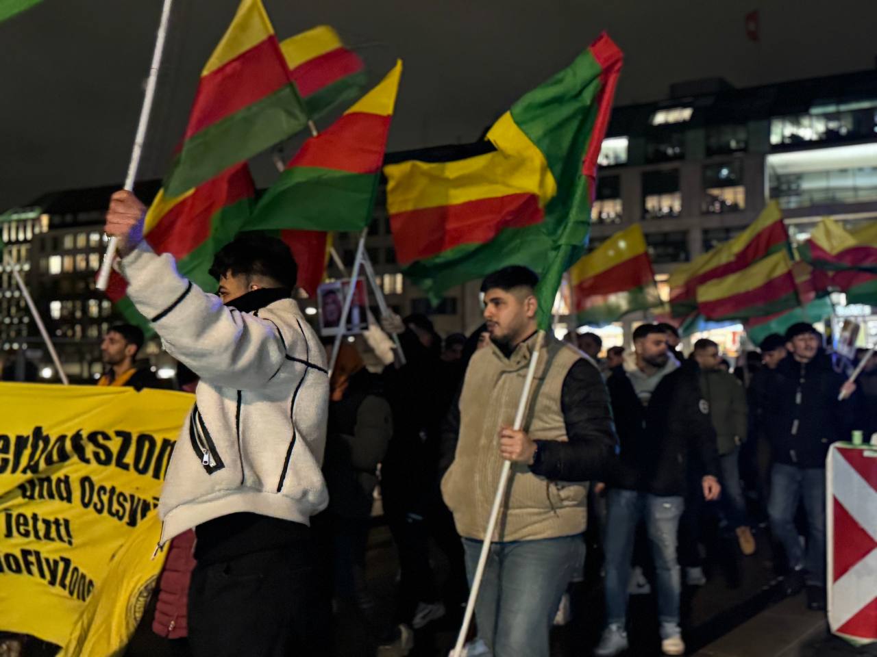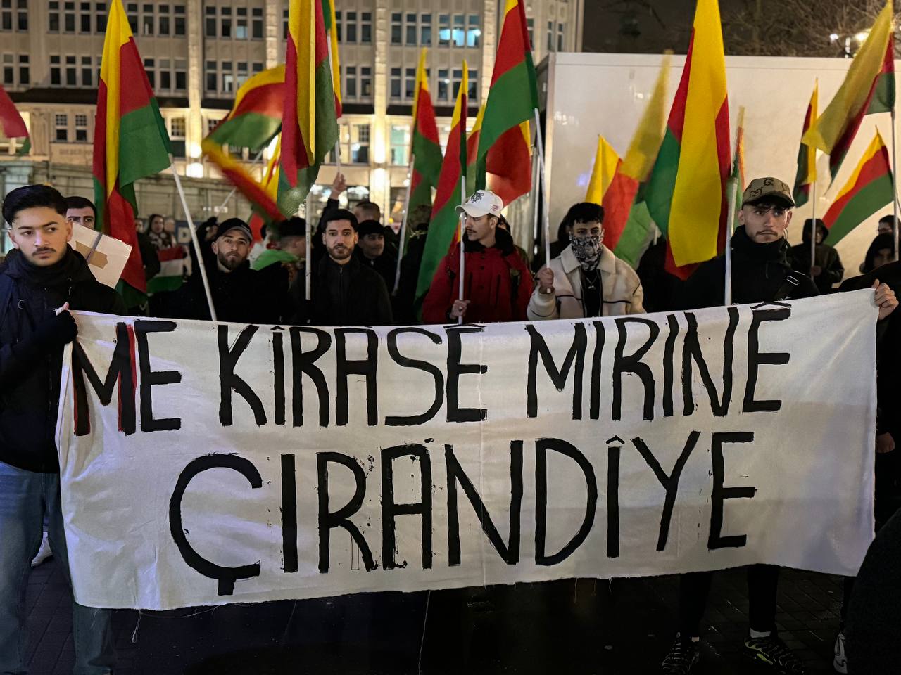 Hamburg Hochmanplatz’ da bir araya gelen gençler ve Kürdistanlılar “Suriye Demokratik Güçleri (QSD), “TürkischenAngriffskrieg und Dachihadisten stoppen! Verteidigt Rojava und die Frauenrevolution”, “Me kîrase mirine çirandiye” yazılı pankartlar açıldı.