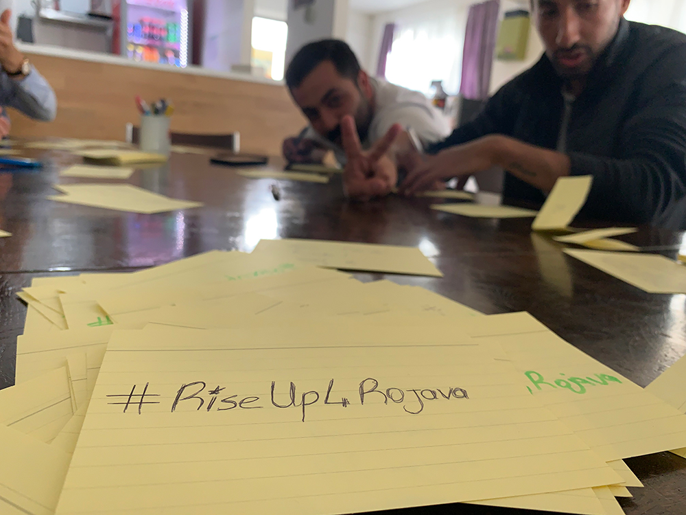 Gençler hazırladıkları kartlara Almanca “Türk devleti tarafından işgal altında olan Efrîn’de, sizlerin sessizliği insanları öldürüyor”, “İsviçre’nin Türkiye’ye sattığı silahlar ile Erdoğan’ın çeteleri katliam yapıyor. Bunun farkında mısınız?”, “Efrîn’de çocuklar ölüyor, sen buna karşı ne yapıyorsun?” yazdı. Aynı zamanda hazırlanan tüm kartların arkasına “RiseUp4Rojava” yazılarak eylem çağrısı yapıldı.