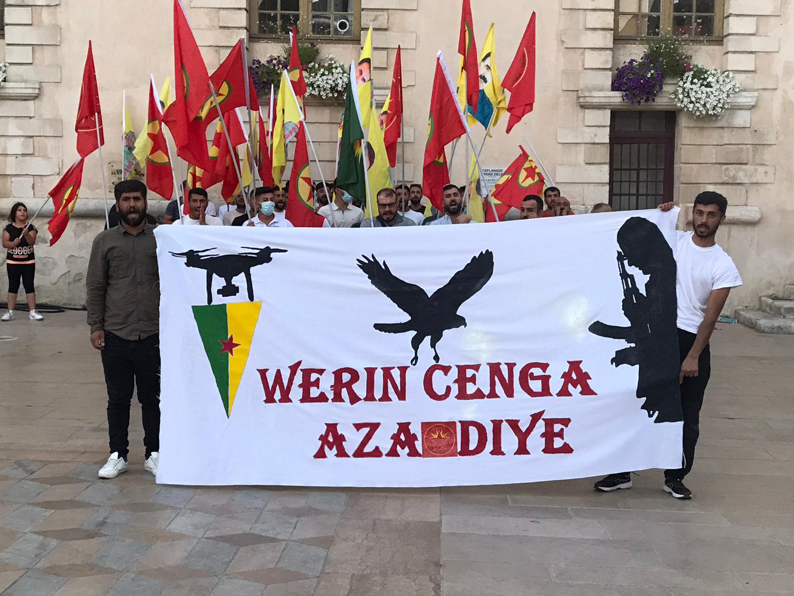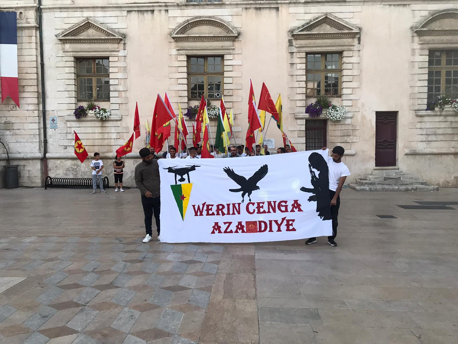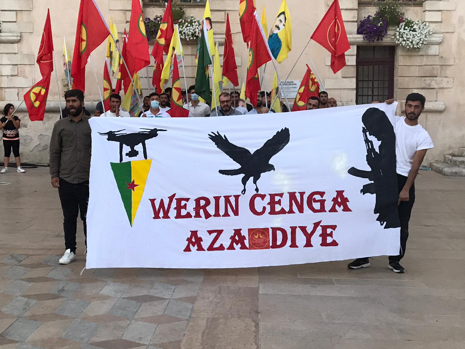 Yaklaşık 60 gencin katıldığı eylemde sık sık “Bijî Serok APO”, “Libere Öcalan” ve “Dictatuer Erdogan” sloganları atıldı. Gençler eylemde üzerinde “Werin Cenga Azadiyê” yazan bir pankart ve PKK ve Önder Öcalan’ın bayraklarını taşıdılar.