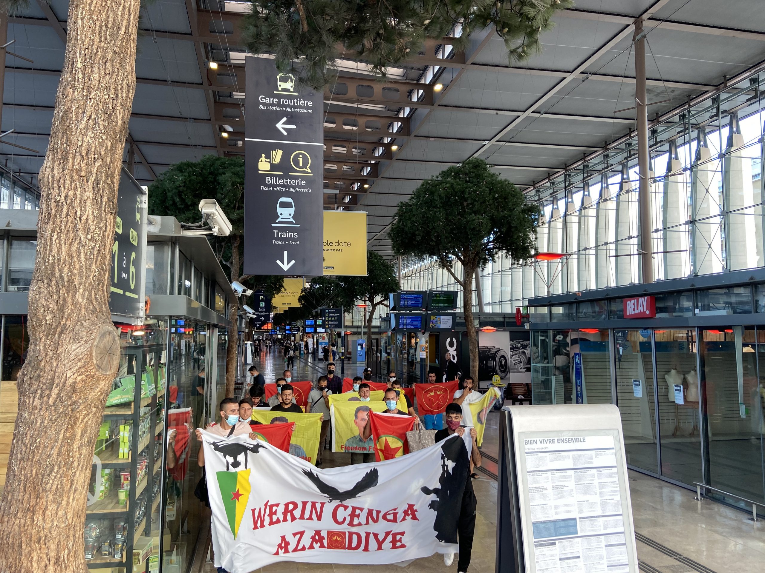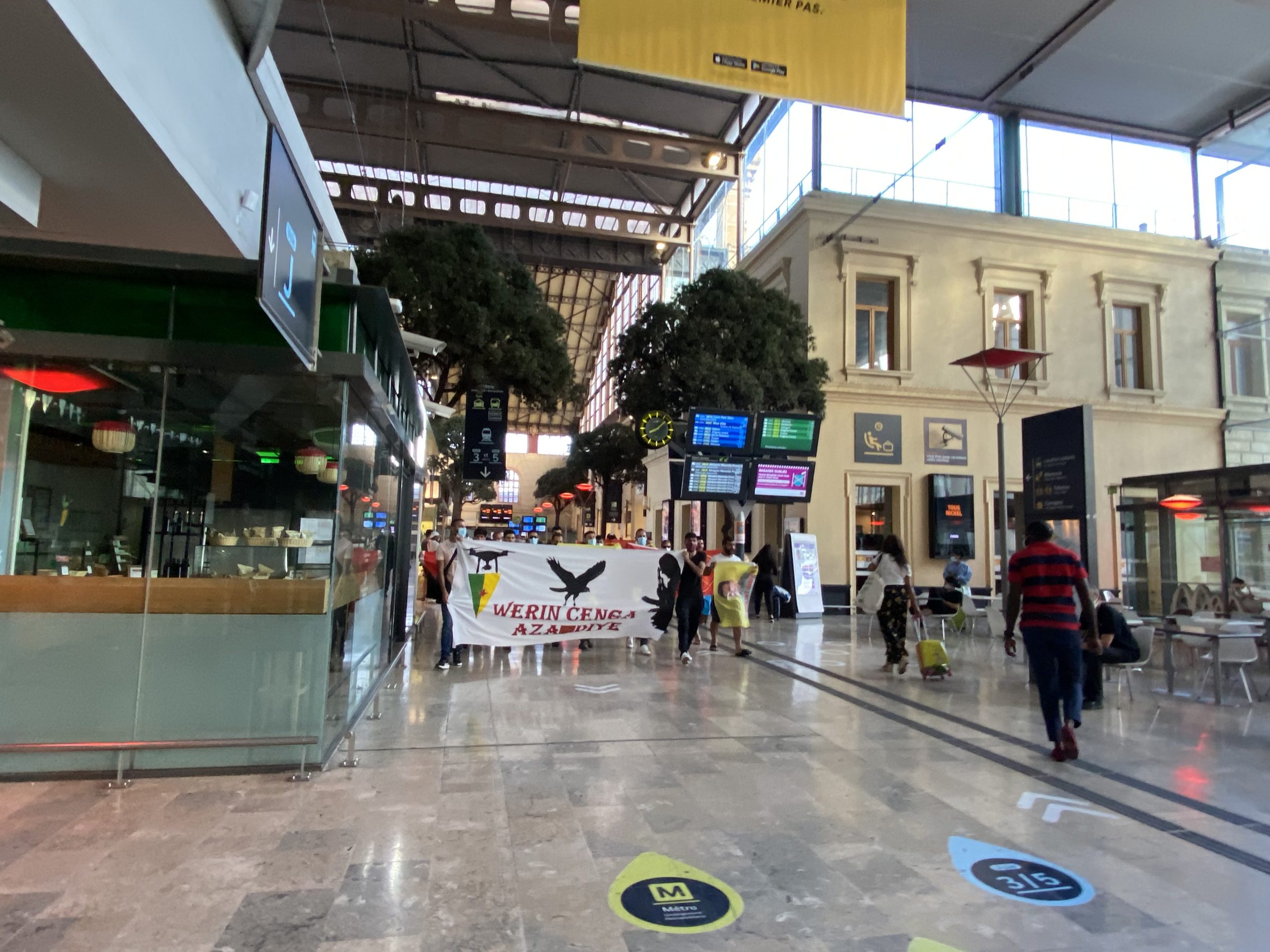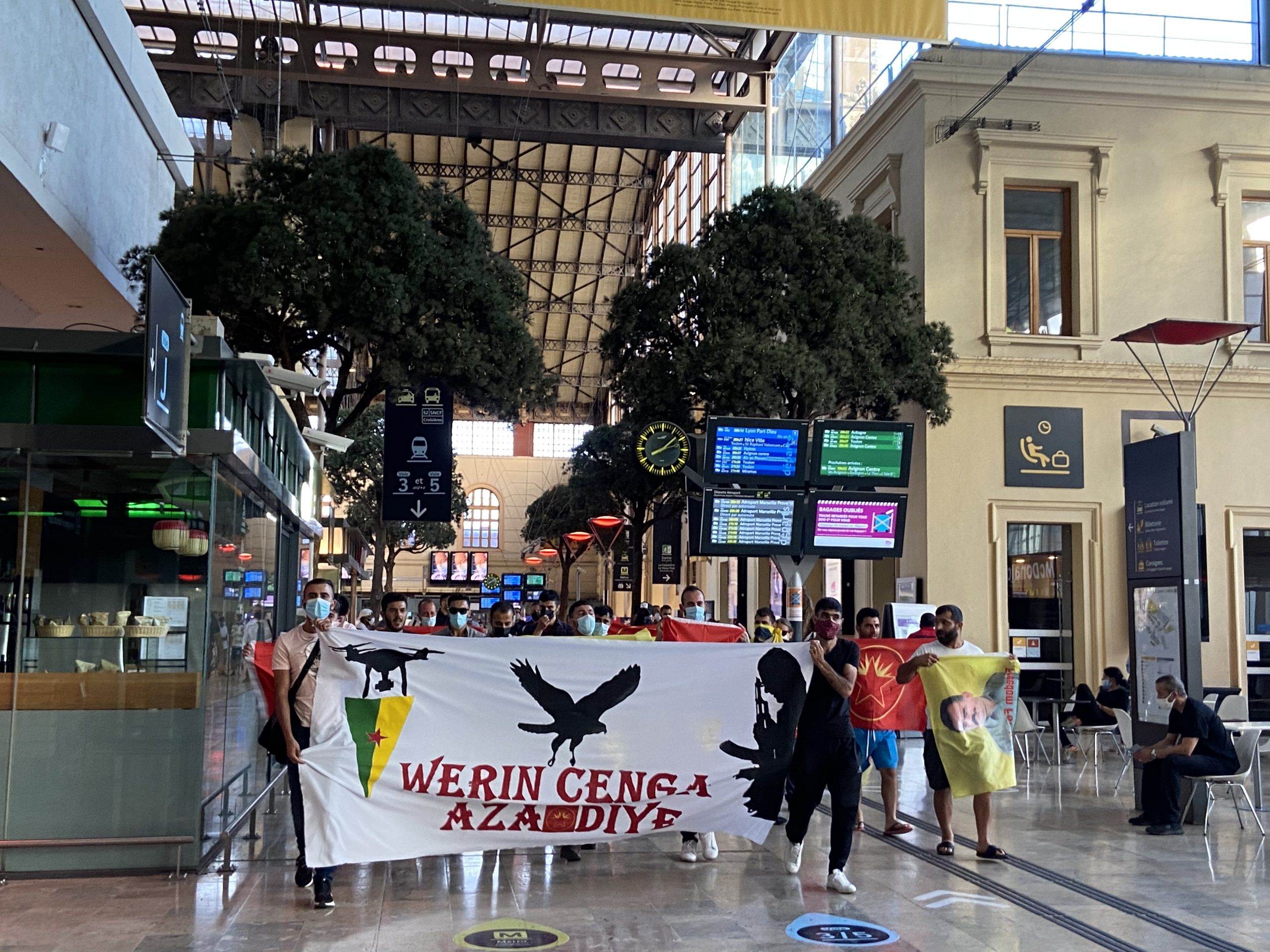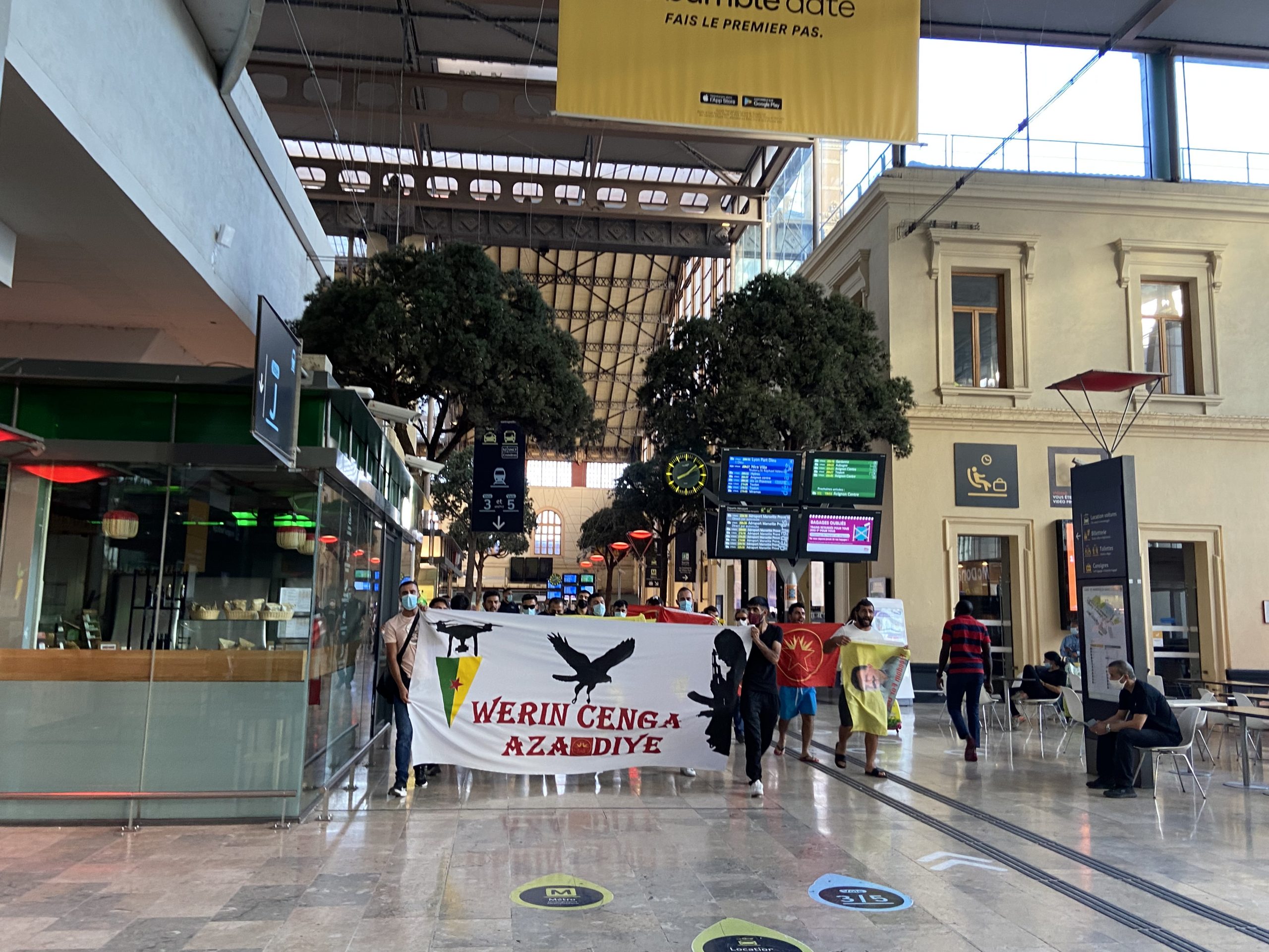 MARSİLYA – Marsilya merkezi tren istasyonunda bir sivil itaatsizlik eylemi gerçekleştiren gençler, faşist Türk devletinin soykırımcı işgal saldırılarının sona ermesini talep etti.