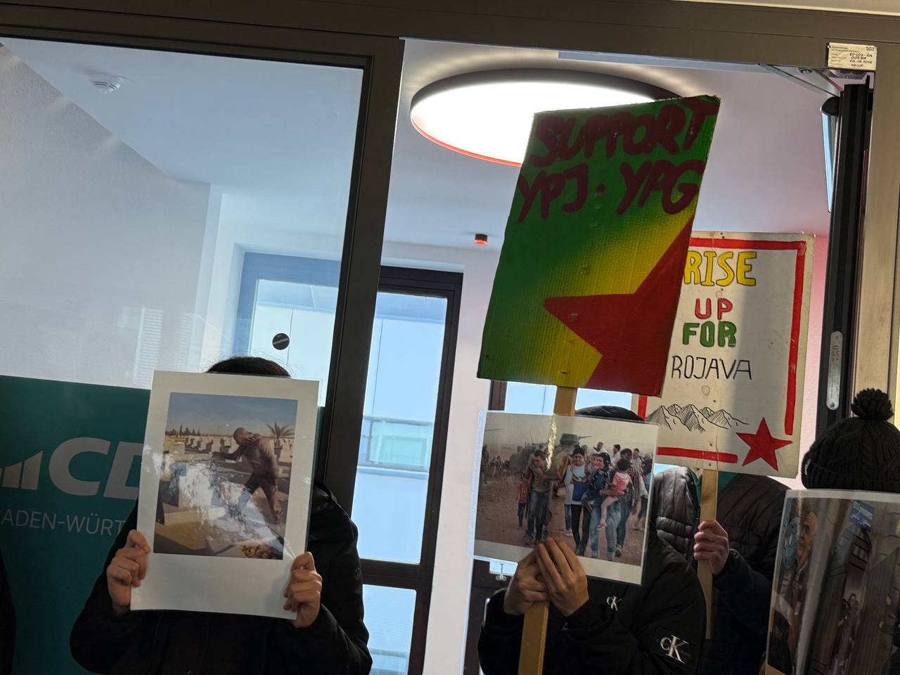 STUTTGART – Almanya’nın Baden-Vürtemberg Eyaletinin şehri olan Stuttgart’ta Tevgera Ciwanên Şoreşger (TCŞ) üyesi gençler, Rojava’da ki işgal saldırılarına dikkat çekmek amacı ile, Friedrich Merz’in başkanlığını yaptığı CDU’da (Almanya Hristiyan Demokrat Birliği) eylemdeydi.
