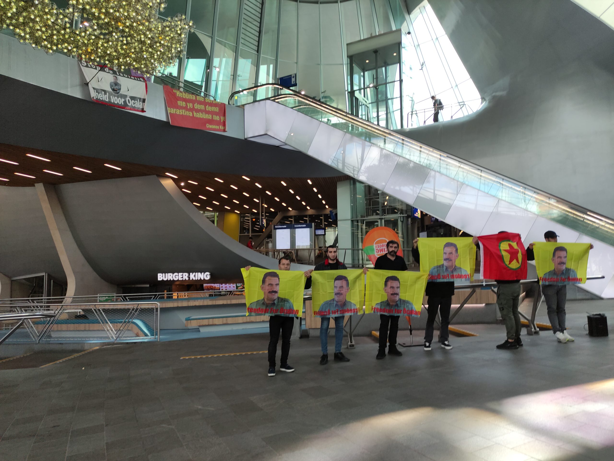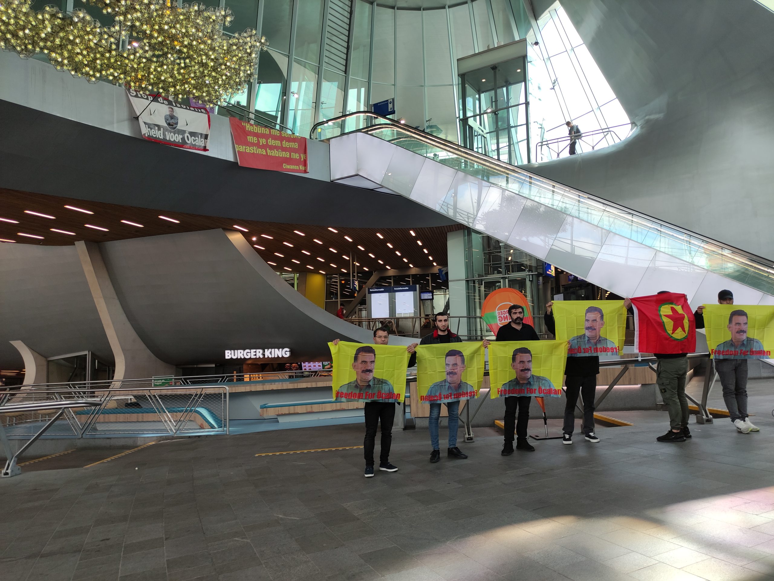 Arnhem Central’de gençler , “FREE ÖCALAN (Öcalan’a özgürlük)” yazılı pankart dahilinde PKK bayrakları da açtılar. Gençler tarafından sık sık “Be Serok jiyan nabe” ve “Bijî Serok APO” sloganları atıldı.