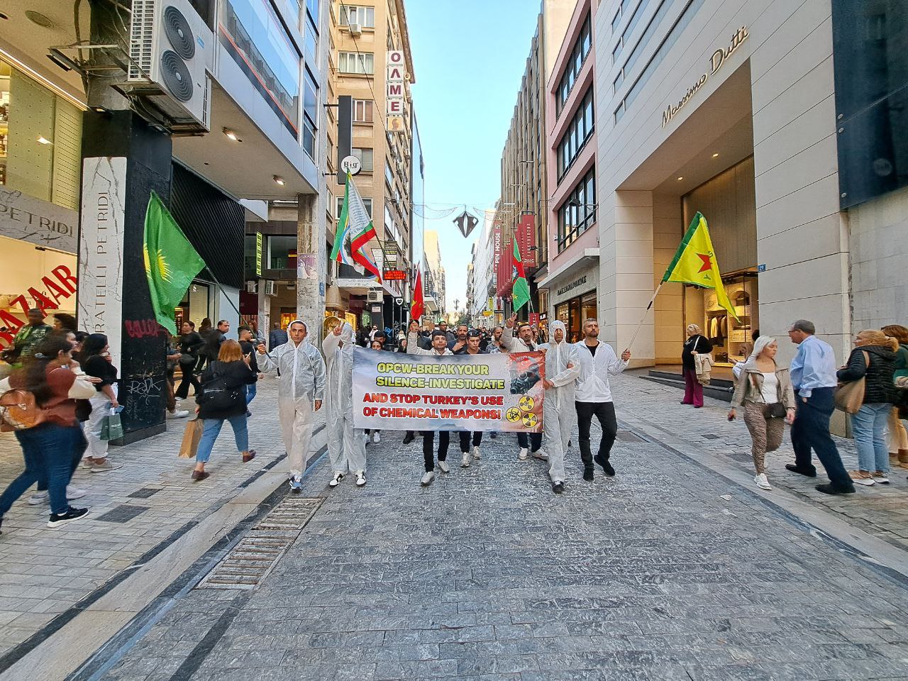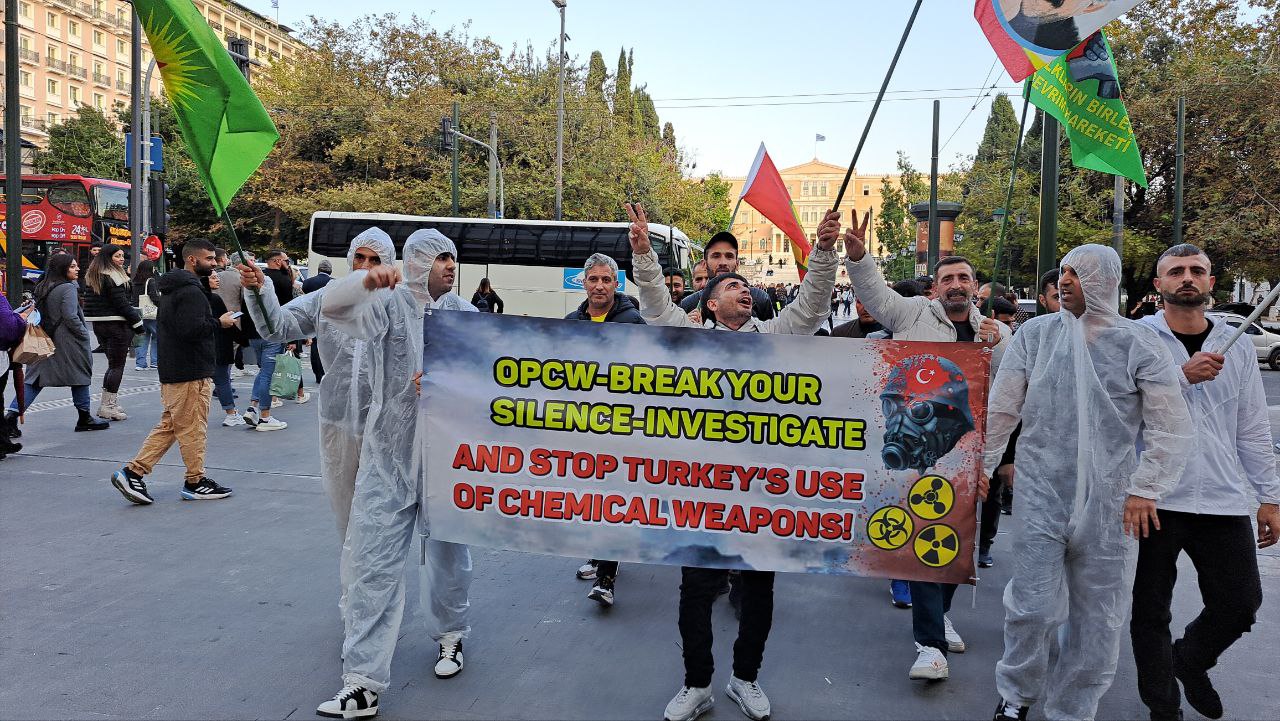 Mitinge dönüşen yürüyüşte Önder APO ve PKK bayraklarını dalgalandırdı. Gençler kimyasal silah saldırılarını anlatan bir pankartı da taşıdılar.