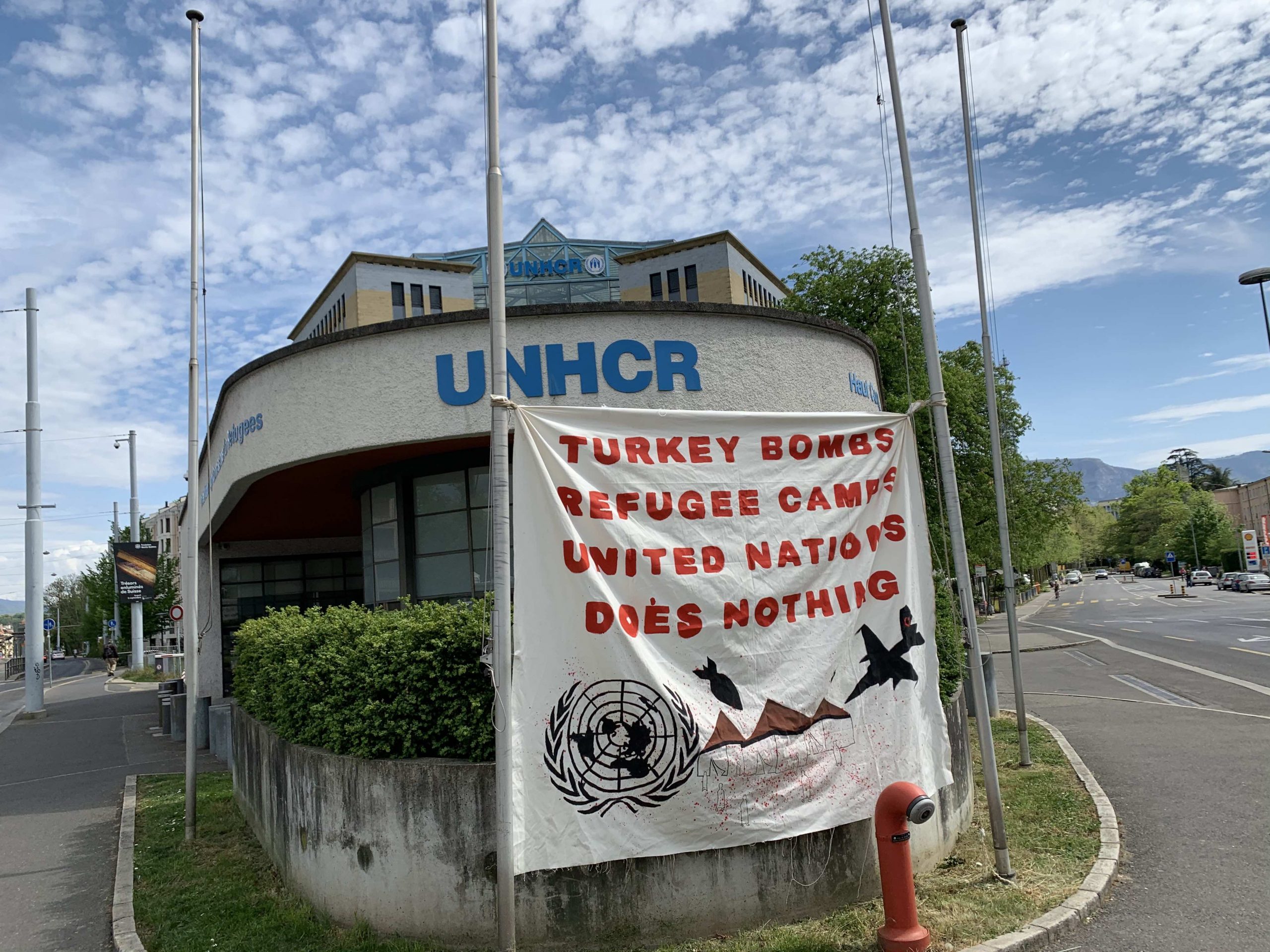 BM binası önünde üzerinde İngilizce, “Türkiye BM Mülteci kampını bombaladı” yazan bir pankart asan gençler, BM’nin faşist Türk devletinin Mexmûr mülteci kampını bombalamasına karşı sessizliği protesto etti. Pankart uzun süre bina girişinde kalırken, bina çevresinden geçen halkın dikkatini çekti.